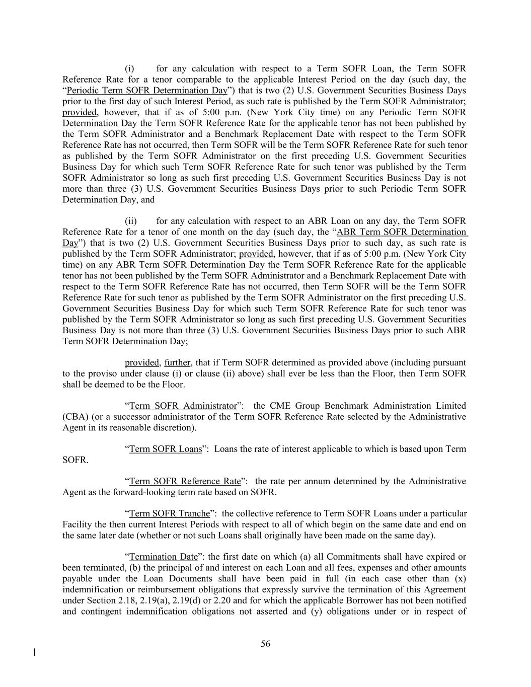 (i) for any calculation with respect to a Term SOFR Loan, the Term SOFR Reference Rate for a tenor comparable to the applicable Interest Period on the day (such day, the “Periodic Term SOFR Determination Day”) that is two (2) U.S. Government Securities Business Days prior to the first day of such Interest Period, as such rate is published by the Term SOFR Administrator; provided, however, that if as of 5:00 p.m. (New York City time) on any Periodic Term SOFR Determination Day the Term SOFR Reference Rate for the applicable tenor has not been published by the Term SOFR Administrator and a Benchmark Replacement Date with respect to the Term SOFR Reference Rate has not occurred, then Term SOFR will be the Term SOFR Reference Rate for such tenor as published by the Term SOFR Administrator on the first preceding U.S. Government Securities Business Day for which such Term SOFR Reference Rate for such tenor was published by the Term SOFR Administrator so long as such first preceding U.S. Government Securities Business Day is not more than three (3) U.S. Government Securities Business Days prior to such Periodic Term SOFR Determination Day, and (ii) for any calculation with respect to an ABR Loan on any day, the Term SOFR Reference Rate for a tenor of one month on the day (such day, the “ABR Term SOFR Determination Day”) that is two (2) U.S. Government Securities Business Days prior to such day, as such rate is published by the Term SOFR Administrator; provided, however, that if as of 5:00 p.m. (New York City time) on any ABR Term SOFR Determination Day the Term SOFR Reference Rate for the applicable tenor has not been published by the Term SOFR Administrator and a Benchmark Replacement Date with respect to the Term SOFR Reference Rate has not occurred, then Term SOFR will be the Term SOFR Reference Rate for such tenor as published by the Term SOFR Administrator on the first preceding U.S. Government Securities Business Day for which such Term SOFR Reference Rate for such tenor was published by the Term SOFR Administrator so long as such first preceding U.S. Government Securities Business Day is not more than three (3) U.S. Government Securities Business Days prior to such ABR Term SOFR Determination Day; provided, further, that if Term SOFR determined as provided above (including pursuant to the proviso under clause (i) or clause (ii) above) shall ever be less than the Floor, then Term SOFR shall be deemed to be the Floor. “Term SOFR Administrator”: the CME Group Benchmark Administration Limited (CBA) (or a successor administrator of the Term SOFR Reference Rate selected by the Administrative Agent in its reasonable discretion). “Term SOFR Loans”: Loans the rate of interest applicable to which is based upon Term SOFR. “Term SOFR Reference Rate”: the rate per annum determined by the Administrative Agent as the forward-looking term rate based on SOFR. “Term SOFR Tranche”: the collective reference to Term SOFR Loans under a particular Facility the then current Interest Periods with respect to all of which begin on the same date and end on the same later date (whether or not such Loans shall originally have been made on the same day). “Termination Date”: the first date on which (a) all Commitments shall have expired or been terminated, (b) the principal of and interest on each Loan and all fees, expenses and other amounts payable under the Loan Documents shall have been paid in full (in each case other than (x) indemnification or reimbursement obligations that expressly survive the termination of this Agreement under Section 2.18, 2.19(a), 2.19(d) or 2.20 and for which the applicable Borrower has not been notified and contingent indemnification obligations not asserted and (y) obligations under or in respect of 56