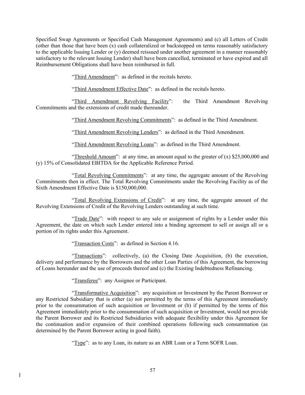 Specified Swap Agreements or Specified Cash Management Agreements) and (c) all Letters of Credit (other than those that have been (x) cash collateralized or backstopped on terms reasonably satisfactory to the applicable Issuing Lender or (y) deemed reissued under another agreement in a manner reasonably satisfactory to the relevant Issuing Lender) shall have been cancelled, terminated or have expired and all Reimbursement Obligations shall have been reimbursed in full. “Third Amendment”: as defined in the recitals hereto. “Third Amendment Effective Date”: as defined in the recitals hereto. “Third Amendment Revolving Facility”: the Third Amendment Revolving Commitments and the extensions of credit made thereunder. “Third Amendment Revolving Commitments”: as defined in the Third Amendment. “Third Amendment Revolving Lenders”: as defined in the Third Amendment. “Third Amendment Revolving Loans”: as defined in the Third Amendment. “Threshold Amount”: at any time, an amount equal to the greater of (x) $25,000,000 and (y) 15% of Consolidated EBITDA for the Applicable Reference Period. “Total Revolving Commitments”: at any time, the aggregate amount of the Revolving Commitments then in effect. The Total Revolving Commitments under the Revolving Facility as of the Sixth Amendment Effective Date is $150,000,000. “Total Revolving Extensions of Credit”: at any time, the aggregate amount of the Revolving Extensions of Credit of the Revolving Lenders outstanding at such time. “Trade Date”: with respect to any sale or assignment of rights by a Lender under this Agreement, the date on which such Lender entered into a binding agreement to sell or assign all or a portion of its rights under this Agreement. “Transaction Costs”: as defined in Section 4.16. “Transactions”: collectively, (a) the Closing Date Acquisition, (b) the execution, delivery and performance by the Borrowers and the other Loan Parties of this Agreement, the borrowing of Loans hereunder and the use of proceeds thereof and (c) the Existing Indebtedness Refinancing. “Transferee”: any Assignee or Participant. “Transformative Acquisition”: any acquisition or Investment by the Parent Borrower or any Restricted Subsidiary that is either (a) not permitted by the terms of this Agreement immediately prior to the consummation of such acquisition or Investment or (b) if permitted by the terms of this Agreement immediately prior to the consummation of such acquisition or Investment, would not provide the Parent Borrower and its Restricted Subsidiaries with adequate flexibility under this Agreement for the continuation and/or expansion of their combined operations following such consummation (as determined by the Parent Borrower acting in good faith). “Type”: as to any Loan, its nature as an ABR Loan or a Term SOFR Loan. 57
