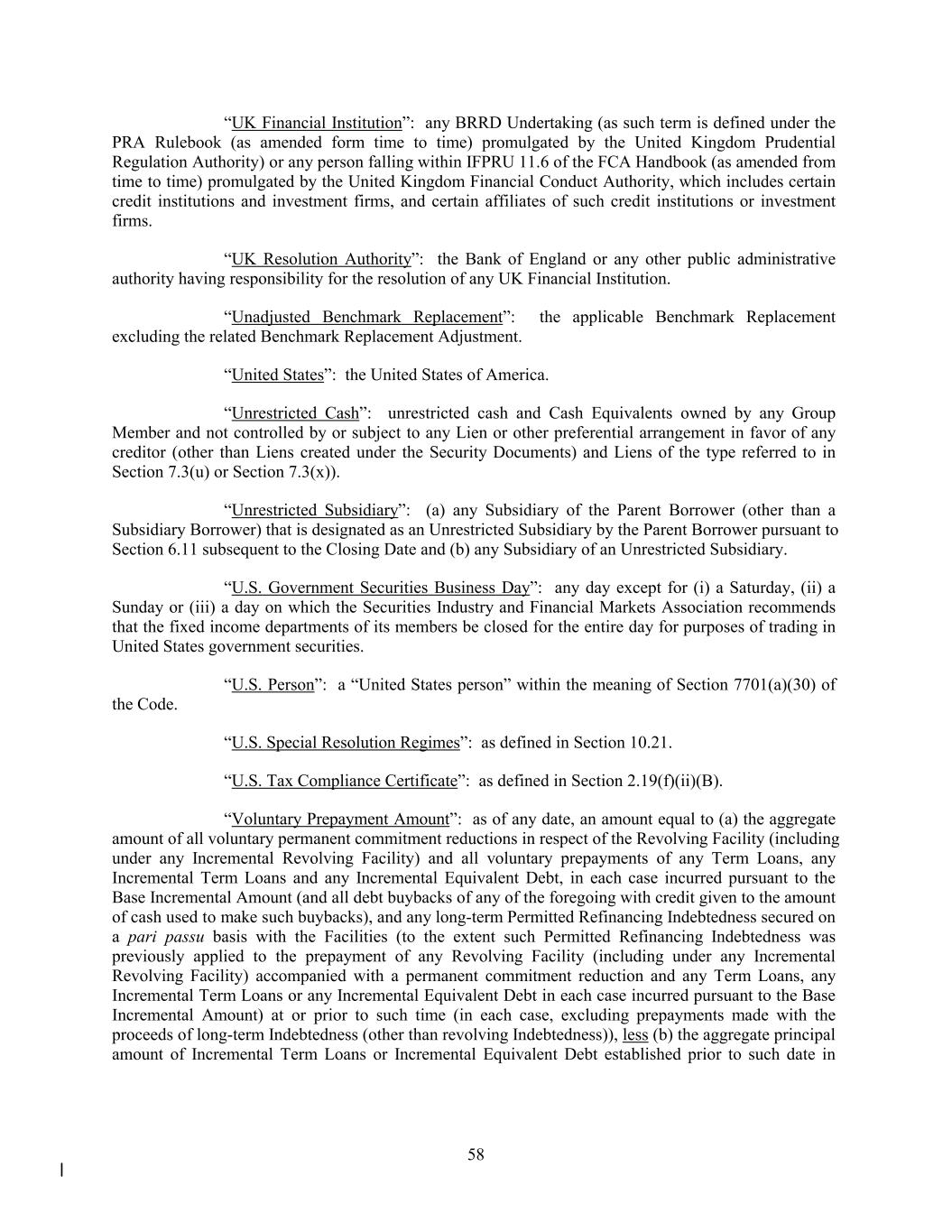 “UK Financial Institution”: any BRRD Undertaking (as such term is defined under the PRA Rulebook (as amended form time to time) promulgated by the United Kingdom Prudential Regulation Authority) or any person falling within IFPRU 11.6 of the FCA Handbook (as amended from time to time) promulgated by the United Kingdom Financial Conduct Authority, which includes certain credit institutions and investment firms, and certain affiliates of such credit institutions or investment firms. “UK Resolution Authority”: the Bank of England or any other public administrative authority having responsibility for the resolution of any UK Financial Institution. “Unadjusted Benchmark Replacement”: the applicable Benchmark Replacement excluding the related Benchmark Replacement Adjustment. “United States”: the United States of America. “Unrestricted Cash”: unrestricted cash and Cash Equivalents owned by any Group Member and not controlled by or subject to any Lien or other preferential arrangement in favor of any creditor (other than Liens created under the Security Documents) and Liens of the type referred to in Section 7.3(u) or Section 7.3(x)). “Unrestricted Subsidiary”: (a) any Subsidiary of the Parent Borrower (other than a Subsidiary Borrower) that is designated as an Unrestricted Subsidiary by the Parent Borrower pursuant to Section 6.11 subsequent to the Closing Date and (b) any Subsidiary of an Unrestricted Subsidiary. “U.S. Government Securities Business Day”: any day except for (i) a Saturday, (ii) a Sunday or (iii) a day on which the Securities Industry and Financial Markets Association recommends that the fixed income departments of its members be closed for the entire day for purposes of trading in United States government securities. “U.S. Person”: a “United States person” within the meaning of Section 7701(a)(30) of the Code. “U.S. Special Resolution Regimes”: as defined in Section 10.21. “U.S. Tax Compliance Certificate”: as defined in Section 2.19(f)(ii)(B). “Voluntary Prepayment Amount”: as of any date, an amount equal to (a) the aggregate amount of all voluntary permanent commitment reductions in respect of the Revolving Facility (including under any Incremental Revolving Facility) and all voluntary prepayments of any Term Loans, any Incremental Term Loans and any Incremental Equivalent Debt, in each case incurred pursuant to the Base Incremental Amount (and all debt buybacks of any of the foregoing with credit given to the amount of cash used to make such buybacks), and any long-term Permitted Refinancing Indebtedness secured on a pari passu basis with the Facilities (to the extent such Permitted Refinancing Indebtedness was previously applied to the prepayment of any Revolving Facility (including under any Incremental Revolving Facility) accompanied with a permanent commitment reduction and any Term Loans, any Incremental Term Loans or any Incremental Equivalent Debt in each case incurred pursuant to the Base Incremental Amount) at or prior to such time (in each case, excluding prepayments made with the proceeds of long-term Indebtedness (other than revolving Indebtedness)), less (b) the aggregate principal amount of Incremental Term Loans or Incremental Equivalent Debt established prior to such date in 58