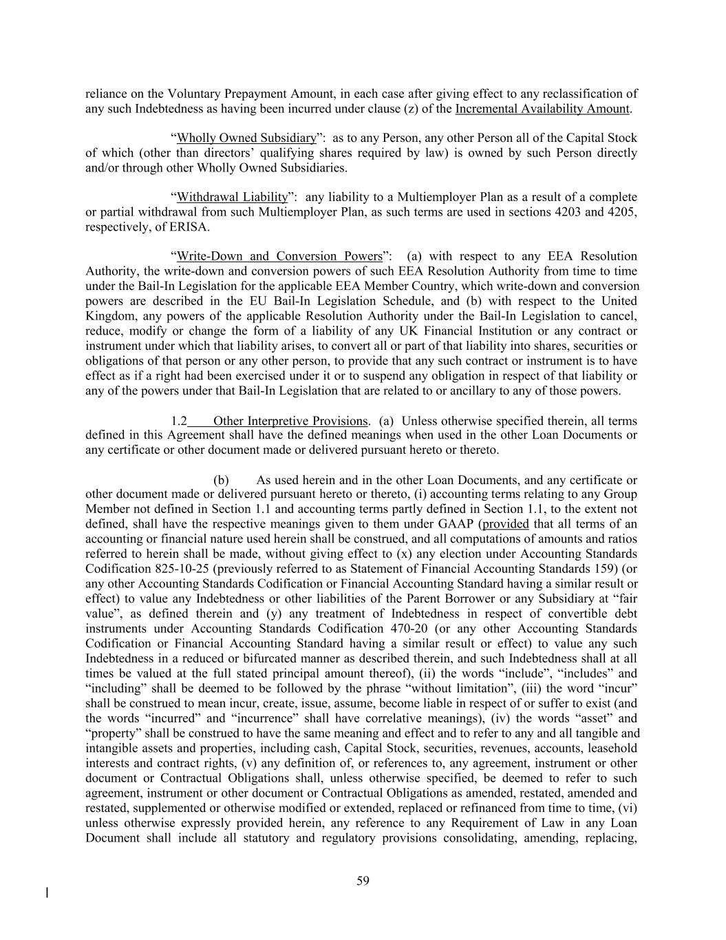 reliance on the Voluntary Prepayment Amount, in each case after giving effect to any reclassification of any such Indebtedness as having been incurred under clause (z) of the Incremental Availability Amount. “Wholly Owned Subsidiary”: as to any Person, any other Person all of the Capital Stock of which (other than directors’ qualifying shares required by law) is owned by such Person directly and/or through other Wholly Owned Subsidiaries. “Withdrawal Liability”: any liability to a Multiemployer Plan as a result of a complete or partial withdrawal from such Multiemployer Plan, as such terms are used in sections 4203 and 4205, respectively, of ERISA. “Write-Down and Conversion Powers”: (a) with respect to any EEA Resolution Authority, the write-down and conversion powers of such EEA Resolution Authority from time to time under the Bail-In Legislation for the applicable EEA Member Country, which write-down and conversion powers are described in the EU Bail-In Legislation Schedule, and (b) with respect to the United Kingdom, any powers of the applicable Resolution Authority under the Bail-In Legislation to cancel, reduce, modify or change the form of a liability of any UK Financial Institution or any contract or instrument under which that liability arises, to convert all or part of that liability into shares, securities or obligations of that person or any other person, to provide that any such contract or instrument is to have effect as if a right had been exercised under it or to suspend any obligation in respect of that liability or any of the powers under that Bail-In Legislation that are related to or ancillary to any of those powers. 1.2 Other Interpretive Provisions. (a) Unless otherwise specified therein, all terms defined in this Agreement shall have the defined meanings when used in the other Loan Documents or any certificate or other document made or delivered pursuant hereto or thereto. (b) As used herein and in the other Loan Documents, and any certificate or other document made or delivered pursuant hereto or thereto, (i) accounting terms relating to any Group Member not defined in Section 1.1 and accounting terms partly defined in Section 1.1, to the extent not defined, shall have the respective meanings given to them under GAAP (provided that all terms of an accounting or financial nature used herein shall be construed, and all computations of amounts and ratios referred to herein shall be made, without giving effect to (x) any election under Accounting Standards Codification 825-10-25 (previously referred to as Statement of Financial Accounting Standards 159) (or any other Accounting Standards Codification or Financial Accounting Standard having a similar result or effect) to value any Indebtedness or other liabilities of the Parent Borrower or any Subsidiary at “fair value”, as defined therein and (y) any treatment of Indebtedness in respect of convertible debt instruments under Accounting Standards Codification 470-20 (or any other Accounting Standards Codification or Financial Accounting Standard having a similar result or effect) to value any such Indebtedness in a reduced or bifurcated manner as described therein, and such Indebtedness shall at all times be valued at the full stated principal amount thereof), (ii) the words “include”, “includes” and “including” shall be deemed to be followed by the phrase “without limitation”, (iii) the word “incur” shall be construed to mean incur, create, issue, assume, become liable in respect of or suffer to exist (and the words “incurred” and “incurrence” shall have correlative meanings), (iv) the words “asset” and “property” shall be construed to have the same meaning and effect and to refer to any and all tangible and intangible assets and properties, including cash, Capital Stock, securities, revenues, accounts, leasehold interests and contract rights, (v) any definition of, or references to, any agreement, instrument or other document or Contractual Obligations shall, unless otherwise specified, be deemed to refer to such agreement, instrument or other document or Contractual Obligations as amended, restated, amended and restated, supplemented or otherwise modified or extended, replaced or refinanced from time to time, (vi) unless otherwise expressly provided herein, any reference to any Requirement of Law in any Loan Document shall include all statutory and regulatory provisions consolidating, amending, replacing, 59