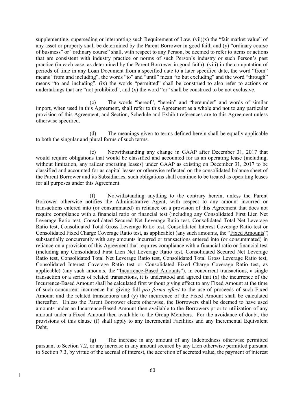 supplementing, superseding or interpreting such Requirement of Law, (vii)(x) the “fair market value” of any asset or property shall be determined by the Parent Borrower in good faith and (y) “ordinary course of business” or “ordinary course” shall, with respect to any Person, be deemed to refer to items or actions that are consistent with industry practice or norms of such Person’s industry or such Person’s past practice (in each case, as determined by the Parent Borrower in good faith), (viii) in the computation of periods of time in any Loan Document from a specified date to a later specified date, the word “from” means “from and including”, the words “to” and “until” mean “to but excluding” and the word “through” means “to and including”, (ix) the words “permitted” shall be construed to also refer to actions or undertakings that are “not prohibited”, and (x) the word “or” shall be construed to be not exclusive. (c) The words “hereof”, “herein” and “hereunder” and words of similar import, when used in this Agreement, shall refer to this Agreement as a whole and not to any particular provision of this Agreement, and Section, Schedule and Exhibit references are to this Agreement unless otherwise specified. (d) The meanings given to terms defined herein shall be equally applicable to both the singular and plural forms of such terms. (e) Notwithstanding any change in GAAP after December 31, 2017 that would require obligations that would be classified and accounted for as an operating lease (including, without limitation, any railcar operating leases) under GAAP as existing on December 31, 2017 to be classified and accounted for as capital leases or otherwise reflected on the consolidated balance sheet of the Parent Borrower and its Subsidiaries, such obligations shall continue to be treated as operating leases for all purposes under this Agreement. (f) Notwithstanding anything to the contrary herein, unless the Parent Borrower otherwise notifies the Administrative Agent, with respect to any amount incurred or transactions entered into (or consummated) in reliance on a provision of this Agreement that does not require compliance with a financial ratio or financial test (including any Consolidated First Lien Net Leverage Ratio test, Consolidated Secured Net Leverage Ratio test, Consolidated Total Net Leverage Ratio test, Consolidated Total Gross Leverage Ratio test, Consolidated Interest Coverage Ratio test or Consolidated Fixed Charge Coverage Ratio test, as applicable) (any such amounts, the “Fixed Amounts”) substantially concurrently with any amounts incurred or transactions entered into (or consummated) in reliance on a provision of this Agreement that requires compliance with a financial ratio or financial test (including any Consolidated First Lien Net Leverage Ratio test, Consolidated Secured Net Leverage Ratio test, Consolidated Total Net Leverage Ratio test, Consolidated Total Gross Leverage Ratio test, Consolidated Interest Coverage Ratio test or Consolidated Fixed Charge Coverage Ratio test, as applicable) (any such amounts, the “Incurrence-Based Amounts”), in concurrent transactions, a single transaction or a series of related transactions, it is understood and agreed that (x) the incurrence of the Incurrence-Based Amount shall be calculated first without giving effect to any Fixed Amount at the time of such concurrent incurrence but giving full pro forma effect to the use of proceeds of such Fixed Amount and the related transactions and (y) the incurrence of the Fixed Amount shall be calculated thereafter. Unless the Parent Borrower elects otherwise, the Borrowers shall be deemed to have used amounts under an Incurrence-Based Amount then available to the Borrowers prior to utilization of any amount under a Fixed Amount then available to the Group Members. For the avoidance of doubt, the provisions of this clause (f) shall apply to any Incremental Facilities and any Incremental Equivalent Debt. (g) The increase in any amount of any Indebtedness otherwise permitted pursuant to Section 7.2, or any increase in any amount secured by any Lien otherwise permitted pursuant to Section 7.3, by virtue of the accrual of interest, the accretion of accreted value, the payment of interest 60