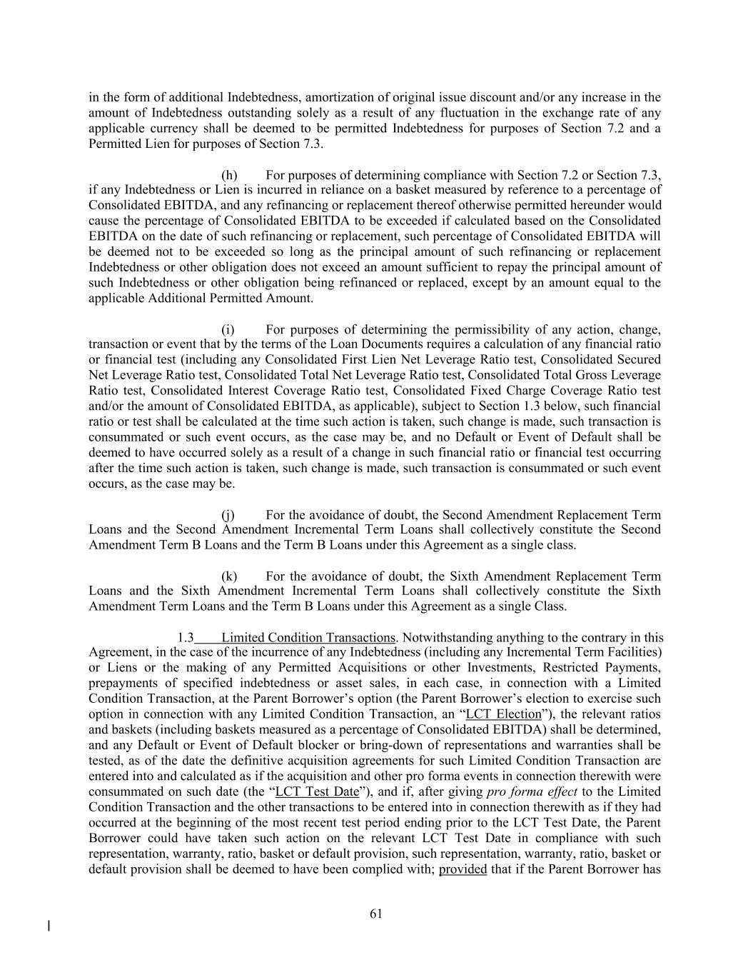 in the form of additional Indebtedness, amortization of original issue discount and/or any increase in the amount of Indebtedness outstanding solely as a result of any fluctuation in the exchange rate of any applicable currency shall be deemed to be permitted Indebtedness for purposes of Section 7.2 and a Permitted Lien for purposes of Section 7.3. (h) For purposes of determining compliance with Section 7.2 or Section 7.3, if any Indebtedness or Lien is incurred in reliance on a basket measured by reference to a percentage of Consolidated EBITDA, and any refinancing or replacement thereof otherwise permitted hereunder would cause the percentage of Consolidated EBITDA to be exceeded if calculated based on the Consolidated EBITDA on the date of such refinancing or replacement, such percentage of Consolidated EBITDA will be deemed not to be exceeded so long as the principal amount of such refinancing or replacement Indebtedness or other obligation does not exceed an amount sufficient to repay the principal amount of such Indebtedness or other obligation being refinanced or replaced, except by an amount equal to the applicable Additional Permitted Amount. (i) For purposes of determining the permissibility of any action, change, transaction or event that by the terms of the Loan Documents requires a calculation of any financial ratio or financial test (including any Consolidated First Lien Net Leverage Ratio test, Consolidated Secured Net Leverage Ratio test, Consolidated Total Net Leverage Ratio test, Consolidated Total Gross Leverage Ratio test, Consolidated Interest Coverage Ratio test, Consolidated Fixed Charge Coverage Ratio test and/or the amount of Consolidated EBITDA, as applicable), subject to Section 1.3 below, such financial ratio or test shall be calculated at the time such action is taken, such change is made, such transaction is consummated or such event occurs, as the case may be, and no Default or Event of Default shall be deemed to have occurred solely as a result of a change in such financial ratio or financial test occurring after the time such action is taken, such change is made, such transaction is consummated or such event occurs, as the case may be. (j) For the avoidance of doubt, the Second Amendment Replacement Term Loans and the Second Amendment Incremental Term Loans shall collectively constitute the Second Amendment Term B Loans and the Term B Loans under this Agreement as a single class. (k) For the avoidance of doubt, the Sixth Amendment Replacement Term Loans and the Sixth Amendment Incremental Term Loans shall collectively constitute the Sixth Amendment Term Loans and the Term B Loans under this Agreement as a single Class. 1.3 Limited Condition Transactions. Notwithstanding anything to the contrary in this Agreement, in the case of the incurrence of any Indebtedness (including any Incremental Term Facilities) or Liens or the making of any Permitted Acquisitions or other Investments, Restricted Payments, prepayments of specified indebtedness or asset sales, in each case, in connection with a Limited Condition Transaction, at the Parent Borrower’s option (the Parent Borrower’s election to exercise such option in connection with any Limited Condition Transaction, an “LCT Election”), the relevant ratios and baskets (including baskets measured as a percentage of Consolidated EBITDA) shall be determined, and any Default or Event of Default blocker or bring-down of representations and warranties shall be tested, as of the date the definitive acquisition agreements for such Limited Condition Transaction are entered into and calculated as if the acquisition and other pro forma events in connection therewith were consummated on such date (the “LCT Test Date”), and if, after giving pro forma effect to the Limited Condition Transaction and the other transactions to be entered into in connection therewith as if they had occurred at the beginning of the most recent test period ending prior to the LCT Test Date, the Parent Borrower could have taken such action on the relevant LCT Test Date in compliance with such representation, warranty, ratio, basket or default provision, such representation, warranty, ratio, basket or default provision shall be deemed to have been complied with; provided that if the Parent Borrower has 61