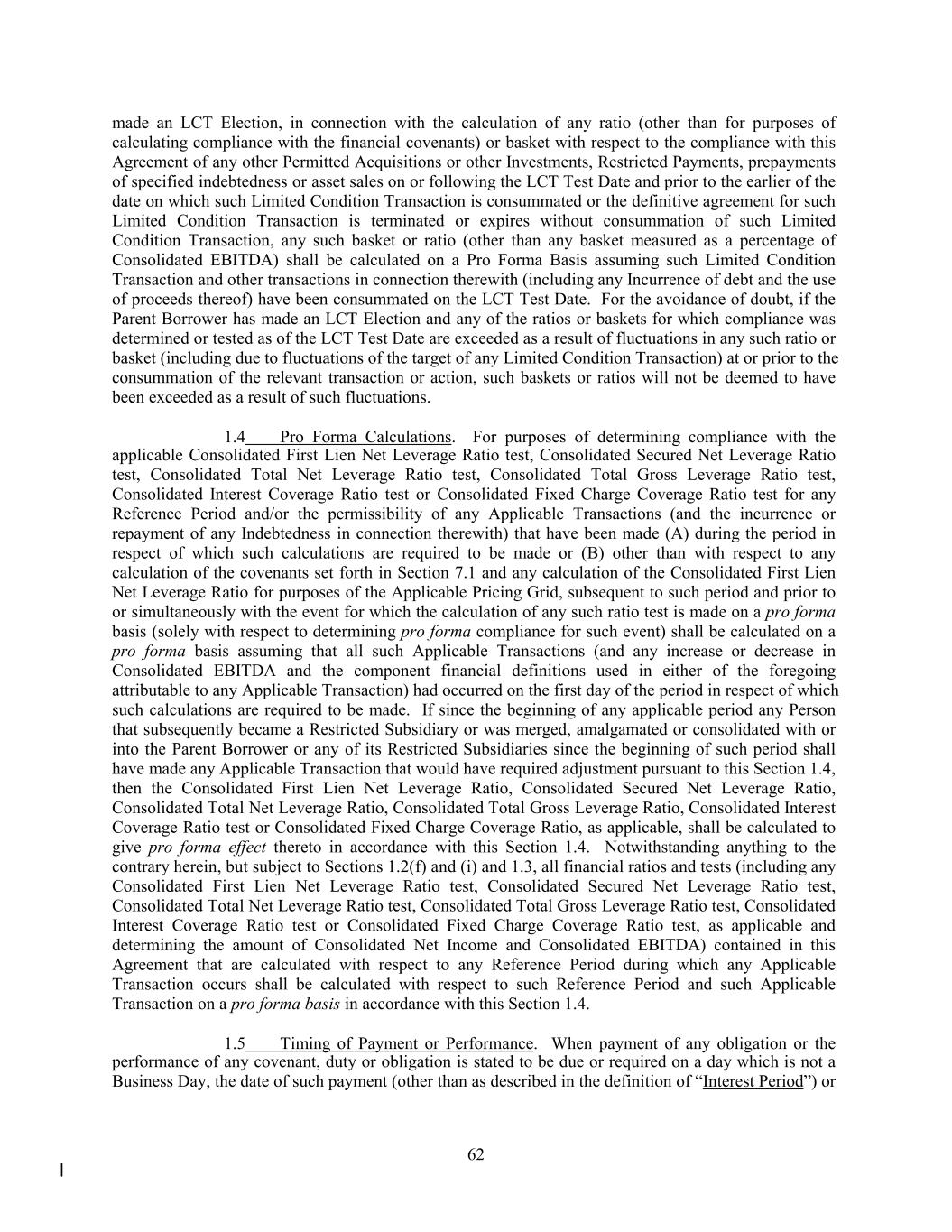 made an LCT Election, in connection with the calculation of any ratio (other than for purposes of calculating compliance with the financial covenants) or basket with respect to the compliance with this Agreement of any other Permitted Acquisitions or other Investments, Restricted Payments, prepayments of specified indebtedness or asset sales on or following the LCT Test Date and prior to the earlier of the date on which such Limited Condition Transaction is consummated or the definitive agreement for such Limited Condition Transaction is terminated or expires without consummation of such Limited Condition Transaction, any such basket or ratio (other than any basket measured as a percentage of Consolidated EBITDA) shall be calculated on a Pro Forma Basis assuming such Limited Condition Transaction and other transactions in connection therewith (including any Incurrence of debt and the use of proceeds thereof) have been consummated on the LCT Test Date. For the avoidance of doubt, if the Parent Borrower has made an LCT Election and any of the ratios or baskets for which compliance was determined or tested as of the LCT Test Date are exceeded as a result of fluctuations in any such ratio or basket (including due to fluctuations of the target of any Limited Condition Transaction) at or prior to the consummation of the relevant transaction or action, such baskets or ratios will not be deemed to have been exceeded as a result of such fluctuations. 1.4 Pro Forma Calculations. For purposes of determining compliance with the applicable Consolidated First Lien Net Leverage Ratio test, Consolidated Secured Net Leverage Ratio test, Consolidated Total Net Leverage Ratio test, Consolidated Total Gross Leverage Ratio test, Consolidated Interest Coverage Ratio test or Consolidated Fixed Charge Coverage Ratio test for any Reference Period and/or the permissibility of any Applicable Transactions (and the incurrence or repayment of any Indebtedness in connection therewith) that have been made (A) during the period in respect of which such calculations are required to be made or (B) other than with respect to any calculation of the covenants set forth in Section 7.1 and any calculation of the Consolidated First Lien Net Leverage Ratio for purposes of the Applicable Pricing Grid, subsequent to such period and prior to or simultaneously with the event for which the calculation of any such ratio test is made on a pro forma basis (solely with respect to determining pro forma compliance for such event) shall be calculated on a pro forma basis assuming that all such Applicable Transactions (and any increase or decrease in Consolidated EBITDA and the component financial definitions used in either of the foregoing attributable to any Applicable Transaction) had occurred on the first day of the period in respect of which such calculations are required to be made. If since the beginning of any applicable period any Person that subsequently became a Restricted Subsidiary or was merged, amalgamated or consolidated with or into the Parent Borrower or any of its Restricted Subsidiaries since the beginning of such period shall have made any Applicable Transaction that would have required adjustment pursuant to this Section 1.4, then the Consolidated First Lien Net Leverage Ratio, Consolidated Secured Net Leverage Ratio, Consolidated Total Net Leverage Ratio, Consolidated Total Gross Leverage Ratio, Consolidated Interest Coverage Ratio test or Consolidated Fixed Charge Coverage Ratio, as applicable, shall be calculated to give pro forma effect thereto in accordance with this Section 1.4. Notwithstanding anything to the contrary herein, but subject to Sections 1.2(f) and (i) and 1.3, all financial ratios and tests (including any Consolidated First Lien Net Leverage Ratio test, Consolidated Secured Net Leverage Ratio test, Consolidated Total Net Leverage Ratio test, Consolidated Total Gross Leverage Ratio test, Consolidated Interest Coverage Ratio test or Consolidated Fixed Charge Coverage Ratio test, as applicable and determining the amount of Consolidated Net Income and Consolidated EBITDA) contained in this Agreement that are calculated with respect to any Reference Period during which any Applicable Transaction occurs shall be calculated with respect to such Reference Period and such Applicable Transaction on a pro forma basis in accordance with this Section 1.4. 1.5 Timing of Payment or Performance. When payment of any obligation or the performance of any covenant, duty or obligation is stated to be due or required on a day which is not a Business Day, the date of such payment (other than as described in the definition of “Interest Period”) or 62