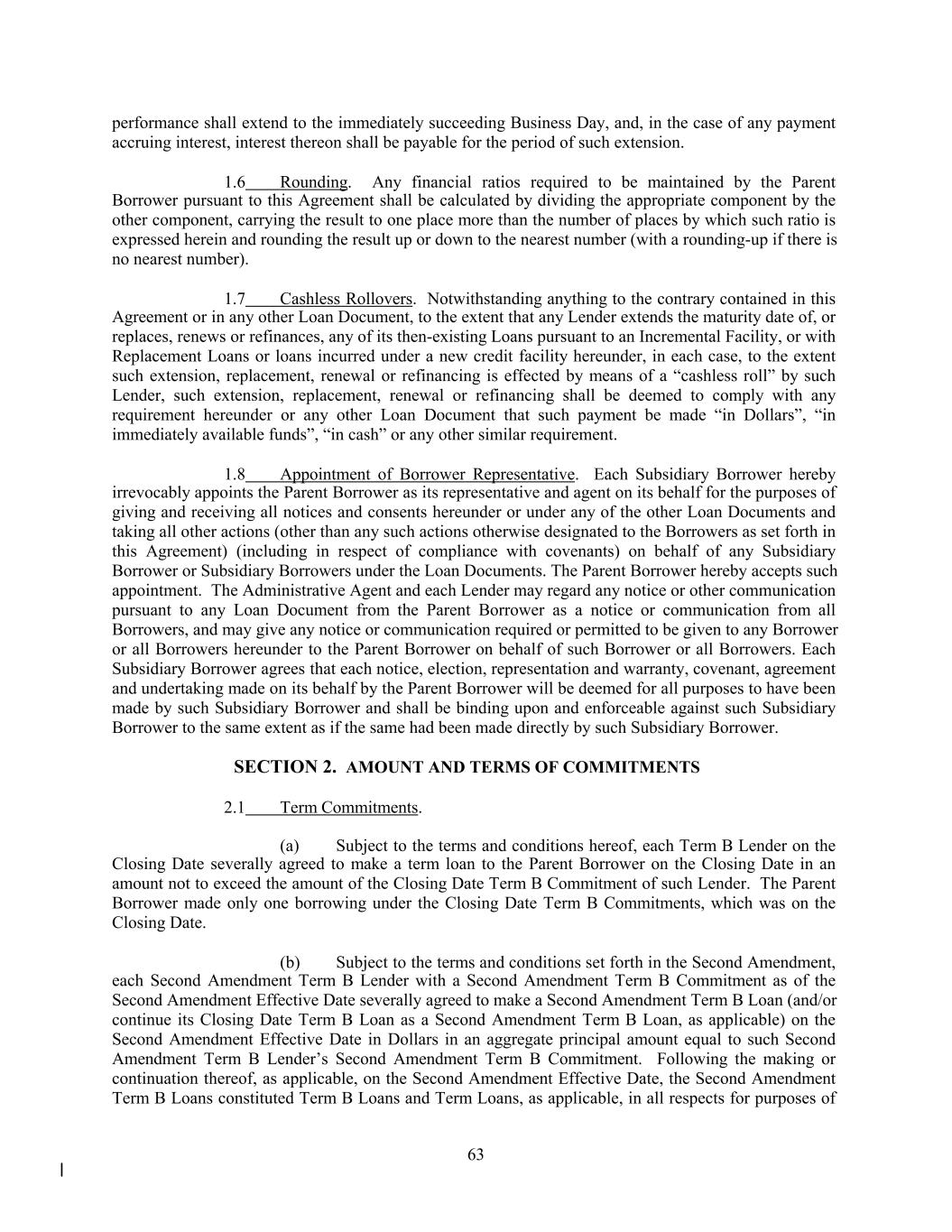 performance shall extend to the immediately succeeding Business Day, and, in the case of any payment accruing interest, interest thereon shall be payable for the period of such extension. 1.6 Rounding. Any financial ratios required to be maintained by the Parent Borrower pursuant to this Agreement shall be calculated by dividing the appropriate component by the other component, carrying the result to one place more than the number of places by which such ratio is expressed herein and rounding the result up or down to the nearest number (with a rounding-up if there is no nearest number). 1.7 Cashless Rollovers. Notwithstanding anything to the contrary contained in this Agreement or in any other Loan Document, to the extent that any Lender extends the maturity date of, or replaces, renews or refinances, any of its then-existing Loans pursuant to an Incremental Facility, or with Replacement Loans or loans incurred under a new credit facility hereunder, in each case, to the extent such extension, replacement, renewal or refinancing is effected by means of a “cashless roll” by such Lender, such extension, replacement, renewal or refinancing shall be deemed to comply with any requirement hereunder or any other Loan Document that such payment be made “in Dollars”, “in immediately available funds”, “in cash” or any other similar requirement. 1.8 Appointment of Borrower Representative. Each Subsidiary Borrower hereby irrevocably appoints the Parent Borrower as its representative and agent on its behalf for the purposes of giving and receiving all notices and consents hereunder or under any of the other Loan Documents and taking all other actions (other than any such actions otherwise designated to the Borrowers as set forth in this Agreement) (including in respect of compliance with covenants) on behalf of any Subsidiary Borrower or Subsidiary Borrowers under the Loan Documents. The Parent Borrower hereby accepts such appointment. The Administrative Agent and each Lender may regard any notice or other communication pursuant to any Loan Document from the Parent Borrower as a notice or communication from all Borrowers, and may give any notice or communication required or permitted to be given to any Borrower or all Borrowers hereunder to the Parent Borrower on behalf of such Borrower or all Borrowers. Each Subsidiary Borrower agrees that each notice, election, representation and warranty, covenant, agreement and undertaking made on its behalf by the Parent Borrower will be deemed for all purposes to have been made by such Subsidiary Borrower and shall be binding upon and enforceable against such Subsidiary Borrower to the same extent as if the same had been made directly by such Subsidiary Borrower. SECTION 2. AMOUNT AND TERMS OF COMMITMENTS 2.1 Term Commitments. (a) Subject to the terms and conditions hereof, each Term B Lender on the Closing Date severally agreed to make a term loan to the Parent Borrower on the Closing Date in an amount not to exceed the amount of the Closing Date Term B Commitment of such Lender. The Parent Borrower made only one borrowing under the Closing Date Term B Commitments, which was on the Closing Date. (b) Subject to the terms and conditions set forth in the Second Amendment, each Second Amendment Term B Lender with a Second Amendment Term B Commitment as of the Second Amendment Effective Date severally agreed to make a Second Amendment Term B Loan (and/or continue its Closing Date Term B Loan as a Second Amendment Term B Loan, as applicable) on the Second Amendment Effective Date in Dollars in an aggregate principal amount equal to such Second Amendment Term B Lender’s Second Amendment Term B Commitment. Following the making or continuation thereof, as applicable, on the Second Amendment Effective Date, the Second Amendment Term B Loans constituted Term B Loans and Term Loans, as applicable, in all respects for purposes of 63