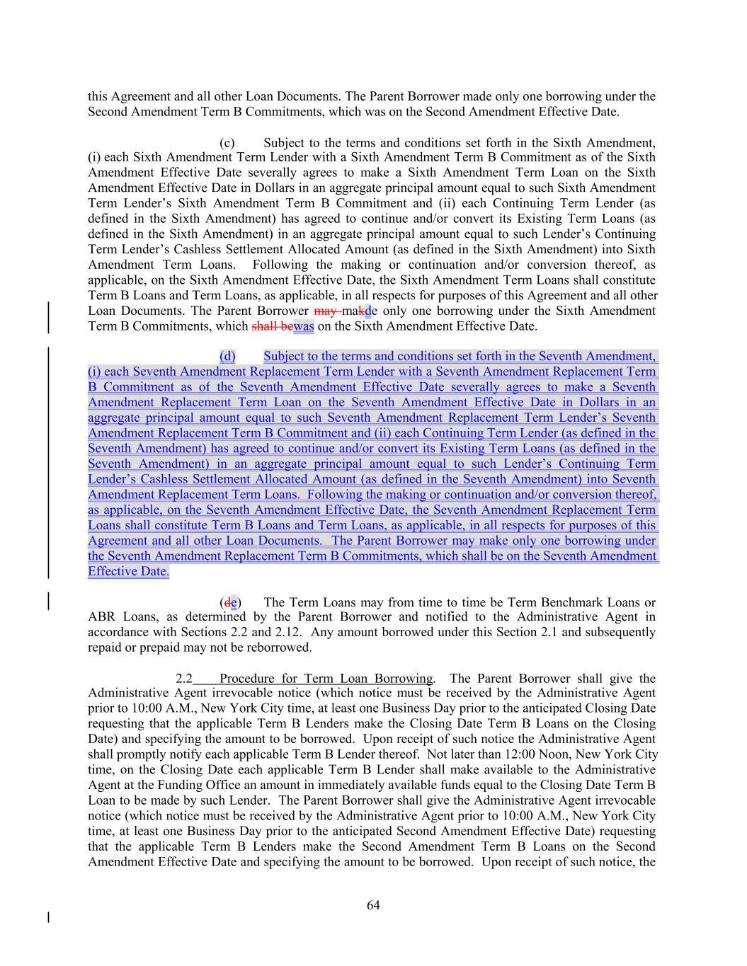 this Agreement and all other Loan Documents. The Parent Borrower made only one borrowing under the Second Amendment Term B Commitments, which was on the Second Amendment Effective Date. (c) Subject to the terms and conditions set forth in the Sixth Amendment, (i) each Sixth Amendment Term Lender with a Sixth Amendment Term B Commitment as of the Sixth Amendment Effective Date severally agrees to make a Sixth Amendment Term Loan on the Sixth Amendment Effective Date in Dollars in an aggregate principal amount equal to such Sixth Amendment Term Lender’s Sixth Amendment Term B Commitment and (ii) each Continuing Term Lender (as defined in the Sixth Amendment) has agreed to continue and/or convert its Existing Term Loans (as defined in the Sixth Amendment) in an aggregate principal amount equal to such Lender’s Continuing Term Lender’s Cashless Settlement Allocated Amount (as defined in the Sixth Amendment) into Sixth Amendment Term Loans. Following the making or continuation and/or conversion thereof, as applicable, on the Sixth Amendment Effective Date, the Sixth Amendment Term Loans shall constitute Term B Loans and Term Loans, as applicable, in all respects for purposes of this Agreement and all other Loan Documents. The Parent Borrower may makde only one borrowing under the Sixth Amendment Term B Commitments, which shall bewas on the Sixth Amendment Effective Date. (d) Subject to the terms and conditions set forth in the Seventh Amendment, (i) each Seventh Amendment Replacement Term Lender with a Seventh Amendment Replacement Term B Commitment as of the Seventh Amendment Effective Date severally agrees to make a Seventh Amendment Replacement Term Loan on the Seventh Amendment Effective Date in Dollars in an aggregate principal amount equal to such Seventh Amendment Replacement Term Lender’s Seventh Amendment Replacement Term B Commitment and (ii) each Continuing Term Lender (as defined in the Seventh Amendment) has agreed to continue and/or convert its Existing Term Loans (as defined in the Seventh Amendment) in an aggregate principal amount equal to such Lender’s Continuing Term Lender’s Cashless Settlement Allocated Amount (as defined in the Seventh Amendment) into Seventh Amendment Replacement Term Loans. Following the making or continuation and/or conversion thereof, as applicable, on the Seventh Amendment Effective Date, the Seventh Amendment Replacement Term Loans shall constitute Term B Loans and Term Loans, as applicable, in all respects for purposes of this Agreement and all other Loan Documents. The Parent Borrower may make only one borrowing under the Seventh Amendment Replacement Term B Commitments, which shall be on the Seventh Amendment Effective Date. (de) The Term Loans may from time to time be Term Benchmark Loans or ABR Loans, as determined by the Parent Borrower and notified to the Administrative Agent in accordance with Sections 2.2 and 2.12. Any amount borrowed under this Section 2.1 and subsequently repaid or prepaid may not be reborrowed. 2.2 Procedure for Term Loan Borrowing. The Parent Borrower shall give the Administrative Agent irrevocable notice (which notice must be received by the Administrative Agent prior to 10:00 A.M., New York City time, at least one Business Day prior to the anticipated Closing Date requesting that the applicable Term B Lenders make the Closing Date Term B Loans on the Closing Date) and specifying the amount to be borrowed. Upon receipt of such notice the Administrative Agent shall promptly notify each applicable Term B Lender thereof. Not later than 12:00 Noon, New York City time, on the Closing Date each applicable Term B Lender shall make available to the Administrative Agent at the Funding Office an amount in immediately available funds equal to the Closing Date Term B Loan to be made by such Lender. The Parent Borrower shall give the Administrative Agent irrevocable notice (which notice must be received by the Administrative Agent prior to 10:00 A.M., New York City time, at least one Business Day prior to the anticipated Second Amendment Effective Date) requesting that the applicable Term B Lenders make the Second Amendment Term B Loans on the Second Amendment Effective Date and specifying the amount to be borrowed. Upon receipt of such notice, the 64