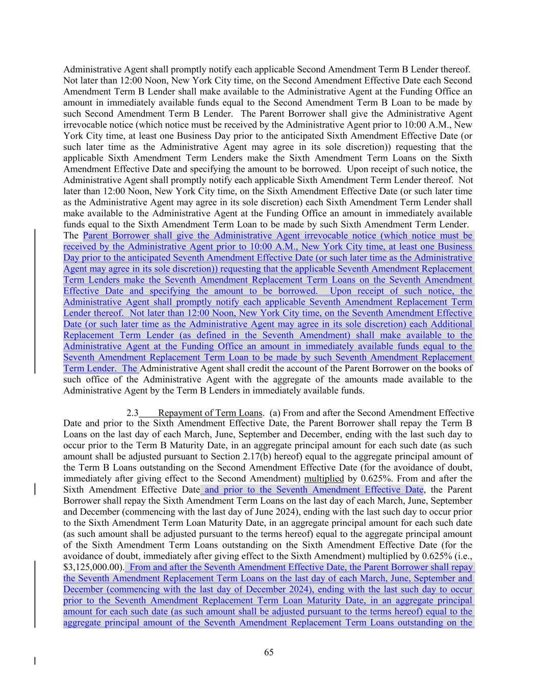 Administrative Agent shall promptly notify each applicable Second Amendment Term B Lender thereof. Not later than 12:00 Noon, New York City time, on the Second Amendment Effective Date each Second Amendment Term B Lender shall make available to the Administrative Agent at the Funding Office an amount in immediately available funds equal to the Second Amendment Term B Loan to be made by such Second Amendment Term B Lender. The Parent Borrower shall give the Administrative Agent irrevocable notice (which notice must be received by the Administrative Agent prior to 10:00 A.M., New York City time, at least one Business Day prior to the anticipated Sixth Amendment Effective Date (or such later time as the Administrative Agent may agree in its sole discretion)) requesting that the applicable Sixth Amendment Term Lenders make the Sixth Amendment Term Loans on the Sixth Amendment Effective Date and specifying the amount to be borrowed. Upon receipt of such notice, the Administrative Agent shall promptly notify each applicable Sixth Amendment Term Lender thereof. Not later than 12:00 Noon, New York City time, on the Sixth Amendment Effective Date (or such later time as the Administrative Agent may agree in its sole discretion) each Sixth Amendment Term Lender shall make available to the Administrative Agent at the Funding Office an amount in immediately available funds equal to the Sixth Amendment Term Loan to be made by such Sixth Amendment Term Lender. The Parent Borrower shall give the Administrative Agent irrevocable notice (which notice must be received by the Administrative Agent prior to 10:00 A.M., New York City time, at least one Business Day prior to the anticipated Seventh Amendment Effective Date (or such later time as the Administrative Agent may agree in its sole discretion)) requesting that the applicable Seventh Amendment Replacement Term Lenders make the Seventh Amendment Replacement Term Loans on the Seventh Amendment Effective Date and specifying the amount to be borrowed. Upon receipt of such notice, the Administrative Agent shall promptly notify each applicable Seventh Amendment Replacement Term Lender thereof. Not later than 12:00 Noon, New York City time, on the Seventh Amendment Effective Date (or such later time as the Administrative Agent may agree in its sole discretion) each Additional Replacement Term Lender (as defined in the Seventh Amendment) shall make available to the Administrative Agent at the Funding Office an amount in immediately available funds equal to the Seventh Amendment Replacement Term Loan to be made by such Seventh Amendment Replacement Term Lender. The Administrative Agent shall credit the account of the Parent Borrower on the books of such office of the Administrative Agent with the aggregate of the amounts made available to the Administrative Agent by the Term B Lenders in immediately available funds. 2.3 Repayment of Term Loans. (a) From and after the Second Amendment Effective Date and prior to the Sixth Amendment Effective Date, the Parent Borrower shall repay the Term B Loans on the last day of each March, June, September and December, ending with the last such day to occur prior to the Term B Maturity Date, in an aggregate principal amount for each such date (as such amount shall be adjusted pursuant to Section 2.17(b) hereof) equal to the aggregate principal amount of the Term B Loans outstanding on the Second Amendment Effective Date (for the avoidance of doubt, immediately after giving effect to the Second Amendment) multiplied by 0.625%. From and after the Sixth Amendment Effective Date and prior to the Seventh Amendment Effective Date, the Parent Borrower shall repay the Sixth Amendment Term Loans on the last day of each March, June, September and December (commencing with the last day of June 2024), ending with the last such day to occur prior to the Sixth Amendment Term Loan Maturity Date, in an aggregate principal amount for each such date (as such amount shall be adjusted pursuant to the terms hereof) equal to the aggregate principal amount of the Sixth Amendment Term Loans outstanding on the Sixth Amendment Effective Date (for the avoidance of doubt, immediately after giving effect to the Sixth Amendment) multiplied by 0.625% (i.e., $3,125,000.00). From and after the Seventh Amendment Effective Date, the Parent Borrower shall repay the Seventh Amendment Replacement Term Loans on the last day of each March, June, September and December (commencing with the last day of December 2024), ending with the last such day to occur prior to the Seventh Amendment Replacement Term Loan Maturity Date, in an aggregate principal amount for each such date (as such amount shall be adjusted pursuant to the terms hereof) equal to the aggregate principal amount of the Seventh Amendment Replacement Term Loans outstanding on the 65