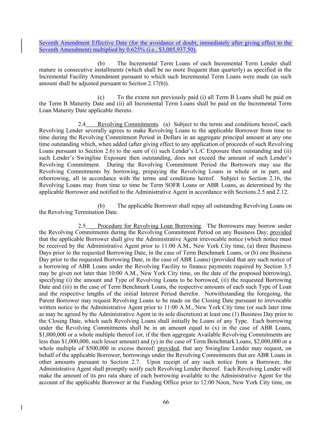 Seventh Amendment Effective Date (for the avoidance of doubt, immediately after giving effect to the Seventh Amendment) multiplied by 0.625% (i.e., $3,085,937.50). (b) The Incremental Term Loans of each Incremental Term Lender shall mature in consecutive installments (which shall be no more frequent than quarterly) as specified in the Incremental Facility Amendment pursuant to which such Incremental Term Loans were made (as such amount shall be adjusted pursuant to Section 2.17(b)). (c) To the extent not previously paid (i) all Term B Loans shall be paid on the Term B Maturity Date and (ii) all Incremental Term Loans shall be paid on the Incremental Term Loan Maturity Date applicable thereto. 2.4 Revolving Commitments. (a) Subject to the terms and conditions hereof, each Revolving Lender severally agrees to make Revolving Loans to the applicable Borrower from time to time during the Revolving Commitment Period in Dollars in an aggregate principal amount at any one time outstanding which, when added (after giving effect to any application of proceeds of such Revolving Loans pursuant to Section 2.6) to the sum of (i) such Lender’s L/C Exposure then outstanding and (ii) such Lender’s Swingline Exposure then outstanding, does not exceed the amount of such Lender’s Revolving Commitment. During the Revolving Commitment Period the Borrowers may use the Revolving Commitments by borrowing, prepaying the Revolving Loans in whole or in part, and reborrowing, all in accordance with the terms and conditions hereof. Subject to Section 2.16, the Revolving Loans may from time to time be Term SOFR Loans or ABR Loans, as determined by the applicable Borrower and notified to the Administrative Agent in accordance with Sections 2.5 and 2.12. (b) The applicable Borrower shall repay all outstanding Revolving Loans on the Revolving Termination Date. 2.5 Procedure for Revolving Loan Borrowing. The Borrowers may borrow under the Revolving Commitments during the Revolving Commitment Period on any Business Day; provided that the applicable Borrower shall give the Administrative Agent irrevocable notice (which notice must be received by the Administrative Agent prior to 11:00 A.M., New York City time, (a) three Business Days prior to the requested Borrowing Date, in the case of Term Benchmark Loans, or (b) one Business Day prior to the requested Borrowing Date, in the case of ABR Loans) (provided that any such notice of a borrowing of ABR Loans under the Revolving Facility to finance payments required by Section 3.5 may be given not later than 10:00 A.M., New York City time, on the date of the proposed borrowing), specifying (i) the amount and Type of Revolving Loans to be borrowed, (ii) the requested Borrowing Date and (iii) in the case of Term Benchmark Loans, the respective amounts of each such Type of Loan and the respective lengths of the initial Interest Period therefor. Notwithstanding the foregoing, the Parent Borrower may request Revolving Loans to be made on the Closing Date pursuant to irrevocable written notice to the Administrative Agent prior to 11:00 A.M., New York City time (or such later time as may be agreed by the Administrative Agent in its sole discretion) at least one (1) Business Day prior to the Closing Date, which such Revolving Loans shall initially be Loans of any Type. Each borrowing under the Revolving Commitments shall be in an amount equal to (x) in the case of ABR Loans, $1,000,000 or a whole multiple thereof (or, if the then aggregate Available Revolving Commitments are less than $1,000,000, such lesser amount) and (y) in the case of Term Benchmark Loans, $2,000,000 or a whole multiple of $500,000 in excess thereof; provided, that any Swingline Lender may request, on behalf of the applicable Borrower, borrowings under the Revolving Commitments that are ABR Loans in other amounts pursuant to Section 2.7. Upon receipt of any such notice from a Borrower, the Administrative Agent shall promptly notify each Revolving Lender thereof. Each Revolving Lender will make the amount of its pro rata share of each borrowing available to the Administrative Agent for the account of the applicable Borrower at the Funding Office prior to 12:00 Noon, New York City time, on 66