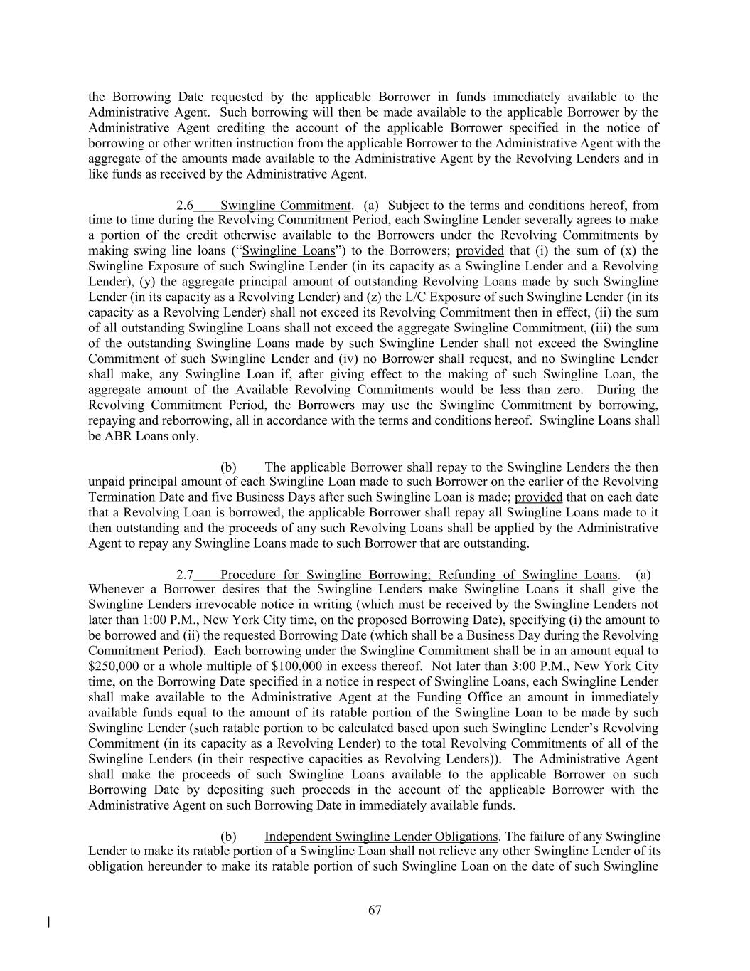 the Borrowing Date requested by the applicable Borrower in funds immediately available to the Administrative Agent. Such borrowing will then be made available to the applicable Borrower by the Administrative Agent crediting the account of the applicable Borrower specified in the notice of borrowing or other written instruction from the applicable Borrower to the Administrative Agent with the aggregate of the amounts made available to the Administrative Agent by the Revolving Lenders and in like funds as received by the Administrative Agent. 2.6 Swingline Commitment. (a) Subject to the terms and conditions hereof, from time to time during the Revolving Commitment Period, each Swingline Lender severally agrees to make a portion of the credit otherwise available to the Borrowers under the Revolving Commitments by making swing line loans (“Swingline Loans”) to the Borrowers; provided that (i) the sum of (x) the Swingline Exposure of such Swingline Lender (in its capacity as a Swingline Lender and a Revolving Lender), (y) the aggregate principal amount of outstanding Revolving Loans made by such Swingline Lender (in its capacity as a Revolving Lender) and (z) the L/C Exposure of such Swingline Lender (in its capacity as a Revolving Lender) shall not exceed its Revolving Commitment then in effect, (ii) the sum of all outstanding Swingline Loans shall not exceed the aggregate Swingline Commitment, (iii) the sum of the outstanding Swingline Loans made by such Swingline Lender shall not exceed the Swingline Commitment of such Swingline Lender and (iv) no Borrower shall request, and no Swingline Lender shall make, any Swingline Loan if, after giving effect to the making of such Swingline Loan, the aggregate amount of the Available Revolving Commitments would be less than zero. During the Revolving Commitment Period, the Borrowers may use the Swingline Commitment by borrowing, repaying and reborrowing, all in accordance with the terms and conditions hereof. Swingline Loans shall be ABR Loans only. (b) The applicable Borrower shall repay to the Swingline Lenders the then unpaid principal amount of each Swingline Loan made to such Borrower on the earlier of the Revolving Termination Date and five Business Days after such Swingline Loan is made; provided that on each date that a Revolving Loan is borrowed, the applicable Borrower shall repay all Swingline Loans made to it then outstanding and the proceeds of any such Revolving Loans shall be applied by the Administrative Agent to repay any Swingline Loans made to such Borrower that are outstanding. 2.7 Procedure for Swingline Borrowing; Refunding of Swingline Loans. (a) Whenever a Borrower desires that the Swingline Lenders make Swingline Loans it shall give the Swingline Lenders irrevocable notice in writing (which must be received by the Swingline Lenders not later than 1:00 P.M., New York City time, on the proposed Borrowing Date), specifying (i) the amount to be borrowed and (ii) the requested Borrowing Date (which shall be a Business Day during the Revolving Commitment Period). Each borrowing under the Swingline Commitment shall be in an amount equal to $250,000 or a whole multiple of $100,000 in excess thereof. Not later than 3:00 P.M., New York City time, on the Borrowing Date specified in a notice in respect of Swingline Loans, each Swingline Lender shall make available to the Administrative Agent at the Funding Office an amount in immediately available funds equal to the amount of its ratable portion of the Swingline Loan to be made by such Swingline Lender (such ratable portion to be calculated based upon such Swingline Lender’s Revolving Commitment (in its capacity as a Revolving Lender) to the total Revolving Commitments of all of the Swingline Lenders (in their respective capacities as Revolving Lenders)). The Administrative Agent shall make the proceeds of such Swingline Loans available to the applicable Borrower on such Borrowing Date by depositing such proceeds in the account of the applicable Borrower with the Administrative Agent on such Borrowing Date in immediately available funds. (b) Independent Swingline Lender Obligations. The failure of any Swingline Lender to make its ratable portion of a Swingline Loan shall not relieve any other Swingline Lender of its obligation hereunder to make its ratable portion of such Swingline Loan on the date of such Swingline 67