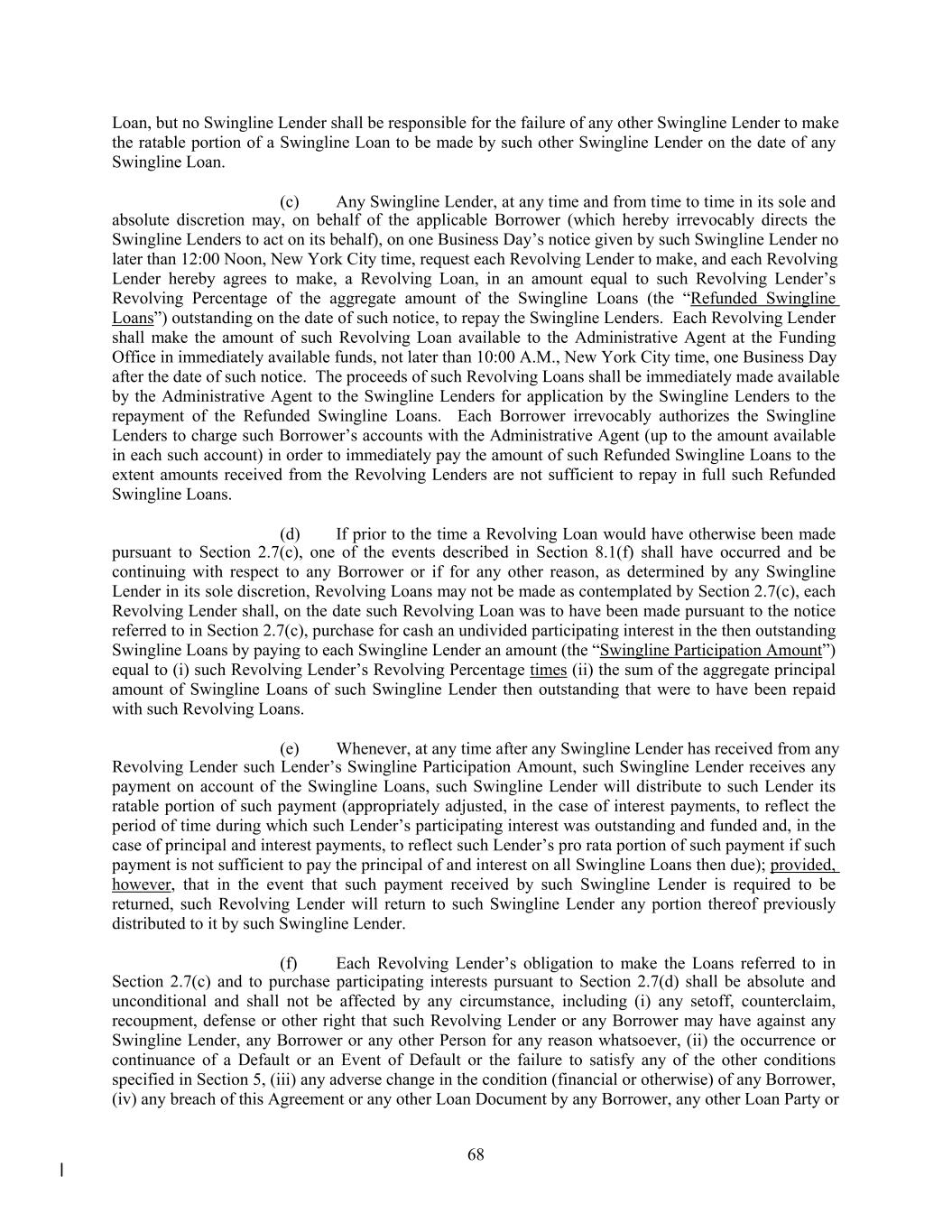 Loan, but no Swingline Lender shall be responsible for the failure of any other Swingline Lender to make the ratable portion of a Swingline Loan to be made by such other Swingline Lender on the date of any Swingline Loan. (c) Any Swingline Lender, at any time and from time to time in its sole and absolute discretion may, on behalf of the applicable Borrower (which hereby irrevocably directs the Swingline Lenders to act on its behalf), on one Business Day’s notice given by such Swingline Lender no later than 12:00 Noon, New York City time, request each Revolving Lender to make, and each Revolving Lender hereby agrees to make, a Revolving Loan, in an amount equal to such Revolving Lender’s Revolving Percentage of the aggregate amount of the Swingline Loans (the “Refunded Swingline Loans”) outstanding on the date of such notice, to repay the Swingline Lenders. Each Revolving Lender shall make the amount of such Revolving Loan available to the Administrative Agent at the Funding Office in immediately available funds, not later than 10:00 A.M., New York City time, one Business Day after the date of such notice. The proceeds of such Revolving Loans shall be immediately made available by the Administrative Agent to the Swingline Lenders for application by the Swingline Lenders to the repayment of the Refunded Swingline Loans. Each Borrower irrevocably authorizes the Swingline Lenders to charge such Borrower’s accounts with the Administrative Agent (up to the amount available in each such account) in order to immediately pay the amount of such Refunded Swingline Loans to the extent amounts received from the Revolving Lenders are not sufficient to repay in full such Refunded Swingline Loans. (d) If prior to the time a Revolving Loan would have otherwise been made pursuant to Section 2.7(c), one of the events described in Section 8.1(f) shall have occurred and be continuing with respect to any Borrower or if for any other reason, as determined by any Swingline Lender in its sole discretion, Revolving Loans may not be made as contemplated by Section 2.7(c), each Revolving Lender shall, on the date such Revolving Loan was to have been made pursuant to the notice referred to in Section 2.7(c), purchase for cash an undivided participating interest in the then outstanding Swingline Loans by paying to each Swingline Lender an amount (the “Swingline Participation Amount”) equal to (i) such Revolving Lender’s Revolving Percentage times (ii) the sum of the aggregate principal amount of Swingline Loans of such Swingline Lender then outstanding that were to have been repaid with such Revolving Loans. (e) Whenever, at any time after any Swingline Lender has received from any Revolving Lender such Lender’s Swingline Participation Amount, such Swingline Lender receives any payment on account of the Swingline Loans, such Swingline Lender will distribute to such Lender its ratable portion of such payment (appropriately adjusted, in the case of interest payments, to reflect the period of time during which such Lender’s participating interest was outstanding and funded and, in the case of principal and interest payments, to reflect such Lender’s pro rata portion of such payment if such payment is not sufficient to pay the principal of and interest on all Swingline Loans then due); provided, however, that in the event that such payment received by such Swingline Lender is required to be returned, such Revolving Lender will return to such Swingline Lender any portion thereof previously distributed to it by such Swingline Lender. (f) Each Revolving Lender’s obligation to make the Loans referred to in Section 2.7(c) and to purchase participating interests pursuant to Section 2.7(d) shall be absolute and unconditional and shall not be affected by any circumstance, including (i) any setoff, counterclaim, recoupment, defense or other right that such Revolving Lender or any Borrower may have against any Swingline Lender, any Borrower or any other Person for any reason whatsoever, (ii) the occurrence or continuance of a Default or an Event of Default or the failure to satisfy any of the other conditions specified in Section 5, (iii) any adverse change in the condition (financial or otherwise) of any Borrower, (iv) any breach of this Agreement or any other Loan Document by any Borrower, any other Loan Party or 68