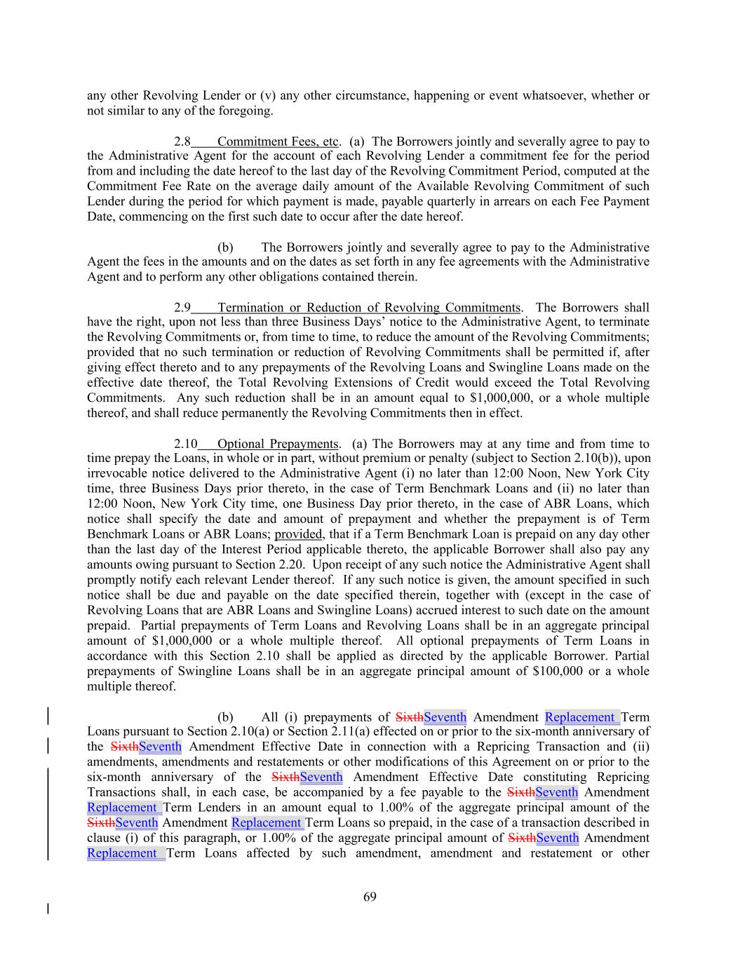 any other Revolving Lender or (v) any other circumstance, happening or event whatsoever, whether or not similar to any of the foregoing. 2.8 Commitment Fees, etc. (a) The Borrowers jointly and severally agree to pay to the Administrative Agent for the account of each Revolving Lender a commitment fee for the period from and including the date hereof to the last day of the Revolving Commitment Period, computed at the Commitment Fee Rate on the average daily amount of the Available Revolving Commitment of such Lender during the period for which payment is made, payable quarterly in arrears on each Fee Payment Date, commencing on the first such date to occur after the date hereof. (b) The Borrowers jointly and severally agree to pay to the Administrative Agent the fees in the amounts and on the dates as set forth in any fee agreements with the Administrative Agent and to perform any other obligations contained therein. 2.9 Termination or Reduction of Revolving Commitments. The Borrowers shall have the right, upon not less than three Business Days’ notice to the Administrative Agent, to terminate the Revolving Commitments or, from time to time, to reduce the amount of the Revolving Commitments; provided that no such termination or reduction of Revolving Commitments shall be permitted if, after giving effect thereto and to any prepayments of the Revolving Loans and Swingline Loans made on the effective date thereof, the Total Revolving Extensions of Credit would exceed the Total Revolving Commitments. Any such reduction shall be in an amount equal to $1,000,000, or a whole multiple thereof, and shall reduce permanently the Revolving Commitments then in effect. 2.10 Optional Prepayments. (a) The Borrowers may at any time and from time to time prepay the Loans, in whole or in part, without premium or penalty (subject to Section 2.10(b)), upon irrevocable notice delivered to the Administrative Agent (i) no later than 12:00 Noon, New York City time, three Business Days prior thereto, in the case of Term Benchmark Loans and (ii) no later than 12:00 Noon, New York City time, one Business Day prior thereto, in the case of ABR Loans, which notice shall specify the date and amount of prepayment and whether the prepayment is of Term Benchmark Loans or ABR Loans; provided, that if a Term Benchmark Loan is prepaid on any day other than the last day of the Interest Period applicable thereto, the applicable Borrower shall also pay any amounts owing pursuant to Section 2.20. Upon receipt of any such notice the Administrative Agent shall promptly notify each relevant Lender thereof. If any such notice is given, the amount specified in such notice shall be due and payable on the date specified therein, together with (except in the case of Revolving Loans that are ABR Loans and Swingline Loans) accrued interest to such date on the amount prepaid. Partial prepayments of Term Loans and Revolving Loans shall be in an aggregate principal amount of $1,000,000 or a whole multiple thereof. All optional prepayments of Term Loans in accordance with this Section 2.10 shall be applied as directed by the applicable Borrower. Partial prepayments of Swingline Loans shall be in an aggregate principal amount of $100,000 or a whole multiple thereof. (b) All (i) prepayments of SixthSeventh Amendment Replacement Term Loans pursuant to Section 2.10(a) or Section 2.11(a) effected on or prior to the six-month anniversary of the SixthSeventh Amendment Effective Date in connection with a Repricing Transaction and (ii) amendments, amendments and restatements or other modifications of this Agreement on or prior to the six-month anniversary of the SixthSeventh Amendment Effective Date constituting Repricing Transactions shall, in each case, be accompanied by a fee payable to the SixthSeventh Amendment Replacement Term Lenders in an amount equal to 1.00% of the aggregate principal amount of the SixthSeventh Amendment Replacement Term Loans so prepaid, in the case of a transaction described in clause (i) of this paragraph, or 1.00% of the aggregate principal amount of SixthSeventh Amendment Replacement Term Loans affected by such amendment, amendment and restatement or other 69