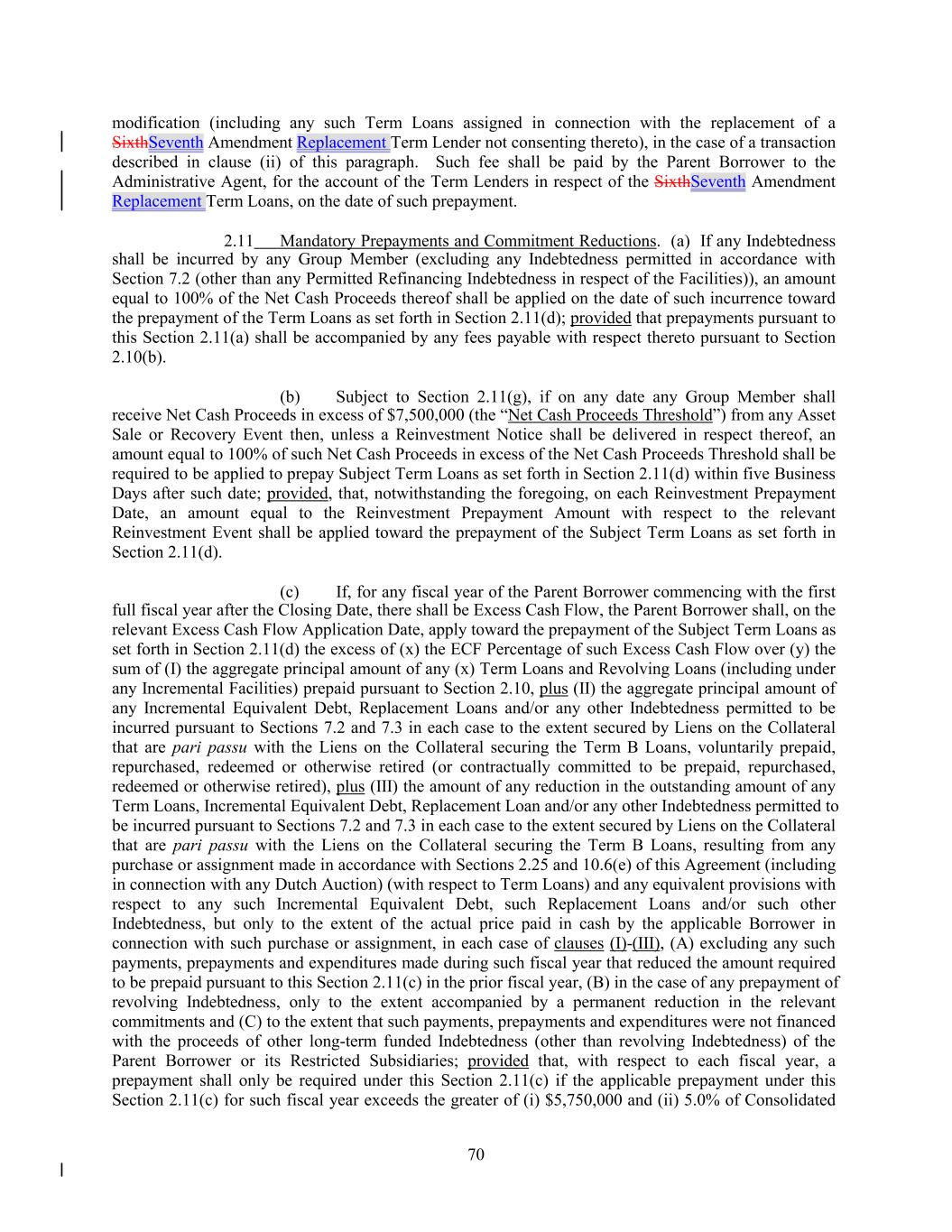 modification (including any such Term Loans assigned in connection with the replacement of a SixthSeventh Amendment Replacement Term Lender not consenting thereto), in the case of a transaction described in clause (ii) of this paragraph. Such fee shall be paid by the Parent Borrower to the Administrative Agent, for the account of the Term Lenders in respect of the SixthSeventh Amendment Replacement Term Loans, on the date of such prepayment. 2.11 Mandatory Prepayments and Commitment Reductions. (a) If any Indebtedness shall be incurred by any Group Member (excluding any Indebtedness permitted in accordance with Section 7.2 (other than any Permitted Refinancing Indebtedness in respect of the Facilities)), an amount equal to 100% of the Net Cash Proceeds thereof shall be applied on the date of such incurrence toward the prepayment of the Term Loans as set forth in Section 2.11(d); provided that prepayments pursuant to this Section 2.11(a) shall be accompanied by any fees payable with respect thereto pursuant to Section 2.10(b). (b) Subject to Section 2.11(g), if on any date any Group Member shall receive Net Cash Proceeds in excess of $7,500,000 (the “Net Cash Proceeds Threshold”) from any Asset Sale or Recovery Event then, unless a Reinvestment Notice shall be delivered in respect thereof, an amount equal to 100% of such Net Cash Proceeds in excess of the Net Cash Proceeds Threshold shall be required to be applied to prepay Subject Term Loans as set forth in Section 2.11(d) within five Business Days after such date; provided, that, notwithstanding the foregoing, on each Reinvestment Prepayment Date, an amount equal to the Reinvestment Prepayment Amount with respect to the relevant Reinvestment Event shall be applied toward the prepayment of the Subject Term Loans as set forth in Section 2.11(d). (c) If, for any fiscal year of the Parent Borrower commencing with the first full fiscal year after the Closing Date, there shall be Excess Cash Flow, the Parent Borrower shall, on the relevant Excess Cash Flow Application Date, apply toward the prepayment of the Subject Term Loans as set forth in Section 2.11(d) the excess of (x) the ECF Percentage of such Excess Cash Flow over (y) the sum of (I) the aggregate principal amount of any (x) Term Loans and Revolving Loans (including under any Incremental Facilities) prepaid pursuant to Section 2.10, plus (II) the aggregate principal amount of any Incremental Equivalent Debt, Replacement Loans and/or any other Indebtedness permitted to be incurred pursuant to Sections 7.2 and 7.3 in each case to the extent secured by Liens on the Collateral that are pari passu with the Liens on the Collateral securing the Term B Loans, voluntarily prepaid, repurchased, redeemed or otherwise retired (or contractually committed to be prepaid, repurchased, redeemed or otherwise retired), plus (III) the amount of any reduction in the outstanding amount of any Term Loans, Incremental Equivalent Debt, Replacement Loan and/or any other Indebtedness permitted to be incurred pursuant to Sections 7.2 and 7.3 in each case to the extent secured by Liens on the Collateral that are pari passu with the Liens on the Collateral securing the Term B Loans, resulting from any purchase or assignment made in accordance with Sections 2.25 and 10.6(e) of this Agreement (including in connection with any Dutch Auction) (with respect to Term Loans) and any equivalent provisions with respect to any such Incremental Equivalent Debt, such Replacement Loans and/or such other Indebtedness, but only to the extent of the actual price paid in cash by the applicable Borrower in connection with such purchase or assignment, in each case of clauses (I)-(III), (A) excluding any such payments, prepayments and expenditures made during such fiscal year that reduced the amount required to be prepaid pursuant to this Section 2.11(c) in the prior fiscal year, (B) in the case of any prepayment of revolving Indebtedness, only to the extent accompanied by a permanent reduction in the relevant commitments and (C) to the extent that such payments, prepayments and expenditures were not financed with the proceeds of other long-term funded Indebtedness (other than revolving Indebtedness) of the Parent Borrower or its Restricted Subsidiaries; provided that, with respect to each fiscal year, a prepayment shall only be required under this Section 2.11(c) if the applicable prepayment under this Section 2.11(c) for such fiscal year exceeds the greater of (i) $5,750,000 and (ii) 5.0% of Consolidated 70