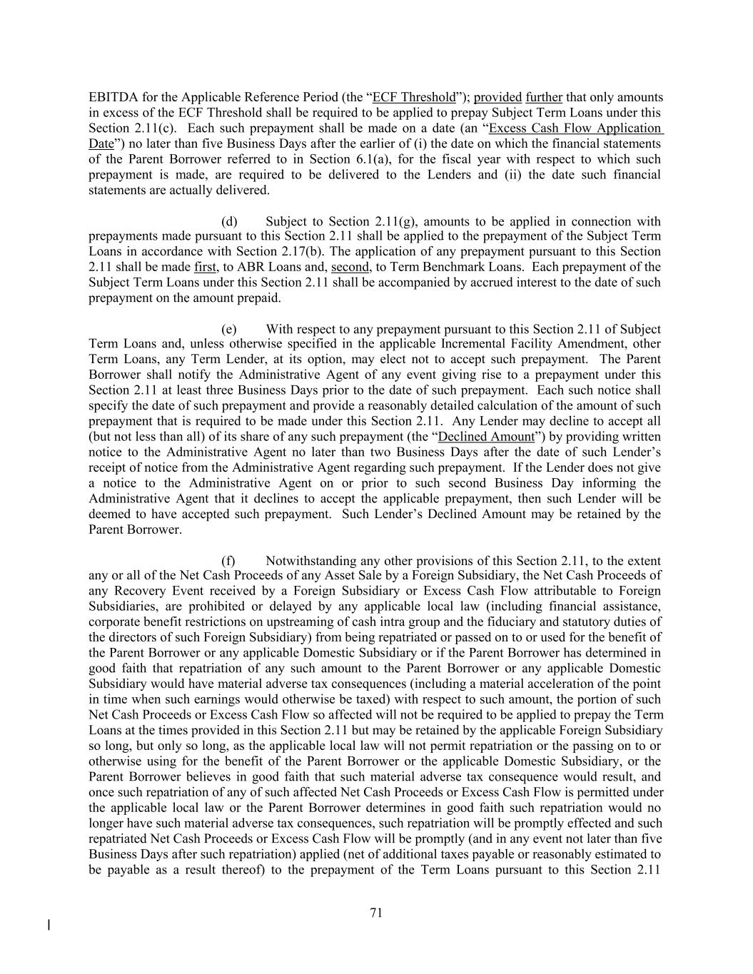 EBITDA for the Applicable Reference Period (the “ECF Threshold”); provided further that only amounts in excess of the ECF Threshold shall be required to be applied to prepay Subject Term Loans under this Section 2.11(c). Each such prepayment shall be made on a date (an “Excess Cash Flow Application Date”) no later than five Business Days after the earlier of (i) the date on which the financial statements of the Parent Borrower referred to in Section 6.1(a), for the fiscal year with respect to which such prepayment is made, are required to be delivered to the Lenders and (ii) the date such financial statements are actually delivered. (d) Subject to Section 2.11(g), amounts to be applied in connection with prepayments made pursuant to this Section 2.11 shall be applied to the prepayment of the Subject Term Loans in accordance with Section 2.17(b). The application of any prepayment pursuant to this Section 2.11 shall be made first, to ABR Loans and, second, to Term Benchmark Loans. Each prepayment of the Subject Term Loans under this Section 2.11 shall be accompanied by accrued interest to the date of such prepayment on the amount prepaid. (e) With respect to any prepayment pursuant to this Section 2.11 of Subject Term Loans and, unless otherwise specified in the applicable Incremental Facility Amendment, other Term Loans, any Term Lender, at its option, may elect not to accept such prepayment. The Parent Borrower shall notify the Administrative Agent of any event giving rise to a prepayment under this Section 2.11 at least three Business Days prior to the date of such prepayment. Each such notice shall specify the date of such prepayment and provide a reasonably detailed calculation of the amount of such prepayment that is required to be made under this Section 2.11. Any Lender may decline to accept all (but not less than all) of its share of any such prepayment (the “Declined Amount”) by providing written notice to the Administrative Agent no later than two Business Days after the date of such Lender’s receipt of notice from the Administrative Agent regarding such prepayment. If the Lender does not give a notice to the Administrative Agent on or prior to such second Business Day informing the Administrative Agent that it declines to accept the applicable prepayment, then such Lender will be deemed to have accepted such prepayment. Such Lender’s Declined Amount may be retained by the Parent Borrower. (f) Notwithstanding any other provisions of this Section 2.11, to the extent any or all of the Net Cash Proceeds of any Asset Sale by a Foreign Subsidiary, the Net Cash Proceeds of any Recovery Event received by a Foreign Subsidiary or Excess Cash Flow attributable to Foreign Subsidiaries, are prohibited or delayed by any applicable local law (including financial assistance, corporate benefit restrictions on upstreaming of cash intra group and the fiduciary and statutory duties of the directors of such Foreign Subsidiary) from being repatriated or passed on to or used for the benefit of the Parent Borrower or any applicable Domestic Subsidiary or if the Parent Borrower has determined in good faith that repatriation of any such amount to the Parent Borrower or any applicable Domestic Subsidiary would have material adverse tax consequences (including a material acceleration of the point in time when such earnings would otherwise be taxed) with respect to such amount, the portion of such Net Cash Proceeds or Excess Cash Flow so affected will not be required to be applied to prepay the Term Loans at the times provided in this Section 2.11 but may be retained by the applicable Foreign Subsidiary so long, but only so long, as the applicable local law will not permit repatriation or the passing on to or otherwise using for the benefit of the Parent Borrower or the applicable Domestic Subsidiary, or the Parent Borrower believes in good faith that such material adverse tax consequence would result, and once such repatriation of any of such affected Net Cash Proceeds or Excess Cash Flow is permitted under the applicable local law or the Parent Borrower determines in good faith such repatriation would no longer have such material adverse tax consequences, such repatriation will be promptly effected and such repatriated Net Cash Proceeds or Excess Cash Flow will be promptly (and in any event not later than five Business Days after such repatriation) applied (net of additional taxes payable or reasonably estimated to be payable as a result thereof) to the prepayment of the Term Loans pursuant to this Section 2.11 71
