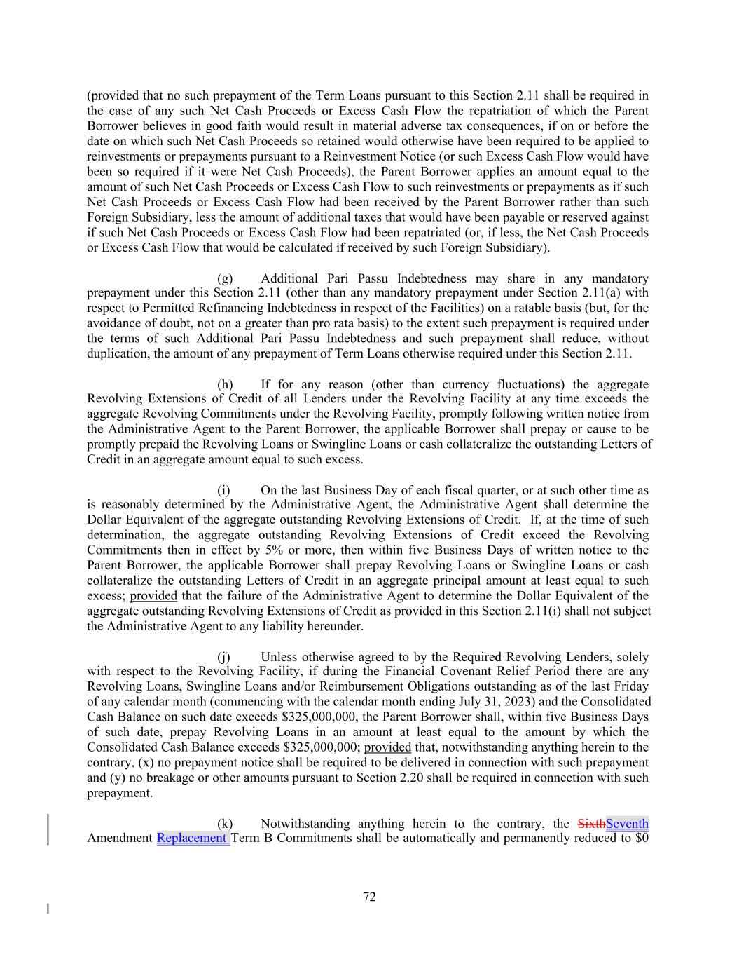 (provided that no such prepayment of the Term Loans pursuant to this Section 2.11 shall be required in the case of any such Net Cash Proceeds or Excess Cash Flow the repatriation of which the Parent Borrower believes in good faith would result in material adverse tax consequences, if on or before the date on which such Net Cash Proceeds so retained would otherwise have been required to be applied to reinvestments or prepayments pursuant to a Reinvestment Notice (or such Excess Cash Flow would have been so required if it were Net Cash Proceeds), the Parent Borrower applies an amount equal to the amount of such Net Cash Proceeds or Excess Cash Flow to such reinvestments or prepayments as if such Net Cash Proceeds or Excess Cash Flow had been received by the Parent Borrower rather than such Foreign Subsidiary, less the amount of additional taxes that would have been payable or reserved against if such Net Cash Proceeds or Excess Cash Flow had been repatriated (or, if less, the Net Cash Proceeds or Excess Cash Flow that would be calculated if received by such Foreign Subsidiary). (g) Additional Pari Passu Indebtedness may share in any mandatory prepayment under this Section 2.11 (other than any mandatory prepayment under Section 2.11(a) with respect to Permitted Refinancing Indebtedness in respect of the Facilities) on a ratable basis (but, for the avoidance of doubt, not on a greater than pro rata basis) to the extent such prepayment is required under the terms of such Additional Pari Passu Indebtedness and such prepayment shall reduce, without duplication, the amount of any prepayment of Term Loans otherwise required under this Section 2.11. (h) If for any reason (other than currency fluctuations) the aggregate Revolving Extensions of Credit of all Lenders under the Revolving Facility at any time exceeds the aggregate Revolving Commitments under the Revolving Facility, promptly following written notice from the Administrative Agent to the Parent Borrower, the applicable Borrower shall prepay or cause to be promptly prepaid the Revolving Loans or Swingline Loans or cash collateralize the outstanding Letters of Credit in an aggregate amount equal to such excess. (i) On the last Business Day of each fiscal quarter, or at such other time as is reasonably determined by the Administrative Agent, the Administrative Agent shall determine the Dollar Equivalent of the aggregate outstanding Revolving Extensions of Credit. If, at the time of such determination, the aggregate outstanding Revolving Extensions of Credit exceed the Revolving Commitments then in effect by 5% or more, then within five Business Days of written notice to the Parent Borrower, the applicable Borrower shall prepay Revolving Loans or Swingline Loans or cash collateralize the outstanding Letters of Credit in an aggregate principal amount at least equal to such excess; provided that the failure of the Administrative Agent to determine the Dollar Equivalent of the aggregate outstanding Revolving Extensions of Credit as provided in this Section 2.11(i) shall not subject the Administrative Agent to any liability hereunder. (j) Unless otherwise agreed to by the Required Revolving Lenders, solely with respect to the Revolving Facility, if during the Financial Covenant Relief Period there are any Revolving Loans, Swingline Loans and/or Reimbursement Obligations outstanding as of the last Friday of any calendar month (commencing with the calendar month ending July 31, 2023) and the Consolidated Cash Balance on such date exceeds $325,000,000, the Parent Borrower shall, within five Business Days of such date, prepay Revolving Loans in an amount at least equal to the amount by which the Consolidated Cash Balance exceeds $325,000,000; provided that, notwithstanding anything herein to the contrary, (x) no prepayment notice shall be required to be delivered in connection with such prepayment and (y) no breakage or other amounts pursuant to Section 2.20 shall be required in connection with such prepayment. (k) Notwithstanding anything herein to the contrary, the SixthSeventh Amendment Replacement Term B Commitments shall be automatically and permanently reduced to $0 72