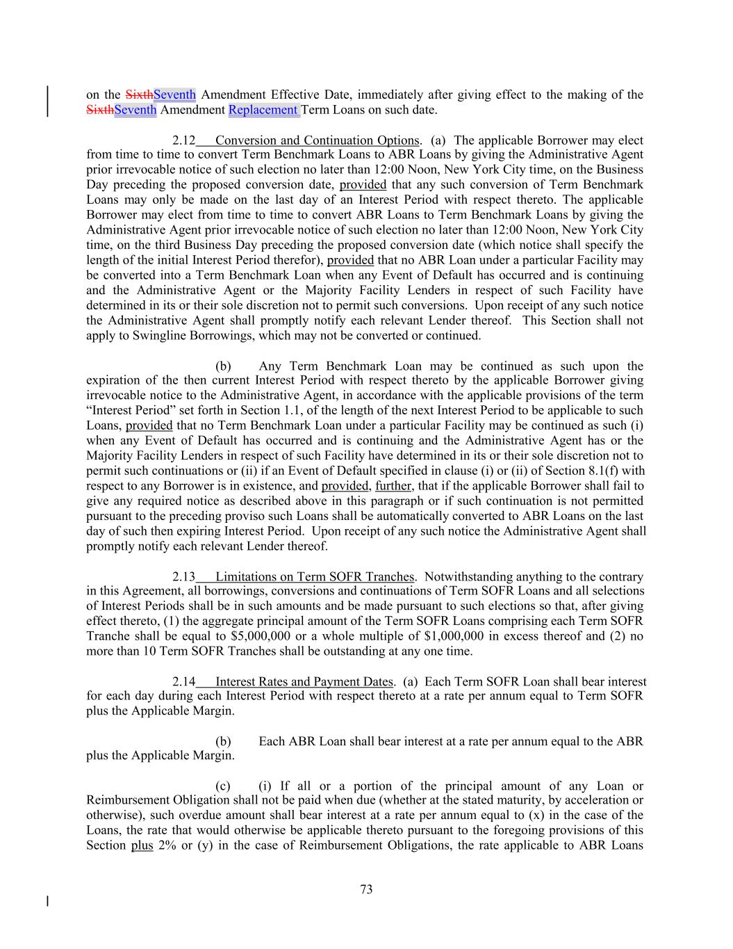 on the SixthSeventh Amendment Effective Date, immediately after giving effect to the making of the SixthSeventh Amendment Replacement Term Loans on such date. 2.12 Conversion and Continuation Options. (a) The applicable Borrower may elect from time to time to convert Term Benchmark Loans to ABR Loans by giving the Administrative Agent prior irrevocable notice of such election no later than 12:00 Noon, New York City time, on the Business Day preceding the proposed conversion date, provided that any such conversion of Term Benchmark Loans may only be made on the last day of an Interest Period with respect thereto. The applicable Borrower may elect from time to time to convert ABR Loans to Term Benchmark Loans by giving the Administrative Agent prior irrevocable notice of such election no later than 12:00 Noon, New York City time, on the third Business Day preceding the proposed conversion date (which notice shall specify the length of the initial Interest Period therefor), provided that no ABR Loan under a particular Facility may be converted into a Term Benchmark Loan when any Event of Default has occurred and is continuing and the Administrative Agent or the Majority Facility Lenders in respect of such Facility have determined in its or their sole discretion not to permit such conversions. Upon receipt of any such notice the Administrative Agent shall promptly notify each relevant Lender thereof. This Section shall not apply to Swingline Borrowings, which may not be converted or continued. (b) Any Term Benchmark Loan may be continued as such upon the expiration of the then current Interest Period with respect thereto by the applicable Borrower giving irrevocable notice to the Administrative Agent, in accordance with the applicable provisions of the term “Interest Period” set forth in Section 1.1, of the length of the next Interest Period to be applicable to such Loans, provided that no Term Benchmark Loan under a particular Facility may be continued as such (i) when any Event of Default has occurred and is continuing and the Administrative Agent has or the Majority Facility Lenders in respect of such Facility have determined in its or their sole discretion not to permit such continuations or (ii) if an Event of Default specified in clause (i) or (ii) of Section 8.1(f) with respect to any Borrower is in existence, and provided, further, that if the applicable Borrower shall fail to give any required notice as described above in this paragraph or if such continuation is not permitted pursuant to the preceding proviso such Loans shall be automatically converted to ABR Loans on the last day of such then expiring Interest Period. Upon receipt of any such notice the Administrative Agent shall promptly notify each relevant Lender thereof. 2.13 Limitations on Term SOFR Tranches. Notwithstanding anything to the contrary in this Agreement, all borrowings, conversions and continuations of Term SOFR Loans and all selections of Interest Periods shall be in such amounts and be made pursuant to such elections so that, after giving effect thereto, (1) the aggregate principal amount of the Term SOFR Loans comprising each Term SOFR Tranche shall be equal to $5,000,000 or a whole multiple of $1,000,000 in excess thereof and (2) no more than 10 Term SOFR Tranches shall be outstanding at any one time. 2.14 Interest Rates and Payment Dates. (a) Each Term SOFR Loan shall bear interest for each day during each Interest Period with respect thereto at a rate per annum equal to Term SOFR plus the Applicable Margin. (b) Each ABR Loan shall bear interest at a rate per annum equal to the ABR plus the Applicable Margin. (c) (i) If all or a portion of the principal amount of any Loan or Reimbursement Obligation shall not be paid when due (whether at the stated maturity, by acceleration or otherwise), such overdue amount shall bear interest at a rate per annum equal to (x) in the case of the Loans, the rate that would otherwise be applicable thereto pursuant to the foregoing provisions of this Section plus 2% or (y) in the case of Reimbursement Obligations, the rate applicable to ABR Loans 73