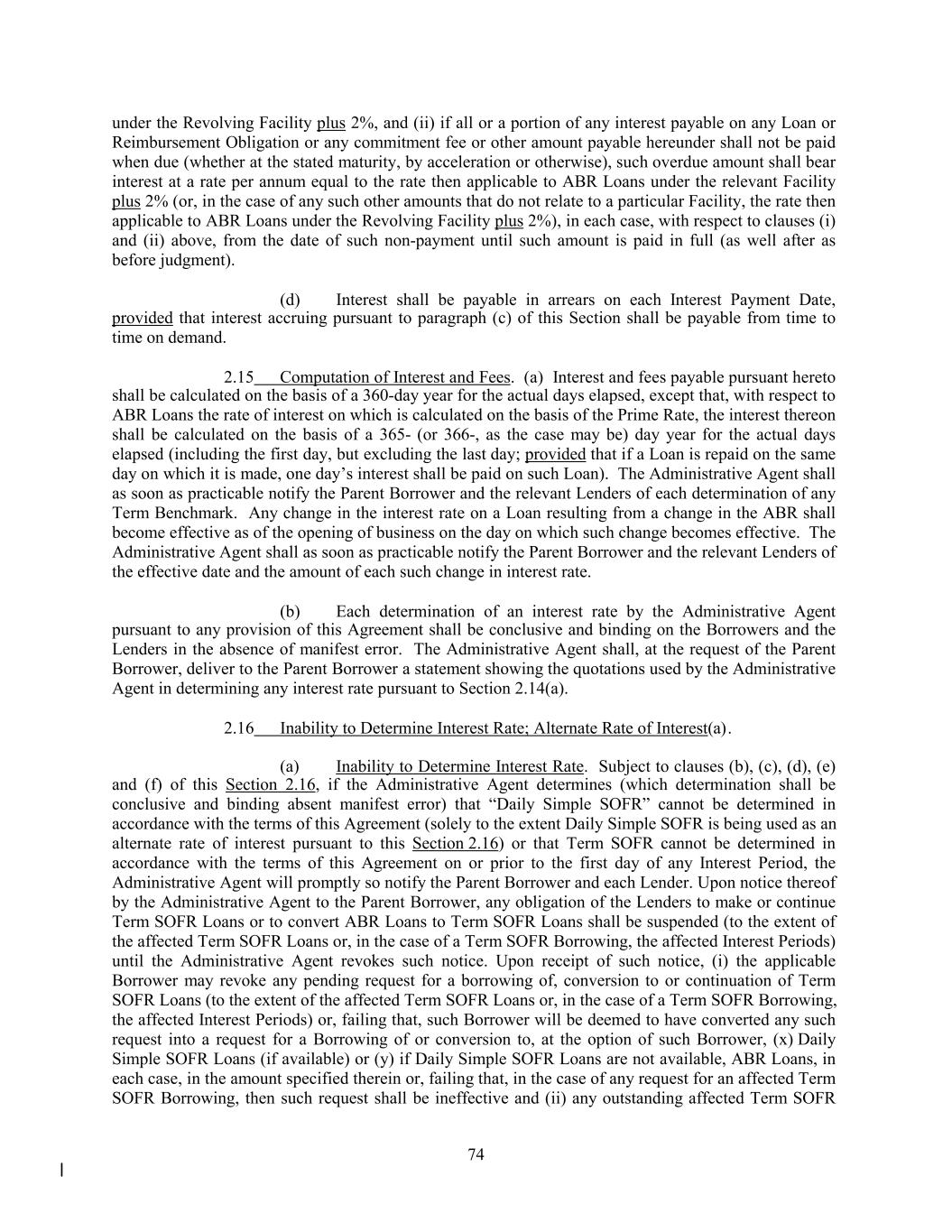 under the Revolving Facility plus 2%, and (ii) if all or a portion of any interest payable on any Loan or Reimbursement Obligation or any commitment fee or other amount payable hereunder shall not be paid when due (whether at the stated maturity, by acceleration or otherwise), such overdue amount shall bear interest at a rate per annum equal to the rate then applicable to ABR Loans under the relevant Facility plus 2% (or, in the case of any such other amounts that do not relate to a particular Facility, the rate then applicable to ABR Loans under the Revolving Facility plus 2%), in each case, with respect to clauses (i) and (ii) above, from the date of such non-payment until such amount is paid in full (as well after as before judgment). (d) Interest shall be payable in arrears on each Interest Payment Date, provided that interest accruing pursuant to paragraph (c) of this Section shall be payable from time to time on demand. 2.15 Computation of Interest and Fees. (a) Interest and fees payable pursuant hereto shall be calculated on the basis of a 360-day year for the actual days elapsed, except that, with respect to ABR Loans the rate of interest on which is calculated on the basis of the Prime Rate, the interest thereon shall be calculated on the basis of a 365- (or 366-, as the case may be) day year for the actual days elapsed (including the first day, but excluding the last day; provided that if a Loan is repaid on the same day on which it is made, one day’s interest shall be paid on such Loan). The Administrative Agent shall as soon as practicable notify the Parent Borrower and the relevant Lenders of each determination of any Term Benchmark. Any change in the interest rate on a Loan resulting from a change in the ABR shall become effective as of the opening of business on the day on which such change becomes effective. The Administrative Agent shall as soon as practicable notify the Parent Borrower and the relevant Lenders of the effective date and the amount of each such change in interest rate. (b) Each determination of an interest rate by the Administrative Agent pursuant to any provision of this Agreement shall be conclusive and binding on the Borrowers and the Lenders in the absence of manifest error. The Administrative Agent shall, at the request of the Parent Borrower, deliver to the Parent Borrower a statement showing the quotations used by the Administrative Agent in determining any interest rate pursuant to Section 2.14(a). 2.16 Inability to Determine Interest Rate; Alternate Rate of Interest(a). (a) Inability to Determine Interest Rate. Subject to clauses (b), (c), (d), (e) and (f) of this Section 2.16, if the Administrative Agent determines (which determination shall be conclusive and binding absent manifest error) that “Daily Simple SOFR” cannot be determined in accordance with the terms of this Agreement (solely to the extent Daily Simple SOFR is being used as an alternate rate of interest pursuant to this Section 2.16) or that Term SOFR cannot be determined in accordance with the terms of this Agreement on or prior to the first day of any Interest Period, the Administrative Agent will promptly so notify the Parent Borrower and each Lender. Upon notice thereof by the Administrative Agent to the Parent Borrower, any obligation of the Lenders to make or continue Term SOFR Loans or to convert ABR Loans to Term SOFR Loans shall be suspended (to the extent of the affected Term SOFR Loans or, in the case of a Term SOFR Borrowing, the affected Interest Periods) until the Administrative Agent revokes such notice. Upon receipt of such notice, (i) the applicable Borrower may revoke any pending request for a borrowing of, conversion to or continuation of Term SOFR Loans (to the extent of the affected Term SOFR Loans or, in the case of a Term SOFR Borrowing, the affected Interest Periods) or, failing that, such Borrower will be deemed to have converted any such request into a request for a Borrowing of or conversion to, at the option of such Borrower, (x) Daily Simple SOFR Loans (if available) or (y) if Daily Simple SOFR Loans are not available, ABR Loans, in each case, in the amount specified therein or, failing that, in the case of any request for an affected Term SOFR Borrowing, then such request shall be ineffective and (ii) any outstanding affected Term SOFR 74
