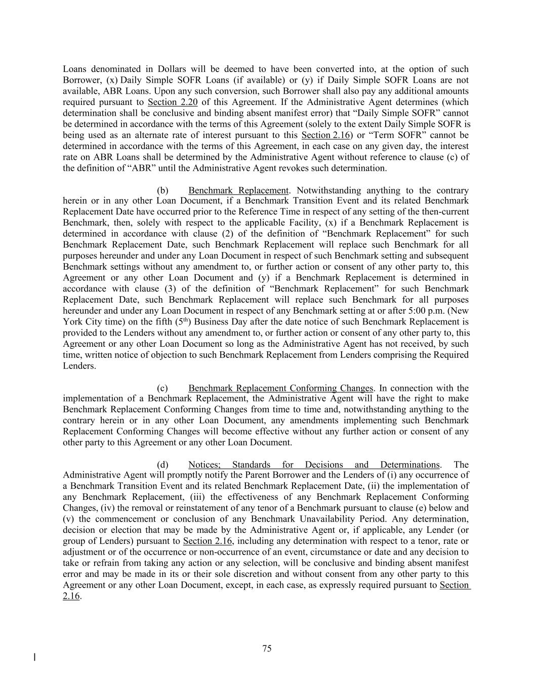 Loans denominated in Dollars will be deemed to have been converted into, at the option of such Borrower, (x) Daily Simple SOFR Loans (if available) or (y) if Daily Simple SOFR Loans are not available, ABR Loans. Upon any such conversion, such Borrower shall also pay any additional amounts required pursuant to Section 2.20 of this Agreement. If the Administrative Agent determines (which determination shall be conclusive and binding absent manifest error) that “Daily Simple SOFR” cannot be determined in accordance with the terms of this Agreement (solely to the extent Daily Simple SOFR is being used as an alternate rate of interest pursuant to this Section 2.16) or “Term SOFR” cannot be determined in accordance with the terms of this Agreement, in each case on any given day, the interest rate on ABR Loans shall be determined by the Administrative Agent without reference to clause (c) of the definition of “ABR” until the Administrative Agent revokes such determination. (b) Benchmark Replacement. Notwithstanding anything to the contrary herein or in any other Loan Document, if a Benchmark Transition Event and its related Benchmark Replacement Date have occurred prior to the Reference Time in respect of any setting of the then-current Benchmark, then, solely with respect to the applicable Facility, (x) if a Benchmark Replacement is determined in accordance with clause (2) of the definition of “Benchmark Replacement” for such Benchmark Replacement Date, such Benchmark Replacement will replace such Benchmark for all purposes hereunder and under any Loan Document in respect of such Benchmark setting and subsequent Benchmark settings without any amendment to, or further action or consent of any other party to, this Agreement or any other Loan Document and (y) if a Benchmark Replacement is determined in accordance with clause (3) of the definition of “Benchmark Replacement” for such Benchmark Replacement Date, such Benchmark Replacement will replace such Benchmark for all purposes hereunder and under any Loan Document in respect of any Benchmark setting at or after 5:00 p.m. (New York City time) on the fifth (5th) Business Day after the date notice of such Benchmark Replacement is provided to the Lenders without any amendment to, or further action or consent of any other party to, this Agreement or any other Loan Document so long as the Administrative Agent has not received, by such time, written notice of objection to such Benchmark Replacement from Lenders comprising the Required Lenders. (c) Benchmark Replacement Conforming Changes. In connection with the implementation of a Benchmark Replacement, the Administrative Agent will have the right to make Benchmark Replacement Conforming Changes from time to time and, notwithstanding anything to the contrary herein or in any other Loan Document, any amendments implementing such Benchmark Replacement Conforming Changes will become effective without any further action or consent of any other party to this Agreement or any other Loan Document. (d) Notices; Standards for Decisions and Determinations. The Administrative Agent will promptly notify the Parent Borrower and the Lenders of (i) any occurrence of a Benchmark Transition Event and its related Benchmark Replacement Date, (ii) the implementation of any Benchmark Replacement, (iii) the effectiveness of any Benchmark Replacement Conforming Changes, (iv) the removal or reinstatement of any tenor of a Benchmark pursuant to clause (e) below and (v) the commencement or conclusion of any Benchmark Unavailability Period. Any determination, decision or election that may be made by the Administrative Agent or, if applicable, any Lender (or group of Lenders) pursuant to Section 2.16, including any determination with respect to a tenor, rate or adjustment or of the occurrence or non-occurrence of an event, circumstance or date and any decision to take or refrain from taking any action or any selection, will be conclusive and binding absent manifest error and may be made in its or their sole discretion and without consent from any other party to this Agreement or any other Loan Document, except, in each case, as expressly required pursuant to Section 2.16. 75