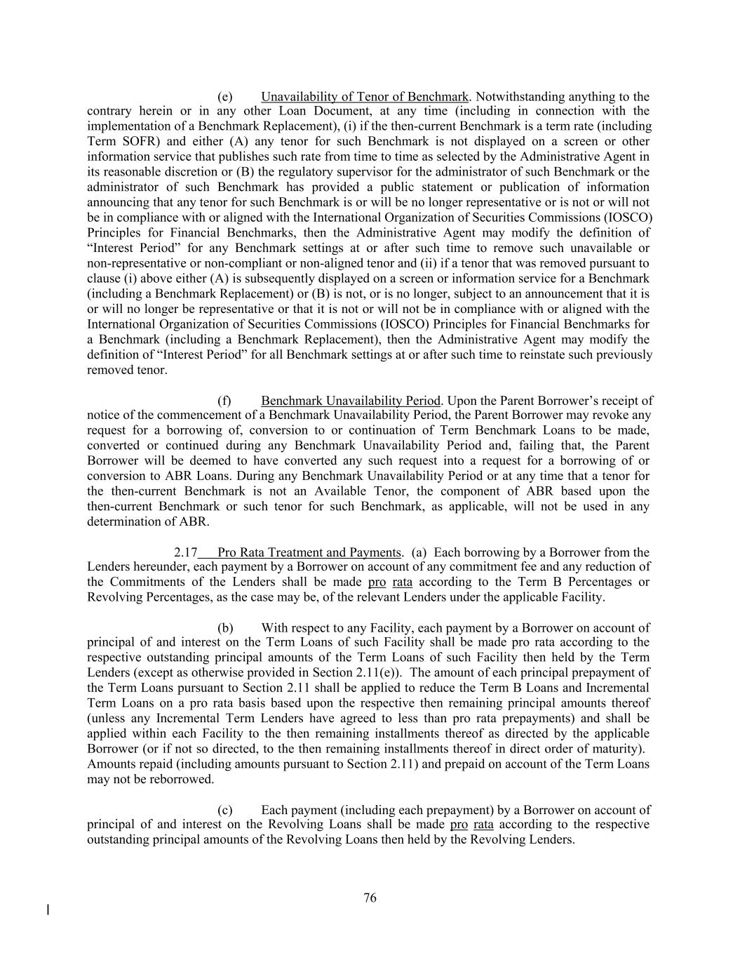 (e) Unavailability of Tenor of Benchmark. Notwithstanding anything to the contrary herein or in any other Loan Document, at any time (including in connection with the implementation of a Benchmark Replacement), (i) if the then-current Benchmark is a term rate (including Term SOFR) and either (A) any tenor for such Benchmark is not displayed on a screen or other information service that publishes such rate from time to time as selected by the Administrative Agent in its reasonable discretion or (B) the regulatory supervisor for the administrator of such Benchmark or the administrator of such Benchmark has provided a public statement or publication of information announcing that any tenor for such Benchmark is or will be no longer representative or is not or will not be in compliance with or aligned with the International Organization of Securities Commissions (IOSCO) Principles for Financial Benchmarks, then the Administrative Agent may modify the definition of “Interest Period” for any Benchmark settings at or after such time to remove such unavailable or non-representative or non-compliant or non-aligned tenor and (ii) if a tenor that was removed pursuant to clause (i) above either (A) is subsequently displayed on a screen or information service for a Benchmark (including a Benchmark Replacement) or (B) is not, or is no longer, subject to an announcement that it is or will no longer be representative or that it is not or will not be in compliance with or aligned with the International Organization of Securities Commissions (IOSCO) Principles for Financial Benchmarks for a Benchmark (including a Benchmark Replacement), then the Administrative Agent may modify the definition of “Interest Period” for all Benchmark settings at or after such time to reinstate such previously removed tenor. (f) Benchmark Unavailability Period. Upon the Parent Borrower’s receipt of notice of the commencement of a Benchmark Unavailability Period, the Parent Borrower may revoke any request for a borrowing of, conversion to or continuation of Term Benchmark Loans to be made, converted or continued during any Benchmark Unavailability Period and, failing that, the Parent Borrower will be deemed to have converted any such request into a request for a borrowing of or conversion to ABR Loans. During any Benchmark Unavailability Period or at any time that a tenor for the then-current Benchmark is not an Available Tenor, the component of ABR based upon the then-current Benchmark or such tenor for such Benchmark, as applicable, will not be used in any determination of ABR. 2.17 Pro Rata Treatment and Payments. (a) Each borrowing by a Borrower from the Lenders hereunder, each payment by a Borrower on account of any commitment fee and any reduction of the Commitments of the Lenders shall be made pro rata according to the Term B Percentages or Revolving Percentages, as the case may be, of the relevant Lenders under the applicable Facility. (b) With respect to any Facility, each payment by a Borrower on account of principal of and interest on the Term Loans of such Facility shall be made pro rata according to the respective outstanding principal amounts of the Term Loans of such Facility then held by the Term Lenders (except as otherwise provided in Section 2.11(e)). The amount of each principal prepayment of the Term Loans pursuant to Section 2.11 shall be applied to reduce the Term B Loans and Incremental Term Loans on a pro rata basis based upon the respective then remaining principal amounts thereof (unless any Incremental Term Lenders have agreed to less than pro rata prepayments) and shall be applied within each Facility to the then remaining installments thereof as directed by the applicable Borrower (or if not so directed, to the then remaining installments thereof in direct order of maturity). Amounts repaid (including amounts pursuant to Section 2.11) and prepaid on account of the Term Loans may not be reborrowed. (c) Each payment (including each prepayment) by a Borrower on account of principal of and interest on the Revolving Loans shall be made pro rata according to the respective outstanding principal amounts of the Revolving Loans then held by the Revolving Lenders. 76