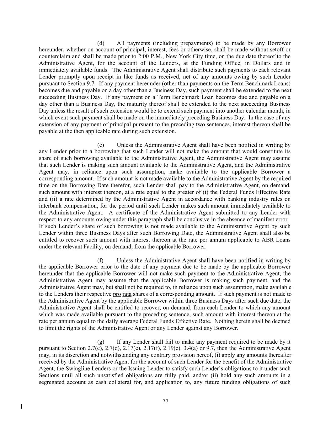 (d) All payments (including prepayments) to be made by any Borrower hereunder, whether on account of principal, interest, fees or otherwise, shall be made without setoff or counterclaim and shall be made prior to 2:00 P.M., New York City time, on the due date thereof to the Administrative Agent, for the account of the Lenders, at the Funding Office, in Dollars and in immediately available funds. The Administrative Agent shall distribute such payments to each relevant Lender promptly upon receipt in like funds as received, net of any amounts owing by such Lender pursuant to Section 9.7. If any payment hereunder (other than payments on the Term Benchmark Loans) becomes due and payable on a day other than a Business Day, such payment shall be extended to the next succeeding Business Day. If any payment on a Term Benchmark Loan becomes due and payable on a day other than a Business Day, the maturity thereof shall be extended to the next succeeding Business Day unless the result of such extension would be to extend such payment into another calendar month, in which event such payment shall be made on the immediately preceding Business Day. In the case of any extension of any payment of principal pursuant to the preceding two sentences, interest thereon shall be payable at the then applicable rate during such extension. (e) Unless the Administrative Agent shall have been notified in writing by any Lender prior to a borrowing that such Lender will not make the amount that would constitute its share of such borrowing available to the Administrative Agent, the Administrative Agent may assume that such Lender is making such amount available to the Administrative Agent, and the Administrative Agent may, in reliance upon such assumption, make available to the applicable Borrower a corresponding amount. If such amount is not made available to the Administrative Agent by the required time on the Borrowing Date therefor, such Lender shall pay to the Administrative Agent, on demand, such amount with interest thereon, at a rate equal to the greater of (i) the Federal Funds Effective Rate and (ii) a rate determined by the Administrative Agent in accordance with banking industry rules on interbank compensation, for the period until such Lender makes such amount immediately available to the Administrative Agent. A certificate of the Administrative Agent submitted to any Lender with respect to any amounts owing under this paragraph shall be conclusive in the absence of manifest error. If such Lender’s share of such borrowing is not made available to the Administrative Agent by such Lender within three Business Days after such Borrowing Date, the Administrative Agent shall also be entitled to recover such amount with interest thereon at the rate per annum applicable to ABR Loans under the relevant Facility, on demand, from the applicable Borrower. (f) Unless the Administrative Agent shall have been notified in writing by the applicable Borrower prior to the date of any payment due to be made by the applicable Borrower hereunder that the applicable Borrower will not make such payment to the Administrative Agent, the Administrative Agent may assume that the applicable Borrower is making such payment, and the Administrative Agent may, but shall not be required to, in reliance upon such assumption, make available to the Lenders their respective pro rata shares of a corresponding amount. If such payment is not made to the Administrative Agent by the applicable Borrower within three Business Days after such due date, the Administrative Agent shall be entitled to recover, on demand, from each Lender to which any amount which was made available pursuant to the preceding sentence, such amount with interest thereon at the rate per annum equal to the daily average Federal Funds Effective Rate. Nothing herein shall be deemed to limit the rights of the Administrative Agent or any Lender against any Borrower. (g) If any Lender shall fail to make any payment required to be made by it pursuant to Section 2.7(c), 2.7(d), 2.17(e), 2.17(f), 2.19(e), 3.4(a) or 9.7, then the Administrative Agent may, in its discretion and notwithstanding any contrary provision hereof, (i) apply any amounts thereafter received by the Administrative Agent for the account of such Lender for the benefit of the Administrative Agent, the Swingline Lenders or the Issuing Lender to satisfy such Lender’s obligations to it under such Sections until all such unsatisfied obligations are fully paid, and/or (ii) hold any such amounts in a segregated account as cash collateral for, and application to, any future funding obligations of such 77
