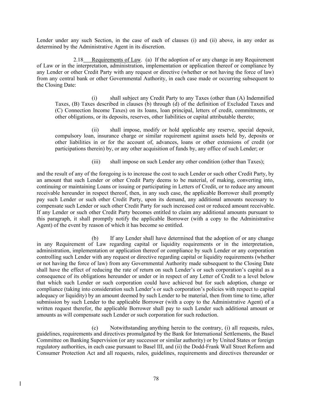 Lender under any such Section, in the case of each of clauses (i) and (ii) above, in any order as determined by the Administrative Agent in its discretion. 2.18 Requirements of Law. (a) If the adoption of or any change in any Requirement of Law or in the interpretation, administration, implementation or application thereof or compliance by any Lender or other Credit Party with any request or directive (whether or not having the force of law) from any central bank or other Governmental Authority, in each case made or occurring subsequent to the Closing Date: (i) shall subject any Credit Party to any Taxes (other than (A) Indemnified Taxes, (B) Taxes described in clauses (b) through (d) of the definition of Excluded Taxes and (C) Connection Income Taxes) on its loans, loan principal, letters of credit, commitments, or other obligations, or its deposits, reserves, other liabilities or capital attributable thereto; (ii) shall impose, modify or hold applicable any reserve, special deposit, compulsory loan, insurance charge or similar requirement against assets held by, deposits or other liabilities in or for the account of, advances, loans or other extensions of credit (or participations therein) by, or any other acquisition of funds by, any office of such Lender; or (iii) shall impose on such Lender any other condition (other than Taxes); and the result of any of the foregoing is to increase the cost to such Lender or such other Credit Party, by an amount that such Lender or other Credit Party deems to be material, of making, converting into, continuing or maintaining Loans or issuing or participating in Letters of Credit, or to reduce any amount receivable hereunder in respect thereof, then, in any such case, the applicable Borrower shall promptly pay such Lender or such other Credit Party, upon its demand, any additional amounts necessary to compensate such Lender or such other Credit Party for such increased cost or reduced amount receivable. If any Lender or such other Credit Party becomes entitled to claim any additional amounts pursuant to this paragraph, it shall promptly notify the applicable Borrower (with a copy to the Administrative Agent) of the event by reason of which it has become so entitled. (b) If any Lender shall have determined that the adoption of or any change in any Requirement of Law regarding capital or liquidity requirements or in the interpretation, administration, implementation or application thereof or compliance by such Lender or any corporation controlling such Lender with any request or directive regarding capital or liquidity requirements (whether or not having the force of law) from any Governmental Authority made subsequent to the Closing Date shall have the effect of reducing the rate of return on such Lender’s or such corporation’s capital as a consequence of its obligations hereunder or under or in respect of any Letter of Credit to a level below that which such Lender or such corporation could have achieved but for such adoption, change or compliance (taking into consideration such Lender’s or such corporation’s policies with respect to capital adequacy or liquidity) by an amount deemed by such Lender to be material, then from time to time, after submission by such Lender to the applicable Borrower (with a copy to the Administrative Agent) of a written request therefor, the applicable Borrower shall pay to such Lender such additional amount or amounts as will compensate such Lender or such corporation for such reduction. (c) Notwithstanding anything herein to the contrary, (i) all requests, rules, guidelines, requirements and directives promulgated by the Bank for International Settlements, the Basel Committee on Banking Supervision (or any successor or similar authority) or by United States or foreign regulatory authorities, in each case pursuant to Basel III, and (ii) the Dodd-Frank Wall Street Reform and Consumer Protection Act and all requests, rules, guidelines, requirements and directives thereunder or 78