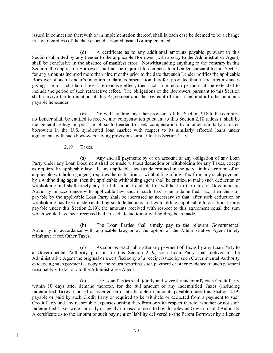 issued in connection therewith or in implementation thereof, shall in each case be deemed to be a change in law, regardless of the date enacted, adopted, issued or implemented. (d) A certificate as to any additional amounts payable pursuant to this Section submitted by any Lender to the applicable Borrower (with a copy to the Administrative Agent) shall be conclusive in the absence of manifest error. Notwithstanding anything to the contrary in this Section, the applicable Borrower shall not be required to compensate a Lender pursuant to this Section for any amounts incurred more than nine months prior to the date that such Lender notifies the applicable Borrower of such Lender’s intention to claim compensation therefor; provided that, if the circumstances giving rise to such claim have a retroactive effect, then such nine-month period shall be extended to include the period of such retroactive effect. The obligations of the Borrowers pursuant to this Section shall survive the termination of this Agreement and the payment of the Loans and all other amounts payable hereunder. (e) Notwithstanding any other provision of this Section 2.18 to the contrary, no Lender shall be entitled to receive any compensation pursuant to this Section 2.18 unless it shall be the general policy or practice of such Lender to seek compensation from other similarly situated borrowers in the U.S. syndicated loan market with respect to its similarly affected loans under agreements with such borrowers having provisions similar to this Section 2.18. 2.19 Taxes. (a) Any and all payments by or on account of any obligation of any Loan Party under any Loan Document shall be made without deduction or withholding for any Taxes, except as required by applicable law. If any applicable law (as determined in the good faith discretion of an applicable withholding agent) requires the deduction or withholding of any Tax from any such payment by a withholding agent, then the applicable withholding agent shall be entitled to make such deduction or withholding and shall timely pay the full amount deducted or withheld to the relevant Governmental Authority in accordance with applicable law and, if such Tax is an Indemnified Tax, then the sum payable by the applicable Loan Party shall be increased as necessary so that, after such deduction or withholding has been made (including such deductions and withholdings applicable to additional sums payable under this Section 2.19), the amounts received with respect to this agreement equal the sum which would have been received had no such deduction or withholding been made. (b) The Loan Parties shall timely pay to the relevant Governmental Authority in accordance with applicable law, or at the option of the Administrative Agent timely reimburse it for, Other Taxes. (c) As soon as practicable after any payment of Taxes by any Loan Party to a Governmental Authority pursuant to this Section 2.19, such Loan Party shall deliver to the Administrative Agent the original or a certified copy of a receipt issued by such Governmental Authority evidencing such payment, a copy of the return reporting such payment or other evidence of such payment reasonably satisfactory to the Administrative Agent. (d) The Loan Parties shall jointly and severally indemnify each Credit Party, within 10 days after demand therefor, for the full amount of any Indemnified Taxes (including Indemnified Taxes imposed or asserted on or attributable to amounts payable under this Section 2.19) payable or paid by such Credit Party or required to be withheld or deducted from a payment to such Credit Party and any reasonable expenses arising therefrom or with respect thereto, whether or not such Indemnified Taxes were correctly or legally imposed or asserted by the relevant Governmental Authority. A certificate as to the amount of such payment or liability delivered to the Parent Borrower by a Lender 79