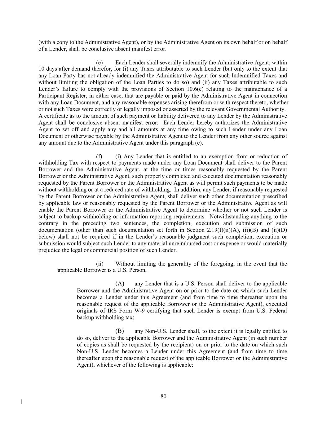 (with a copy to the Administrative Agent), or by the Administrative Agent on its own behalf or on behalf of a Lender, shall be conclusive absent manifest error. (e) Each Lender shall severally indemnify the Administrative Agent, within 10 days after demand therefor, for (i) any Taxes attributable to such Lender (but only to the extent that any Loan Party has not already indemnified the Administrative Agent for such Indemnified Taxes and without limiting the obligation of the Loan Parties to do so) and (ii) any Taxes attributable to such Lender’s failure to comply with the provisions of Section 10.6(c) relating to the maintenance of a Participant Register, in either case, that are payable or paid by the Administrative Agent in connection with any Loan Document, and any reasonable expenses arising therefrom or with respect thereto, whether or not such Taxes were correctly or legally imposed or asserted by the relevant Governmental Authority. A certificate as to the amount of such payment or liability delivered to any Lender by the Administrative Agent shall be conclusive absent manifest error. Each Lender hereby authorizes the Administrative Agent to set off and apply any and all amounts at any time owing to such Lender under any Loan Document or otherwise payable by the Administrative Agent to the Lender from any other source against any amount due to the Administrative Agent under this paragraph (e). (f) (i) Any Lender that is entitled to an exemption from or reduction of withholding Tax with respect to payments made under any Loan Document shall deliver to the Parent Borrower and the Administrative Agent, at the time or times reasonably requested by the Parent Borrower or the Administrative Agent, such properly completed and executed documentation reasonably requested by the Parent Borrower or the Administrative Agent as will permit such payments to be made without withholding or at a reduced rate of withholding. In addition, any Lender, if reasonably requested by the Parent Borrower or the Administrative Agent, shall deliver such other documentation prescribed by applicable law or reasonably requested by the Parent Borrower or the Administrative Agent as will enable the Parent Borrower or the Administrative Agent to determine whether or not such Lender is subject to backup withholding or information reporting requirements. Notwithstanding anything to the contrary in the preceding two sentences, the completion, execution and submission of such documentation (other than such documentation set forth in Section 2.19(f)(ii)(A), (ii)(B) and (ii)(D) below) shall not be required if in the Lender’s reasonable judgment such completion, execution or submission would subject such Lender to any material unreimbursed cost or expense or would materially prejudice the legal or commercial position of such Lender. (ii) Without limiting the generality of the foregoing, in the event that the applicable Borrower is a U.S. Person, (A) any Lender that is a U.S. Person shall deliver to the applicable Borrower and the Administrative Agent on or prior to the date on which such Lender becomes a Lender under this Agreement (and from time to time thereafter upon the reasonable request of the applicable Borrower or the Administrative Agent), executed originals of IRS Form W-9 certifying that such Lender is exempt from U.S. Federal backup withholding tax; (B) any Non-U.S. Lender shall, to the extent it is legally entitled to do so, deliver to the applicable Borrower and the Administrative Agent (in such number of copies as shall be requested by the recipient) on or prior to the date on which such Non-U.S. Lender becomes a Lender under this Agreement (and from time to time thereafter upon the reasonable request of the applicable Borrower or the Administrative Agent), whichever of the following is applicable: 80