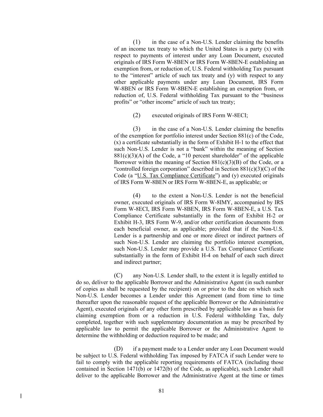 (1) in the case of a Non-U.S. Lender claiming the benefits of an income tax treaty to which the United States is a party (x) with respect to payments of interest under any Loan Document, executed originals of IRS Form W-8BEN or IRS Form W-8BEN-E establishing an exemption from, or reduction of, U.S. Federal withholding Tax pursuant to the “interest” article of such tax treaty and (y) with respect to any other applicable payments under any Loan Document, IRS Form W-8BEN or IRS Form W-8BEN-E establishing an exemption from, or reduction of, U.S. Federal withholding Tax pursuant to the “business profits” or “other income” article of such tax treaty; (2) executed originals of IRS Form W-8ECI; (3) in the case of a Non-U.S. Lender claiming the benefits of the exemption for portfolio interest under Section 881(c) of the Code, (x) a certificate substantially in the form of Exhibit H-1 to the effect that such Non-U.S. Lender is not a “bank” within the meaning of Section 881(c)(3)(A) of the Code, a “10 percent shareholder” of the applicable Borrower within the meaning of Section 881(c)(3)(B) of the Code, or a “controlled foreign corporation” described in Section 881(c)(3)(C) of the Code (a “U.S. Tax Compliance Certificate”) and (y) executed originals of IRS Form W-8BEN or IRS Form W-8BEN-E, as applicable; or (4) to the extent a Non-U.S. Lender is not the beneficial owner, executed originals of IRS Form W-8IMY, accompanied by IRS Form W-8ECI, IRS Form W-8BEN, IRS Form W-8BEN-E, a U.S. Tax Compliance Certificate substantially in the form of Exhibit H-2 or Exhibit H-3, IRS Form W-9, and/or other certification documents from each beneficial owner, as applicable; provided that if the Non-U.S. Lender is a partnership and one or more direct or indirect partners of such Non-U.S. Lender are claiming the portfolio interest exemption, such Non-U.S. Lender may provide a U.S. Tax Compliance Certificate substantially in the form of Exhibit H-4 on behalf of each such direct and indirect partner; (C) any Non-U.S. Lender shall, to the extent it is legally entitled to do so, deliver to the applicable Borrower and the Administrative Agent (in such number of copies as shall be requested by the recipient) on or prior to the date on which such Non-U.S. Lender becomes a Lender under this Agreement (and from time to time thereafter upon the reasonable request of the applicable Borrower or the Administrative Agent), executed originals of any other form prescribed by applicable law as a basis for claiming exemption from or a reduction in U.S. Federal withholding Tax, duly completed, together with such supplementary documentation as may be prescribed by applicable law to permit the applicable Borrower or the Administrative Agent to determine the withholding or deduction required to be made; and (D) if a payment made to a Lender under any Loan Document would be subject to U.S. Federal withholding Tax imposed by FATCA if such Lender were to fail to comply with the applicable reporting requirements of FATCA (including those contained in Section 1471(b) or 1472(b) of the Code, as applicable), such Lender shall deliver to the applicable Borrower and the Administrative Agent at the time or times 81
