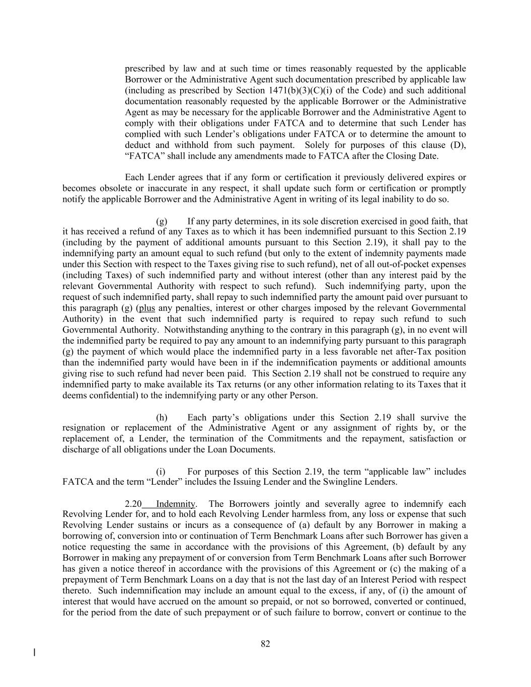 prescribed by law and at such time or times reasonably requested by the applicable Borrower or the Administrative Agent such documentation prescribed by applicable law (including as prescribed by Section 1471(b)(3)(C)(i) of the Code) and such additional documentation reasonably requested by the applicable Borrower or the Administrative Agent as may be necessary for the applicable Borrower and the Administrative Agent to comply with their obligations under FATCA and to determine that such Lender has complied with such Lender’s obligations under FATCA or to determine the amount to deduct and withhold from such payment. Solely for purposes of this clause (D), “FATCA” shall include any amendments made to FATCA after the Closing Date. Each Lender agrees that if any form or certification it previously delivered expires or becomes obsolete or inaccurate in any respect, it shall update such form or certification or promptly notify the applicable Borrower and the Administrative Agent in writing of its legal inability to do so. (g) If any party determines, in its sole discretion exercised in good faith, that it has received a refund of any Taxes as to which it has been indemnified pursuant to this Section 2.19 (including by the payment of additional amounts pursuant to this Section 2.19), it shall pay to the indemnifying party an amount equal to such refund (but only to the extent of indemnity payments made under this Section with respect to the Taxes giving rise to such refund), net of all out-of-pocket expenses (including Taxes) of such indemnified party and without interest (other than any interest paid by the relevant Governmental Authority with respect to such refund). Such indemnifying party, upon the request of such indemnified party, shall repay to such indemnified party the amount paid over pursuant to this paragraph (g) (plus any penalties, interest or other charges imposed by the relevant Governmental Authority) in the event that such indemnified party is required to repay such refund to such Governmental Authority. Notwithstanding anything to the contrary in this paragraph (g), in no event will the indemnified party be required to pay any amount to an indemnifying party pursuant to this paragraph (g) the payment of which would place the indemnified party in a less favorable net after-Tax position than the indemnified party would have been in if the indemnification payments or additional amounts giving rise to such refund had never been paid. This Section 2.19 shall not be construed to require any indemnified party to make available its Tax returns (or any other information relating to its Taxes that it deems confidential) to the indemnifying party or any other Person. (h) Each party’s obligations under this Section 2.19 shall survive the resignation or replacement of the Administrative Agent or any assignment of rights by, or the replacement of, a Lender, the termination of the Commitments and the repayment, satisfaction or discharge of all obligations under the Loan Documents. (i) For purposes of this Section 2.19, the term “applicable law” includes FATCA and the term “Lender” includes the Issuing Lender and the Swingline Lenders. 2.20 Indemnity. The Borrowers jointly and severally agree to indemnify each Revolving Lender for, and to hold each Revolving Lender harmless from, any loss or expense that such Revolving Lender sustains or incurs as a consequence of (a) default by any Borrower in making a borrowing of, conversion into or continuation of Term Benchmark Loans after such Borrower has given a notice requesting the same in accordance with the provisions of this Agreement, (b) default by any Borrower in making any prepayment of or conversion from Term Benchmark Loans after such Borrower has given a notice thereof in accordance with the provisions of this Agreement or (c) the making of a prepayment of Term Benchmark Loans on a day that is not the last day of an Interest Period with respect thereto. Such indemnification may include an amount equal to the excess, if any, of (i) the amount of interest that would have accrued on the amount so prepaid, or not so borrowed, converted or continued, for the period from the date of such prepayment or of such failure to borrow, convert or continue to the 82