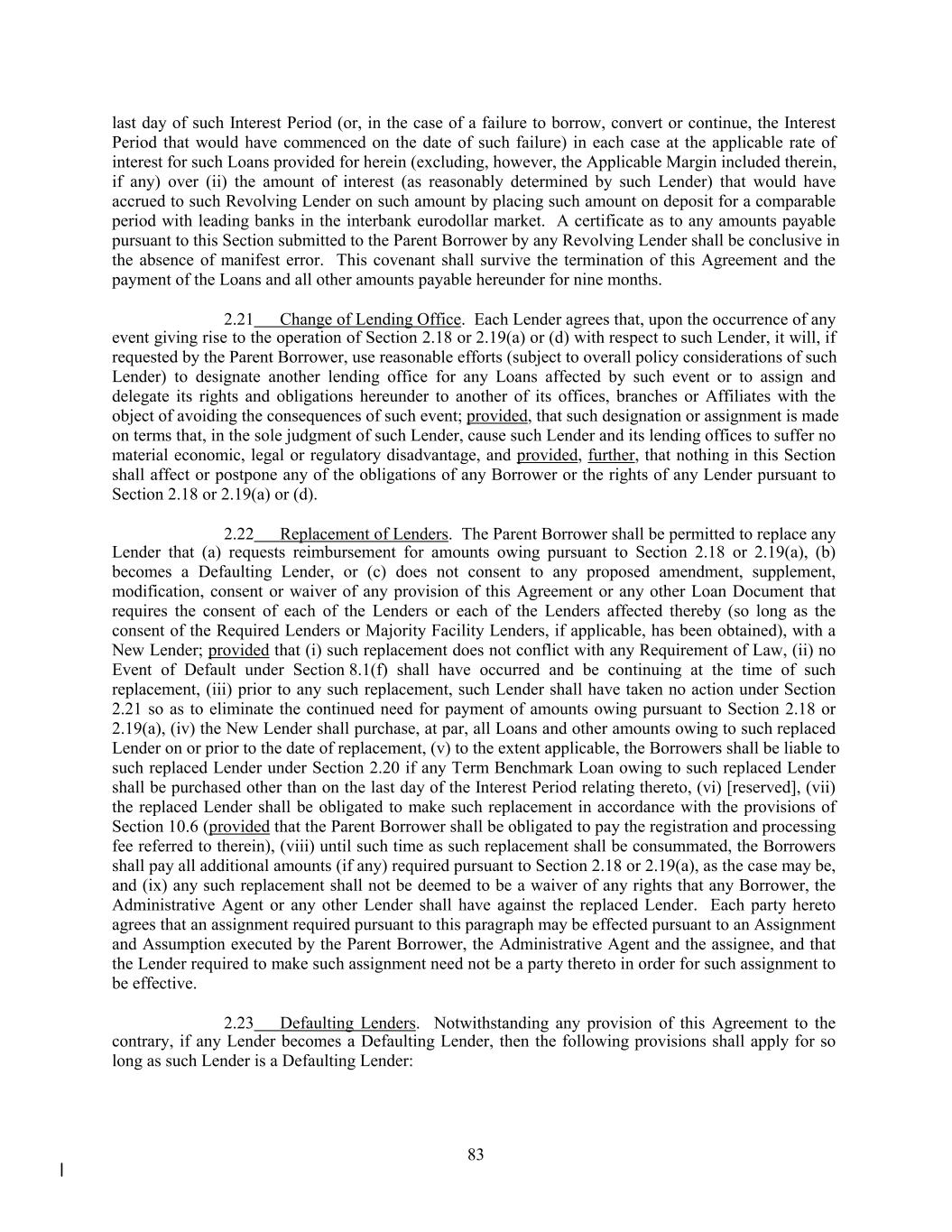 last day of such Interest Period (or, in the case of a failure to borrow, convert or continue, the Interest Period that would have commenced on the date of such failure) in each case at the applicable rate of interest for such Loans provided for herein (excluding, however, the Applicable Margin included therein, if any) over (ii) the amount of interest (as reasonably determined by such Lender) that would have accrued to such Revolving Lender on such amount by placing such amount on deposit for a comparable period with leading banks in the interbank eurodollar market. A certificate as to any amounts payable pursuant to this Section submitted to the Parent Borrower by any Revolving Lender shall be conclusive in the absence of manifest error. This covenant shall survive the termination of this Agreement and the payment of the Loans and all other amounts payable hereunder for nine months. 2.21 Change of Lending Office. Each Lender agrees that, upon the occurrence of any event giving rise to the operation of Section 2.18 or 2.19(a) or (d) with respect to such Lender, it will, if requested by the Parent Borrower, use reasonable efforts (subject to overall policy considerations of such Lender) to designate another lending office for any Loans affected by such event or to assign and delegate its rights and obligations hereunder to another of its offices, branches or Affiliates with the object of avoiding the consequences of such event; provided, that such designation or assignment is made on terms that, in the sole judgment of such Lender, cause such Lender and its lending offices to suffer no material economic, legal or regulatory disadvantage, and provided, further, that nothing in this Section shall affect or postpone any of the obligations of any Borrower or the rights of any Lender pursuant to Section 2.18 or 2.19(a) or (d). 2.22 Replacement of Lenders. The Parent Borrower shall be permitted to replace any Lender that (a) requests reimbursement for amounts owing pursuant to Section 2.18 or 2.19(a), (b) becomes a Defaulting Lender, or (c) does not consent to any proposed amendment, supplement, modification, consent or waiver of any provision of this Agreement or any other Loan Document that requires the consent of each of the Lenders or each of the Lenders affected thereby (so long as the consent of the Required Lenders or Majority Facility Lenders, if applicable, has been obtained), with a New Lender; provided that (i) such replacement does not conflict with any Requirement of Law, (ii) no Event of Default under Section 8.1(f) shall have occurred and be continuing at the time of such replacement, (iii) prior to any such replacement, such Lender shall have taken no action under Section 2.21 so as to eliminate the continued need for payment of amounts owing pursuant to Section 2.18 or 2.19(a), (iv) the New Lender shall purchase, at par, all Loans and other amounts owing to such replaced Lender on or prior to the date of replacement, (v) to the extent applicable, the Borrowers shall be liable to such replaced Lender under Section 2.20 if any Term Benchmark Loan owing to such replaced Lender shall be purchased other than on the last day of the Interest Period relating thereto, (vi) [reserved], (vii) the replaced Lender shall be obligated to make such replacement in accordance with the provisions of Section 10.6 (provided that the Parent Borrower shall be obligated to pay the registration and processing fee referred to therein), (viii) until such time as such replacement shall be consummated, the Borrowers shall pay all additional amounts (if any) required pursuant to Section 2.18 or 2.19(a), as the case may be, and (ix) any such replacement shall not be deemed to be a waiver of any rights that any Borrower, the Administrative Agent or any other Lender shall have against the replaced Lender. Each party hereto agrees that an assignment required pursuant to this paragraph may be effected pursuant to an Assignment and Assumption executed by the Parent Borrower, the Administrative Agent and the assignee, and that the Lender required to make such assignment need not be a party thereto in order for such assignment to be effective. 2.23 Defaulting Lenders. Notwithstanding any provision of this Agreement to the contrary, if any Lender becomes a Defaulting Lender, then the following provisions shall apply for so long as such Lender is a Defaulting Lender: 83