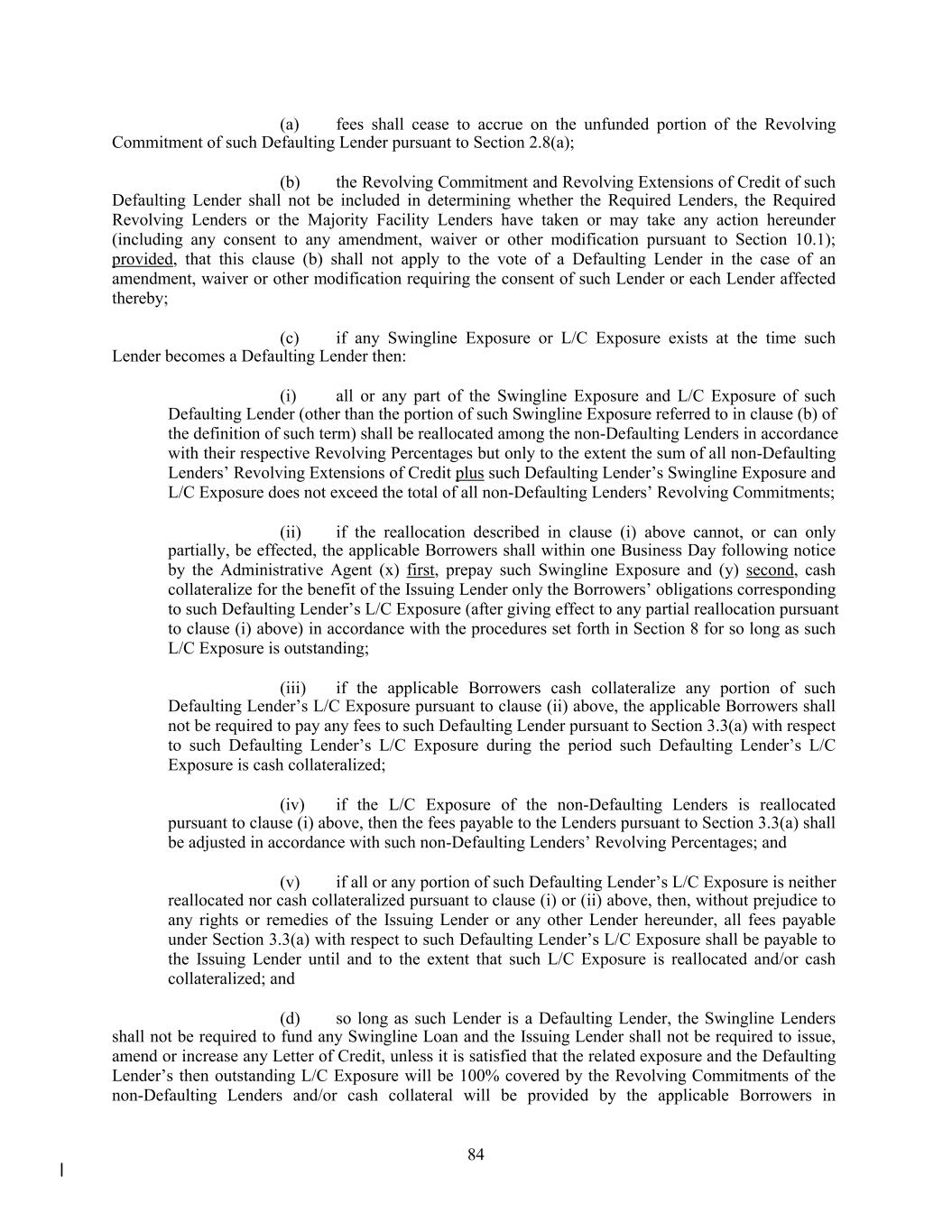 (a) fees shall cease to accrue on the unfunded portion of the Revolving Commitment of such Defaulting Lender pursuant to Section 2.8(a); (b) the Revolving Commitment and Revolving Extensions of Credit of such Defaulting Lender shall not be included in determining whether the Required Lenders, the Required Revolving Lenders or the Majority Facility Lenders have taken or may take any action hereunder (including any consent to any amendment, waiver or other modification pursuant to Section 10.1); provided, that this clause (b) shall not apply to the vote of a Defaulting Lender in the case of an amendment, waiver or other modification requiring the consent of such Lender or each Lender affected thereby; (c) if any Swingline Exposure or L/C Exposure exists at the time such Lender becomes a Defaulting Lender then: (i) all or any part of the Swingline Exposure and L/C Exposure of such Defaulting Lender (other than the portion of such Swingline Exposure referred to in clause (b) of the definition of such term) shall be reallocated among the non-Defaulting Lenders in accordance with their respective Revolving Percentages but only to the extent the sum of all non-Defaulting Lenders’ Revolving Extensions of Credit plus such Defaulting Lender’s Swingline Exposure and L/C Exposure does not exceed the total of all non-Defaulting Lenders’ Revolving Commitments; (ii) if the reallocation described in clause (i) above cannot, or can only partially, be effected, the applicable Borrowers shall within one Business Day following notice by the Administrative Agent (x) first, prepay such Swingline Exposure and (y) second, cash collateralize for the benefit of the Issuing Lender only the Borrowers’ obligations corresponding to such Defaulting Lender’s L/C Exposure (after giving effect to any partial reallocation pursuant to clause (i) above) in accordance with the procedures set forth in Section 8 for so long as such L/C Exposure is outstanding; (iii) if the applicable Borrowers cash collateralize any portion of such Defaulting Lender’s L/C Exposure pursuant to clause (ii) above, the applicable Borrowers shall not be required to pay any fees to such Defaulting Lender pursuant to Section 3.3(a) with respect to such Defaulting Lender’s L/C Exposure during the period such Defaulting Lender’s L/C Exposure is cash collateralized; (iv) if the L/C Exposure of the non-Defaulting Lenders is reallocated pursuant to clause (i) above, then the fees payable to the Lenders pursuant to Section 3.3(a) shall be adjusted in accordance with such non-Defaulting Lenders’ Revolving Percentages; and (v) if all or any portion of such Defaulting Lender’s L/C Exposure is neither reallocated nor cash collateralized pursuant to clause (i) or (ii) above, then, without prejudice to any rights or remedies of the Issuing Lender or any other Lender hereunder, all fees payable under Section 3.3(a) with respect to such Defaulting Lender’s L/C Exposure shall be payable to the Issuing Lender until and to the extent that such L/C Exposure is reallocated and/or cash collateralized; and (d) so long as such Lender is a Defaulting Lender, the Swingline Lenders shall not be required to fund any Swingline Loan and the Issuing Lender shall not be required to issue, amend or increase any Letter of Credit, unless it is satisfied that the related exposure and the Defaulting Lender’s then outstanding L/C Exposure will be 100% covered by the Revolving Commitments of the non-Defaulting Lenders and/or cash collateral will be provided by the applicable Borrowers in 84