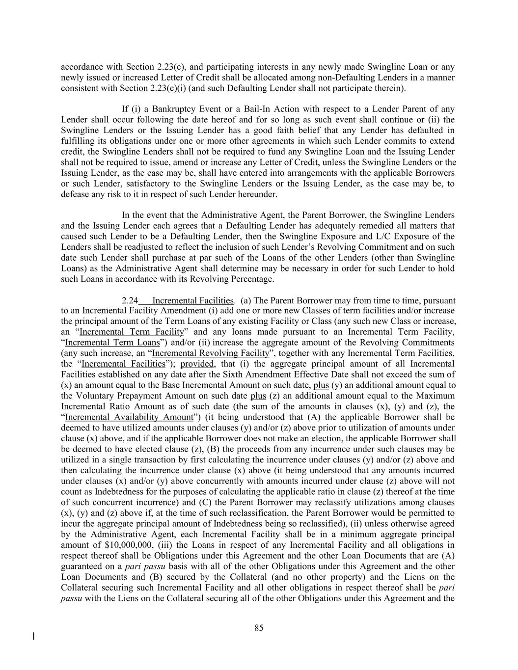 accordance with Section 2.23(c), and participating interests in any newly made Swingline Loan or any newly issued or increased Letter of Credit shall be allocated among non-Defaulting Lenders in a manner consistent with Section 2.23(c)(i) (and such Defaulting Lender shall not participate therein). If (i) a Bankruptcy Event or a Bail-In Action with respect to a Lender Parent of any Lender shall occur following the date hereof and for so long as such event shall continue or (ii) the Swingline Lenders or the Issuing Lender has a good faith belief that any Lender has defaulted in fulfilling its obligations under one or more other agreements in which such Lender commits to extend credit, the Swingline Lenders shall not be required to fund any Swingline Loan and the Issuing Lender shall not be required to issue, amend or increase any Letter of Credit, unless the Swingline Lenders or the Issuing Lender, as the case may be, shall have entered into arrangements with the applicable Borrowers or such Lender, satisfactory to the Swingline Lenders or the Issuing Lender, as the case may be, to defease any risk to it in respect of such Lender hereunder. In the event that the Administrative Agent, the Parent Borrower, the Swingline Lenders and the Issuing Lender each agrees that a Defaulting Lender has adequately remedied all matters that caused such Lender to be a Defaulting Lender, then the Swingline Exposure and L/C Exposure of the Lenders shall be readjusted to reflect the inclusion of such Lender’s Revolving Commitment and on such date such Lender shall purchase at par such of the Loans of the other Lenders (other than Swingline Loans) as the Administrative Agent shall determine may be necessary in order for such Lender to hold such Loans in accordance with its Revolving Percentage. 2.24 Incremental Facilities. (a) The Parent Borrower may from time to time, pursuant to an Incremental Facility Amendment (i) add one or more new Classes of term facilities and/or increase the principal amount of the Term Loans of any existing Facility or Class (any such new Class or increase, an “Incremental Term Facility” and any loans made pursuant to an Incremental Term Facility, “Incremental Term Loans”) and/or (ii) increase the aggregate amount of the Revolving Commitments (any such increase, an “Incremental Revolving Facility”, together with any Incremental Term Facilities, the “Incremental Facilities”); provided, that (i) the aggregate principal amount of all Incremental Facilities established on any date after the Sixth Amendment Effective Date shall not exceed the sum of (x) an amount equal to the Base Incremental Amount on such date, plus (y) an additional amount equal to the Voluntary Prepayment Amount on such date plus (z) an additional amount equal to the Maximum Incremental Ratio Amount as of such date (the sum of the amounts in clauses (x), (y) and (z), the “Incremental Availability Amount”) (it being understood that (A) the applicable Borrower shall be deemed to have utilized amounts under clauses (y) and/or (z) above prior to utilization of amounts under clause (x) above, and if the applicable Borrower does not make an election, the applicable Borrower shall be deemed to have elected clause (z), (B) the proceeds from any incurrence under such clauses may be utilized in a single transaction by first calculating the incurrence under clauses (y) and/or (z) above and then calculating the incurrence under clause (x) above (it being understood that any amounts incurred under clauses (x) and/or (y) above concurrently with amounts incurred under clause (z) above will not count as Indebtedness for the purposes of calculating the applicable ratio in clause (z) thereof at the time of such concurrent incurrence) and (C) the Parent Borrower may reclassify utilizations among clauses (x), (y) and (z) above if, at the time of such reclassification, the Parent Borrower would be permitted to incur the aggregate principal amount of Indebtedness being so reclassified), (ii) unless otherwise agreed by the Administrative Agent, each Incremental Facility shall be in a minimum aggregate principal amount of $10,000,000, (iii) the Loans in respect of any Incremental Facility and all obligations in respect thereof shall be Obligations under this Agreement and the other Loan Documents that are (A) guaranteed on a pari passu basis with all of the other Obligations under this Agreement and the other Loan Documents and (B) secured by the Collateral (and no other property) and the Liens on the Collateral securing such Incremental Facility and all other obligations in respect thereof shall be pari passu with the Liens on the Collateral securing all of the other Obligations under this Agreement and the 85