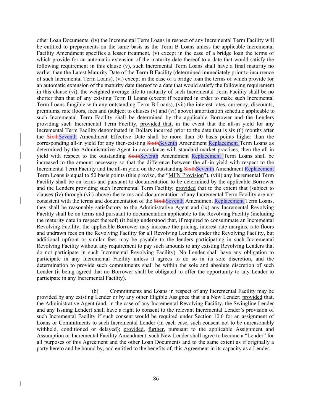 other Loan Documents, (iv) the Incremental Term Loans in respect of any Incremental Term Facility will be entitled to prepayments on the same basis as the Term B Loans unless the applicable Incremental Facility Amendment specifies a lesser treatment, (v) except in the case of a bridge loan the terms of which provide for an automatic extension of the maturity date thereof to a date that would satisfy the following requirement in this clause (v), such Incremental Term Loans shall have a final maturity no earlier than the Latest Maturity Date of the Term B Facility (determined immediately prior to incurrence of such Incremental Term Loans), (vi) except in the case of a bridge loan the terms of which provide for an automatic extension of the maturity date thereof to a date that would satisfy the following requirement in this clause (vi), the weighted average life to maturity of such Incremental Term Facility shall be no shorter than that of any existing Term B Loans (except if required in order to make such Incremental Term Loans fungible with any outstanding Term B Loans), (vii) the interest rates, currency, discounts, premiums, rate floors, fees and (subject to clauses (v) and (vi) above) amortization schedule applicable to such Incremental Term Facility shall be determined by the applicable Borrower and the Lenders providing such Incremental Term Facility, provided that, in the event that the all-in yield for any Incremental Term Facility denominated in Dollars incurred prior to the date that is six (6) months after the SixthSeventh Amendment Effective Date shall be more than 50 basis points higher than the corresponding all-in yield for any then-existing SixthSeventh Amendment Replacement Term Loans as determined by the Administrative Agent in accordance with standard market practices, then the all-in yield with respect to the outstanding SixthSeventh Amendment Replacement Term Loans shall be increased to the amount necessary so that the difference between the all-in yield with respect to the Incremental Term Facility and the all-in yield on the outstanding SixthSeventh Amendment Replacement Term Loans is equal to 50 basis points (this proviso, the “MFN Provision”), (viii) any Incremental Term Facility shall be on terms and pursuant to documentation to be determined by the applicable Borrower and the Lenders providing such Incremental Term Facility; provided that to the extent that (subject to clauses (iv) through (vii) above) the terms and documentation of any Incremental Term Facility are not consistent with the terms and documentation of the SixthSeventh Amendment Replacement Term Loans, they shall be reasonably satisfactory to the Administrative Agent and (ix) any Incremental Revolving Facility shall be on terms and pursuant to documentation applicable to the Revolving Facility (including the maturity date in respect thereof) (it being understood that, if required to consummate an Incremental Revolving Facility, the applicable Borrower may increase the pricing, interest rate margins, rate floors and undrawn fees on the Revolving Facility for all Revolving Lenders under the Revolving Facility, but additional upfront or similar fees may be payable to the lenders participating in such Incremental Revolving Facility without any requirement to pay such amounts to any existing Revolving Lenders that do not participate in such Incremental Revolving Facility). No Lender shall have any obligation to participate in any Incremental Facility unless it agrees to do so in its sole discretion, and the determination to provide such commitments shall be within the sole and absolute discretion of such Lender (it being agreed that no Borrower shall be obligated to offer the opportunity to any Lender to participate in any Incremental Facility). (b) Commitments and Loans in respect of any Incremental Facility may be provided by any existing Lender or by any other Eligible Assignee that is a New Lender; provided that, the Administrative Agent (and, in the case of any Incremental Revolving Facility, the Swingline Lender and any Issuing Lender) shall have a right to consent to the relevant Incremental Lender’s provision of such Incremental Facility if such consent would be required under Section 10.6 for an assignment of Loans or Commitments to such Incremental Lender (in each case, such consent not to be unreasonably withheld, conditioned or delayed); provided, further, pursuant to the applicable Assignment and Assumption or Incremental Facility Amendment, such New Lender shall agree to become a “Lender” for all purposes of this Agreement and the other Loan Documents and to the same extent as if originally a party hereto and be bound by, and entitled to the benefits of, this Agreement in its capacity as a Lender. 86