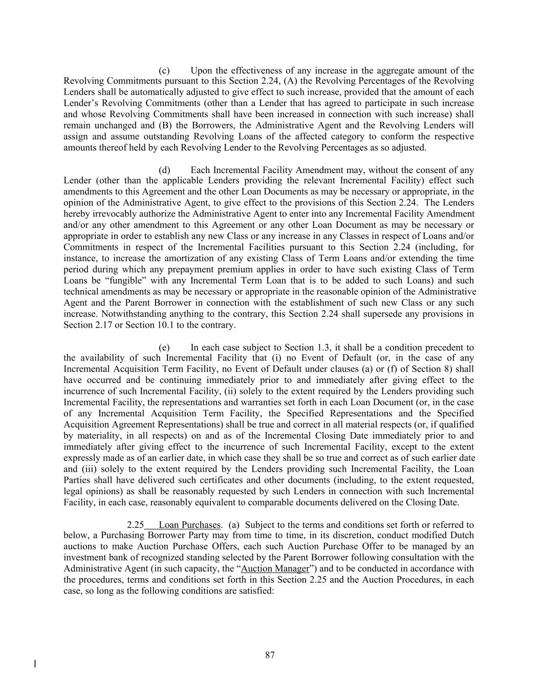 (c) Upon the effectiveness of any increase in the aggregate amount of the Revolving Commitments pursuant to this Section 2.24, (A) the Revolving Percentages of the Revolving Lenders shall be automatically adjusted to give effect to such increase, provided that the amount of each Lender’s Revolving Commitments (other than a Lender that has agreed to participate in such increase and whose Revolving Commitments shall have been increased in connection with such increase) shall remain unchanged and (B) the Borrowers, the Administrative Agent and the Revolving Lenders will assign and assume outstanding Revolving Loans of the affected category to conform the respective amounts thereof held by each Revolving Lender to the Revolving Percentages as so adjusted. (d) Each Incremental Facility Amendment may, without the consent of any Lender (other than the applicable Lenders providing the relevant Incremental Facility) effect such amendments to this Agreement and the other Loan Documents as may be necessary or appropriate, in the opinion of the Administrative Agent, to give effect to the provisions of this Section 2.24. The Lenders hereby irrevocably authorize the Administrative Agent to enter into any Incremental Facility Amendment and/or any other amendment to this Agreement or any other Loan Document as may be necessary or appropriate in order to establish any new Class or any increase in any Classes in respect of Loans and/or Commitments in respect of the Incremental Facilities pursuant to this Section 2.24 (including, for instance, to increase the amortization of any existing Class of Term Loans and/or extending the time period during which any prepayment premium applies in order to have such existing Class of Term Loans be “fungible” with any Incremental Term Loan that is to be added to such Loans) and such technical amendments as may be necessary or appropriate in the reasonable opinion of the Administrative Agent and the Parent Borrower in connection with the establishment of such new Class or any such increase. Notwithstanding anything to the contrary, this Section 2.24 shall supersede any provisions in Section 2.17 or Section 10.1 to the contrary. (e) In each case subject to Section 1.3, it shall be a condition precedent to the availability of such Incremental Facility that (i) no Event of Default (or, in the case of any Incremental Acquisition Term Facility, no Event of Default under clauses (a) or (f) of Section 8) shall have occurred and be continuing immediately prior to and immediately after giving effect to the incurrence of such Incremental Facility, (ii) solely to the extent required by the Lenders providing such Incremental Facility, the representations and warranties set forth in each Loan Document (or, in the case of any Incremental Acquisition Term Facility, the Specified Representations and the Specified Acquisition Agreement Representations) shall be true and correct in all material respects (or, if qualified by materiality, in all respects) on and as of the Incremental Closing Date immediately prior to and immediately after giving effect to the incurrence of such Incremental Facility, except to the extent expressly made as of an earlier date, in which case they shall be so true and correct as of such earlier date and (iii) solely to the extent required by the Lenders providing such Incremental Facility, the Loan Parties shall have delivered such certificates and other documents (including, to the extent requested, legal opinions) as shall be reasonably requested by such Lenders in connection with such Incremental Facility, in each case, reasonably equivalent to comparable documents delivered on the Closing Date. 2.25 Loan Purchases. (a) Subject to the terms and conditions set forth or referred to below, a Purchasing Borrower Party may from time to time, in its discretion, conduct modified Dutch auctions to make Auction Purchase Offers, each such Auction Purchase Offer to be managed by an investment bank of recognized standing selected by the Parent Borrower following consultation with the Administrative Agent (in such capacity, the “Auction Manager”) and to be conducted in accordance with the procedures, terms and conditions set forth in this Section 2.25 and the Auction Procedures, in each case, so long as the following conditions are satisfied: 87
