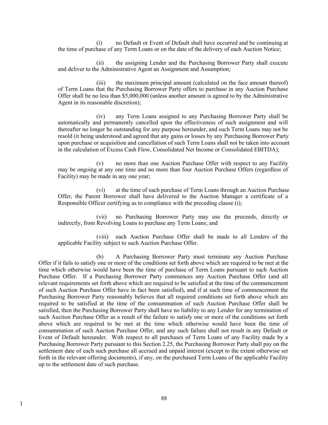 (i) no Default or Event of Default shall have occurred and be continuing at the time of purchase of any Term Loans or on the date of the delivery of each Auction Notice; (ii) the assigning Lender and the Purchasing Borrower Party shall execute and deliver to the Administrative Agent an Assignment and Assumption; (iii) the maximum principal amount (calculated on the face amount thereof) of Term Loans that the Purchasing Borrower Party offers to purchase in any Auction Purchase Offer shall be no less than $5,000,000 (unless another amount is agreed to by the Administrative Agent in its reasonable discretion); (iv) any Term Loans assigned to any Purchasing Borrower Party shall be automatically and permanently cancelled upon the effectiveness of such assignment and will thereafter no longer be outstanding for any purpose hereunder, and such Term Loans may not be resold (it being understood and agreed that any gains or losses by any Purchasing Borrower Party upon purchase or acquisition and cancellation of such Term Loans shall not be taken into account in the calculation of Excess Cash Flow, Consolidated Net Income or Consolidated EBITDA); (v) no more than one Auction Purchase Offer with respect to any Facility may be ongoing at any one time and no more than four Auction Purchase Offers (regardless of Facility) may be made in any one year; (vi) at the time of each purchase of Term Loans through an Auction Purchase Offer, the Parent Borrower shall have delivered to the Auction Manager a certificate of a Responsible Officer certifying as to compliance with the preceding clause (i); (vii) no Purchasing Borrower Party may use the proceeds, directly or indirectly, from Revolving Loans to purchase any Term Loans; and (viii) each Auction Purchase Offer shall be made to all Lenders of the applicable Facility subject to such Auction Purchase Offer. (b) A Purchasing Borrower Party must terminate any Auction Purchase Offer if it fails to satisfy one or more of the conditions set forth above which are required to be met at the time which otherwise would have been the time of purchase of Term Loans pursuant to such Auction Purchase Offer. If a Purchasing Borrower Party commences any Auction Purchase Offer (and all relevant requirements set forth above which are required to be satisfied at the time of the commencement of such Auction Purchase Offer have in fact been satisfied), and if at such time of commencement the Purchasing Borrower Party reasonably believes that all required conditions set forth above which are required to be satisfied at the time of the consummation of such Auction Purchase Offer shall be satisfied, then the Purchasing Borrower Party shall have no liability to any Lender for any termination of such Auction Purchase Offer as a result of the failure to satisfy one or more of the conditions set forth above which are required to be met at the time which otherwise would have been the time of consummation of such Auction Purchase Offer, and any such failure shall not result in any Default or Event of Default hereunder. With respect to all purchases of Term Loans of any Facility made by a Purchasing Borrower Party pursuant to this Section 2.25, the Purchasing Borrower Party shall pay on the settlement date of each such purchase all accrued and unpaid interest (except to the extent otherwise set forth in the relevant offering documents), if any, on the purchased Term Loans of the applicable Facility up to the settlement date of such purchase. 88