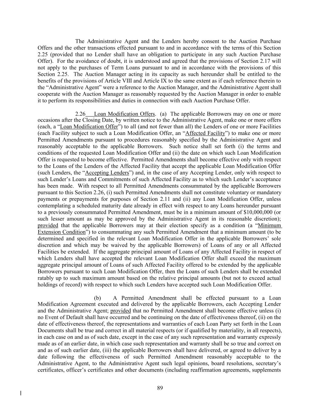 The Administrative Agent and the Lenders hereby consent to the Auction Purchase Offers and the other transactions effected pursuant to and in accordance with the terms of this Section 2.25 (provided that no Lender shall have an obligation to participate in any such Auction Purchase Offer). For the avoidance of doubt, it is understood and agreed that the provisions of Section 2.17 will not apply to the purchases of Term Loans pursuant to and in accordance with the provisions of this Section 2.25. The Auction Manager acting in its capacity as such hereunder shall be entitled to the benefits of the provisions of Article VIII and Article IX to the same extent as if each reference therein to the “Administrative Agent” were a reference to the Auction Manager, and the Administrative Agent shall cooperate with the Auction Manager as reasonably requested by the Auction Manager in order to enable it to perform its responsibilities and duties in connection with each Auction Purchase Offer. 2.26 Loan Modification Offers. (a) The applicable Borrowers may on one or more occasions after the Closing Date, by written notice to the Administrative Agent, make one or more offers (each, a “Loan Modification Offer”) to all (and not fewer than all) the Lenders of one or more Facilities (each Facility subject to such a Loan Modification Offer, an “Affected Facility”) to make one or more Permitted Amendments pursuant to procedures reasonably specified by the Administrative Agent and reasonably acceptable to the applicable Borrowers. Such notice shall set forth (i) the terms and conditions of the requested Loan Modification Offer and (ii) the date on which such Loan Modification Offer is requested to become effective. Permitted Amendments shall become effective only with respect to the Loans of the Lenders of the Affected Facility that accept the applicable Loan Modification Offer (such Lenders, the “Accepting Lenders”) and, in the case of any Accepting Lender, only with respect to such Lender’s Loans and Commitments of such Affected Facility as to which such Lender’s acceptance has been made. With respect to all Permitted Amendments consummated by the applicable Borrowers pursuant to this Section 2.26, (i) such Permitted Amendments shall not constitute voluntary or mandatory payments or prepayments for purposes of Section 2.11 and (ii) any Loan Modification Offer, unless contemplating a scheduled maturity date already in effect with respect to any Loans hereunder pursuant to a previously consummated Permitted Amendment, must be in a minimum amount of $10,000,000 (or such lesser amount as may be approved by the Administrative Agent in its reasonable discretion); provided that the applicable Borrowers may at their election specify as a condition (a “Minimum Extension Condition”) to consummating any such Permitted Amendment that a minimum amount (to be determined and specified in the relevant Loan Modification Offer in the applicable Borrowers’ sole discretion and which may be waived by the applicable Borrowers) of Loans of any or all Affected Facilities be extended. If the aggregate principal amount of Loans of any Affected Facility in respect of which Lenders shall have accepted the relevant Loan Modification Offer shall exceed the maximum aggregate principal amount of Loans of such Affected Facility offered to be extended by the applicable Borrowers pursuant to such Loan Modification Offer, then the Loans of such Lenders shall be extended ratably up to such maximum amount based on the relative principal amounts (but not to exceed actual holdings of record) with respect to which such Lenders have accepted such Loan Modification Offer. (b) A Permitted Amendment shall be effected pursuant to a Loan Modification Agreement executed and delivered by the applicable Borrowers, each Accepting Lender and the Administrative Agent; provided that no Permitted Amendment shall become effective unless (i) no Event of Default shall have occurred and be continuing on the date of effectiveness thereof, (ii) on the date of effectiveness thereof, the representations and warranties of each Loan Party set forth in the Loan Documents shall be true and correct in all material respects (or if qualified by materiality, in all respects), in each case on and as of such date, except in the case of any such representation and warranty expressly made as of an earlier date, in which case such representation and warranty shall be so true and correct on and as of such earlier date, (iii) the applicable Borrowers shall have delivered, or agreed to deliver by a date following the effectiveness of such Permitted Amendment reasonably acceptable to the Administrative Agent, to the Administrative Agent such legal opinions, board resolutions, secretary’s certificates, officer’s certificates and other documents (including reaffirmation agreements, supplements 89