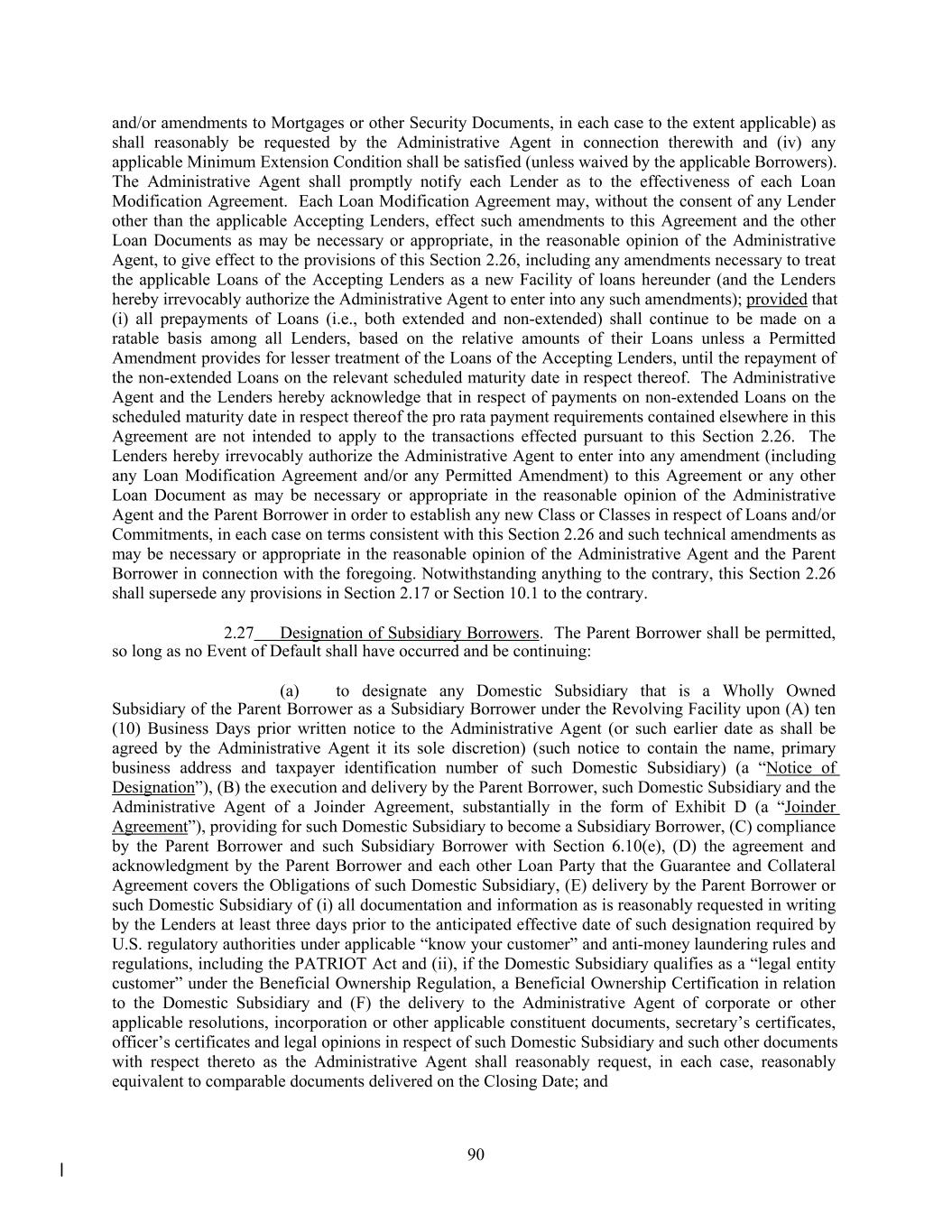 and/or amendments to Mortgages or other Security Documents, in each case to the extent applicable) as shall reasonably be requested by the Administrative Agent in connection therewith and (iv) any applicable Minimum Extension Condition shall be satisfied (unless waived by the applicable Borrowers). The Administrative Agent shall promptly notify each Lender as to the effectiveness of each Loan Modification Agreement. Each Loan Modification Agreement may, without the consent of any Lender other than the applicable Accepting Lenders, effect such amendments to this Agreement and the other Loan Documents as may be necessary or appropriate, in the reasonable opinion of the Administrative Agent, to give effect to the provisions of this Section 2.26, including any amendments necessary to treat the applicable Loans of the Accepting Lenders as a new Facility of loans hereunder (and the Lenders hereby irrevocably authorize the Administrative Agent to enter into any such amendments); provided that (i) all prepayments of Loans (i.e., both extended and non-extended) shall continue to be made on a ratable basis among all Lenders, based on the relative amounts of their Loans unless a Permitted Amendment provides for lesser treatment of the Loans of the Accepting Lenders, until the repayment of the non-extended Loans on the relevant scheduled maturity date in respect thereof. The Administrative Agent and the Lenders hereby acknowledge that in respect of payments on non-extended Loans on the scheduled maturity date in respect thereof the pro rata payment requirements contained elsewhere in this Agreement are not intended to apply to the transactions effected pursuant to this Section 2.26. The Lenders hereby irrevocably authorize the Administrative Agent to enter into any amendment (including any Loan Modification Agreement and/or any Permitted Amendment) to this Agreement or any other Loan Document as may be necessary or appropriate in the reasonable opinion of the Administrative Agent and the Parent Borrower in order to establish any new Class or Classes in respect of Loans and/or Commitments, in each case on terms consistent with this Section 2.26 and such technical amendments as may be necessary or appropriate in the reasonable opinion of the Administrative Agent and the Parent Borrower in connection with the foregoing. Notwithstanding anything to the contrary, this Section 2.26 shall supersede any provisions in Section 2.17 or Section 10.1 to the contrary. 2.27 Designation of Subsidiary Borrowers. The Parent Borrower shall be permitted, so long as no Event of Default shall have occurred and be continuing: (a) to designate any Domestic Subsidiary that is a Wholly Owned Subsidiary of the Parent Borrower as a Subsidiary Borrower under the Revolving Facility upon (A) ten (10) Business Days prior written notice to the Administrative Agent (or such earlier date as shall be agreed by the Administrative Agent it its sole discretion) (such notice to contain the name, primary business address and taxpayer identification number of such Domestic Subsidiary) (a “Notice of Designation”), (B) the execution and delivery by the Parent Borrower, such Domestic Subsidiary and the Administrative Agent of a Joinder Agreement, substantially in the form of Exhibit D (a “Joinder Agreement”), providing for such Domestic Subsidiary to become a Subsidiary Borrower, (C) compliance by the Parent Borrower and such Subsidiary Borrower with Section 6.10(e), (D) the agreement and acknowledgment by the Parent Borrower and each other Loan Party that the Guarantee and Collateral Agreement covers the Obligations of such Domestic Subsidiary, (E) delivery by the Parent Borrower or such Domestic Subsidiary of (i) all documentation and information as is reasonably requested in writing by the Lenders at least three days prior to the anticipated effective date of such designation required by U.S. regulatory authorities under applicable “know your customer” and anti-money laundering rules and regulations, including the PATRIOT Act and (ii), if the Domestic Subsidiary qualifies as a “legal entity customer” under the Beneficial Ownership Regulation, a Beneficial Ownership Certification in relation to the Domestic Subsidiary and (F) the delivery to the Administrative Agent of corporate or other applicable resolutions, incorporation or other applicable constituent documents, secretary’s certificates, officer’s certificates and legal opinions in respect of such Domestic Subsidiary and such other documents with respect thereto as the Administrative Agent shall reasonably request, in each case, reasonably equivalent to comparable documents delivered on the Closing Date; and 90