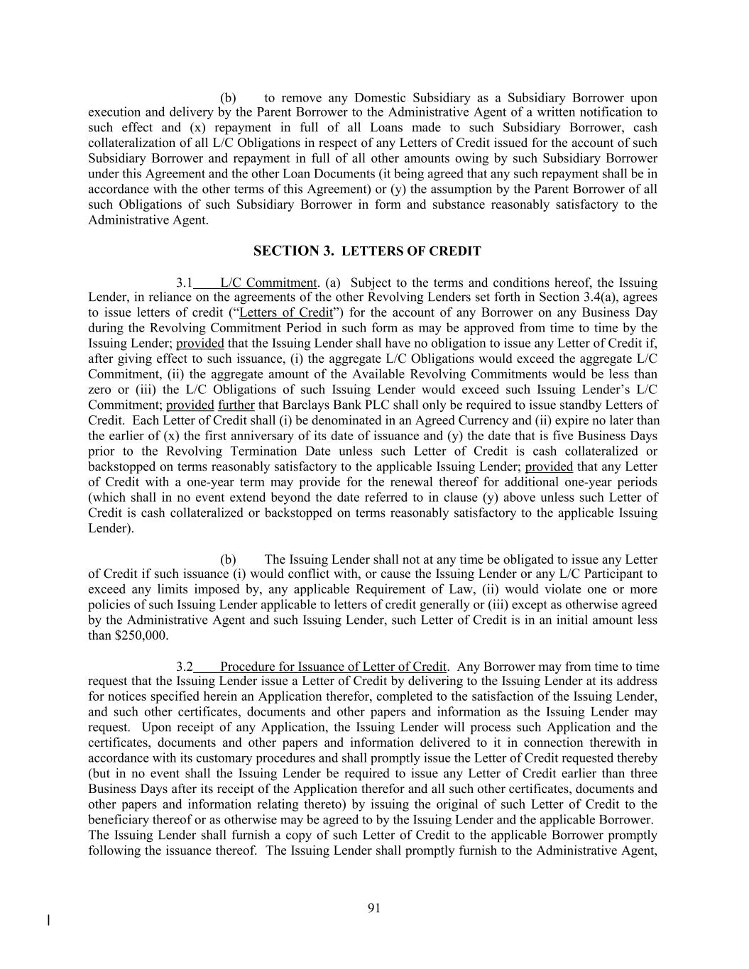 (b) to remove any Domestic Subsidiary as a Subsidiary Borrower upon execution and delivery by the Parent Borrower to the Administrative Agent of a written notification to such effect and (x) repayment in full of all Loans made to such Subsidiary Borrower, cash collateralization of all L/C Obligations in respect of any Letters of Credit issued for the account of such Subsidiary Borrower and repayment in full of all other amounts owing by such Subsidiary Borrower under this Agreement and the other Loan Documents (it being agreed that any such repayment shall be in accordance with the other terms of this Agreement) or (y) the assumption by the Parent Borrower of all such Obligations of such Subsidiary Borrower in form and substance reasonably satisfactory to the Administrative Agent. SECTION 3. LETTERS OF CREDIT 3.1 L/C Commitment. (a) Subject to the terms and conditions hereof, the Issuing Lender, in reliance on the agreements of the other Revolving Lenders set forth in Section 3.4(a), agrees to issue letters of credit (“Letters of Credit”) for the account of any Borrower on any Business Day during the Revolving Commitment Period in such form as may be approved from time to time by the Issuing Lender; provided that the Issuing Lender shall have no obligation to issue any Letter of Credit if, after giving effect to such issuance, (i) the aggregate L/C Obligations would exceed the aggregate L/C Commitment, (ii) the aggregate amount of the Available Revolving Commitments would be less than zero or (iii) the L/C Obligations of such Issuing Lender would exceed such Issuing Lender’s L/C Commitment; provided further that Barclays Bank PLC shall only be required to issue standby Letters of Credit. Each Letter of Credit shall (i) be denominated in an Agreed Currency and (ii) expire no later than the earlier of (x) the first anniversary of its date of issuance and (y) the date that is five Business Days prior to the Revolving Termination Date unless such Letter of Credit is cash collateralized or backstopped on terms reasonably satisfactory to the applicable Issuing Lender; provided that any Letter of Credit with a one-year term may provide for the renewal thereof for additional one-year periods (which shall in no event extend beyond the date referred to in clause (y) above unless such Letter of Credit is cash collateralized or backstopped on terms reasonably satisfactory to the applicable Issuing Lender). (b) The Issuing Lender shall not at any time be obligated to issue any Letter of Credit if such issuance (i) would conflict with, or cause the Issuing Lender or any L/C Participant to exceed any limits imposed by, any applicable Requirement of Law, (ii) would violate one or more policies of such Issuing Lender applicable to letters of credit generally or (iii) except as otherwise agreed by the Administrative Agent and such Issuing Lender, such Letter of Credit is in an initial amount less than $250,000. 3.2 Procedure for Issuance of Letter of Credit. Any Borrower may from time to time request that the Issuing Lender issue a Letter of Credit by delivering to the Issuing Lender at its address for notices specified herein an Application therefor, completed to the satisfaction of the Issuing Lender, and such other certificates, documents and other papers and information as the Issuing Lender may request. Upon receipt of any Application, the Issuing Lender will process such Application and the certificates, documents and other papers and information delivered to it in connection therewith in accordance with its customary procedures and shall promptly issue the Letter of Credit requested thereby (but in no event shall the Issuing Lender be required to issue any Letter of Credit earlier than three Business Days after its receipt of the Application therefor and all such other certificates, documents and other papers and information relating thereto) by issuing the original of such Letter of Credit to the beneficiary thereof or as otherwise may be agreed to by the Issuing Lender and the applicable Borrower. The Issuing Lender shall furnish a copy of such Letter of Credit to the applicable Borrower promptly following the issuance thereof. The Issuing Lender shall promptly furnish to the Administrative Agent, 91