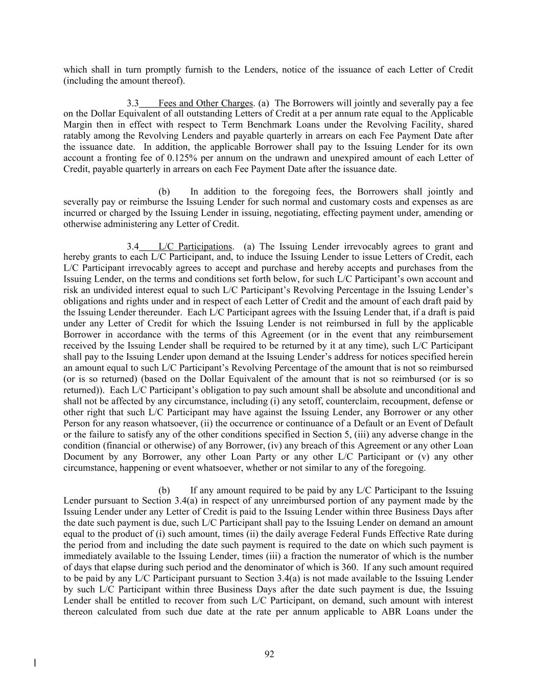which shall in turn promptly furnish to the Lenders, notice of the issuance of each Letter of Credit (including the amount thereof). 3.3 Fees and Other Charges. (a) The Borrowers will jointly and severally pay a fee on the Dollar Equivalent of all outstanding Letters of Credit at a per annum rate equal to the Applicable Margin then in effect with respect to Term Benchmark Loans under the Revolving Facility, shared ratably among the Revolving Lenders and payable quarterly in arrears on each Fee Payment Date after the issuance date. In addition, the applicable Borrower shall pay to the Issuing Lender for its own account a fronting fee of 0.125% per annum on the undrawn and unexpired amount of each Letter of Credit, payable quarterly in arrears on each Fee Payment Date after the issuance date. (b) In addition to the foregoing fees, the Borrowers shall jointly and severally pay or reimburse the Issuing Lender for such normal and customary costs and expenses as are incurred or charged by the Issuing Lender in issuing, negotiating, effecting payment under, amending or otherwise administering any Letter of Credit. 3.4 L/C Participations. (a) The Issuing Lender irrevocably agrees to grant and hereby grants to each L/C Participant, and, to induce the Issuing Lender to issue Letters of Credit, each L/C Participant irrevocably agrees to accept and purchase and hereby accepts and purchases from the Issuing Lender, on the terms and conditions set forth below, for such L/C Participant’s own account and risk an undivided interest equal to such L/C Participant’s Revolving Percentage in the Issuing Lender’s obligations and rights under and in respect of each Letter of Credit and the amount of each draft paid by the Issuing Lender thereunder. Each L/C Participant agrees with the Issuing Lender that, if a draft is paid under any Letter of Credit for which the Issuing Lender is not reimbursed in full by the applicable Borrower in accordance with the terms of this Agreement (or in the event that any reimbursement received by the Issuing Lender shall be required to be returned by it at any time), such L/C Participant shall pay to the Issuing Lender upon demand at the Issuing Lender’s address for notices specified herein an amount equal to such L/C Participant’s Revolving Percentage of the amount that is not so reimbursed (or is so returned) (based on the Dollar Equivalent of the amount that is not so reimbursed (or is so returned)). Each L/C Participant’s obligation to pay such amount shall be absolute and unconditional and shall not be affected by any circumstance, including (i) any setoff, counterclaim, recoupment, defense or other right that such L/C Participant may have against the Issuing Lender, any Borrower or any other Person for any reason whatsoever, (ii) the occurrence or continuance of a Default or an Event of Default or the failure to satisfy any of the other conditions specified in Section 5, (iii) any adverse change in the condition (financial or otherwise) of any Borrower, (iv) any breach of this Agreement or any other Loan Document by any Borrower, any other Loan Party or any other L/C Participant or (v) any other circumstance, happening or event whatsoever, whether or not similar to any of the foregoing. (b) If any amount required to be paid by any L/C Participant to the Issuing Lender pursuant to Section 3.4(a) in respect of any unreimbursed portion of any payment made by the Issuing Lender under any Letter of Credit is paid to the Issuing Lender within three Business Days after the date such payment is due, such L/C Participant shall pay to the Issuing Lender on demand an amount equal to the product of (i) such amount, times (ii) the daily average Federal Funds Effective Rate during the period from and including the date such payment is required to the date on which such payment is immediately available to the Issuing Lender, times (iii) a fraction the numerator of which is the number of days that elapse during such period and the denominator of which is 360. If any such amount required to be paid by any L/C Participant pursuant to Section 3.4(a) is not made available to the Issuing Lender by such L/C Participant within three Business Days after the date such payment is due, the Issuing Lender shall be entitled to recover from such L/C Participant, on demand, such amount with interest thereon calculated from such due date at the rate per annum applicable to ABR Loans under the 92