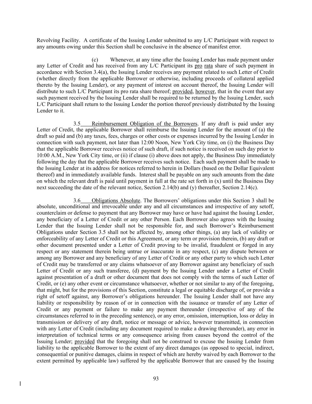 Revolving Facility. A certificate of the Issuing Lender submitted to any L/C Participant with respect to any amounts owing under this Section shall be conclusive in the absence of manifest error. (c) Whenever, at any time after the Issuing Lender has made payment under any Letter of Credit and has received from any L/C Participant its pro rata share of such payment in accordance with Section 3.4(a), the Issuing Lender receives any payment related to such Letter of Credit (whether directly from the applicable Borrower or otherwise, including proceeds of collateral applied thereto by the Issuing Lender), or any payment of interest on account thereof, the Issuing Lender will distribute to such L/C Participant its pro rata share thereof; provided, however, that in the event that any such payment received by the Issuing Lender shall be required to be returned by the Issuing Lender, such L/C Participant shall return to the Issuing Lender the portion thereof previously distributed by the Issuing Lender to it. 3.5 Reimbursement Obligation of the Borrowers. If any draft is paid under any Letter of Credit, the applicable Borrower shall reimburse the Issuing Lender for the amount of (a) the draft so paid and (b) any taxes, fees, charges or other costs or expenses incurred by the Issuing Lender in connection with such payment, not later than 12:00 Noon, New York City time, on (i) the Business Day that the applicable Borrower receives notice of such draft, if such notice is received on such day prior to 10:00 A.M., New York City time, or (ii) if clause (i) above does not apply, the Business Day immediately following the day that the applicable Borrower receives such notice. Each such payment shall be made to the Issuing Lender at its address for notices referred to herein in Dollars (based on the Dollar Equivalent thereof) and in immediately available funds. Interest shall be payable on any such amounts from the date on which the relevant draft is paid until payment in full at the rate set forth in (x) until the Business Day next succeeding the date of the relevant notice, Section 2.14(b) and (y) thereafter, Section 2.14(c). 3.6 Obligations Absolute. The Borrowers’ obligations under this Section 3 shall be absolute, unconditional and irrevocable under any and all circumstances and irrespective of any setoff, counterclaim or defense to payment that any Borrower may have or have had against the Issuing Lender, any beneficiary of a Letter of Credit or any other Person. Each Borrower also agrees with the Issuing Lender that the Issuing Lender shall not be responsible for, and such Borrower’s Reimbursement Obligations under Section 3.5 shall not be affected by, among other things, (a) any lack of validity or enforceability of any Letter of Credit or this Agreement, or any term or provision therein, (b) any draft or other document presented under a Letter of Credit proving to be invalid, fraudulent or forged in any respect or any statement therein being untrue or inaccurate in any respect, (c) any dispute between or among any Borrower and any beneficiary of any Letter of Credit or any other party to which such Letter of Credit may be transferred or any claims whatsoever of any Borrower against any beneficiary of such Letter of Credit or any such transferee, (d) payment by the Issuing Lender under a Letter of Credit against presentation of a draft or other document that does not comply with the terms of such Letter of Credit, or (e) any other event or circumstance whatsoever, whether or not similar to any of the foregoing, that might, but for the provisions of this Section, constitute a legal or equitable discharge of, or provide a right of setoff against, any Borrower’s obligations hereunder. The Issuing Lender shall not have any liability or responsibility by reason of or in connection with the issuance or transfer of any Letter of Credit or any payment or failure to make any payment thereunder (irrespective of any of the circumstances referred to in the preceding sentence), or any error, omission, interruption, loss or delay in transmission or delivery of any draft, notice or message or advice, however transmitted, in connection with any Letter of Credit (including any document required to make a drawing thereunder), any error in interpretation of technical terms or any consequence arising from causes beyond the control of the Issuing Lender; provided that the foregoing shall not be construed to excuse the Issuing Lender from liability to the applicable Borrower to the extent of any direct damages (as opposed to special, indirect, consequential or punitive damages, claims in respect of which are hereby waived by each Borrower to the extent permitted by applicable law) suffered by the applicable Borrower that are caused by the Issuing 93