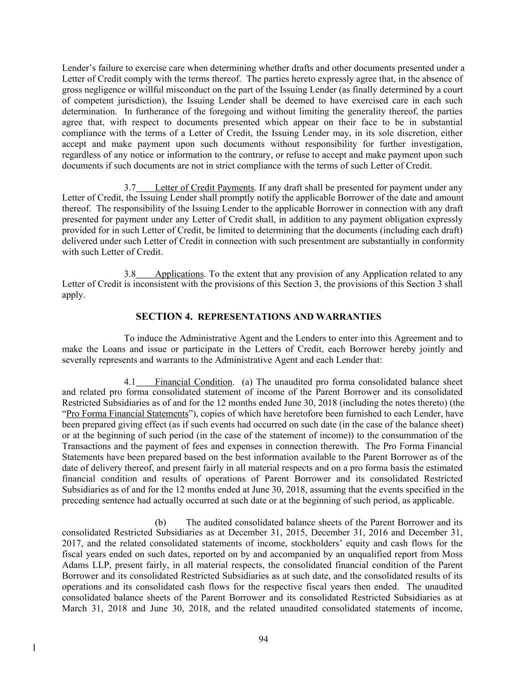 Lender’s failure to exercise care when determining whether drafts and other documents presented under a Letter of Credit comply with the terms thereof. The parties hereto expressly agree that, in the absence of gross negligence or willful misconduct on the part of the Issuing Lender (as finally determined by a court of competent jurisdiction), the Issuing Lender shall be deemed to have exercised care in each such determination. In furtherance of the foregoing and without limiting the generality thereof, the parties agree that, with respect to documents presented which appear on their face to be in substantial compliance with the terms of a Letter of Credit, the Issuing Lender may, in its sole discretion, either accept and make payment upon such documents without responsibility for further investigation, regardless of any notice or information to the contrary, or refuse to accept and make payment upon such documents if such documents are not in strict compliance with the terms of such Letter of Credit. 3.7 Letter of Credit Payments. If any draft shall be presented for payment under any Letter of Credit, the Issuing Lender shall promptly notify the applicable Borrower of the date and amount thereof. The responsibility of the Issuing Lender to the applicable Borrower in connection with any draft presented for payment under any Letter of Credit shall, in addition to any payment obligation expressly provided for in such Letter of Credit, be limited to determining that the documents (including each draft) delivered under such Letter of Credit in connection with such presentment are substantially in conformity with such Letter of Credit. 3.8 Applications. To the extent that any provision of any Application related to any Letter of Credit is inconsistent with the provisions of this Section 3, the provisions of this Section 3 shall apply. SECTION 4. REPRESENTATIONS AND WARRANTIES To induce the Administrative Agent and the Lenders to enter into this Agreement and to make the Loans and issue or participate in the Letters of Credit, each Borrower hereby jointly and severally represents and warrants to the Administrative Agent and each Lender that: 4.1 Financial Condition. (a) The unaudited pro forma consolidated balance sheet and related pro forma consolidated statement of income of the Parent Borrower and its consolidated Restricted Subsidiaries as of and for the 12 months ended June 30, 2018 (including the notes thereto) (the “Pro Forma Financial Statements”), copies of which have heretofore been furnished to each Lender, have been prepared giving effect (as if such events had occurred on such date (in the case of the balance sheet) or at the beginning of such period (in the case of the statement of income)) to the consummation of the Transactions and the payment of fees and expenses in connection therewith. The Pro Forma Financial Statements have been prepared based on the best information available to the Parent Borrower as of the date of delivery thereof, and present fairly in all material respects and on a pro forma basis the estimated financial condition and results of operations of Parent Borrower and its consolidated Restricted Subsidiaries as of and for the 12 months ended at June 30, 2018, assuming that the events specified in the preceding sentence had actually occurred at such date or at the beginning of such period, as applicable. (b) The audited consolidated balance sheets of the Parent Borrower and its consolidated Restricted Subsidiaries as at December 31, 2015, December 31, 2016 and December 31, 2017, and the related consolidated statements of income, stockholders’ equity and cash flows for the fiscal years ended on such dates, reported on by and accompanied by an unqualified report from Moss Adams LLP, present fairly, in all material respects, the consolidated financial condition of the Parent Borrower and its consolidated Restricted Subsidiaries as at such date, and the consolidated results of its operations and its consolidated cash flows for the respective fiscal years then ended. The unaudited consolidated balance sheets of the Parent Borrower and its consolidated Restricted Subsidiaries as at March 31, 2018 and June 30, 2018, and the related unaudited consolidated statements of income, 94
