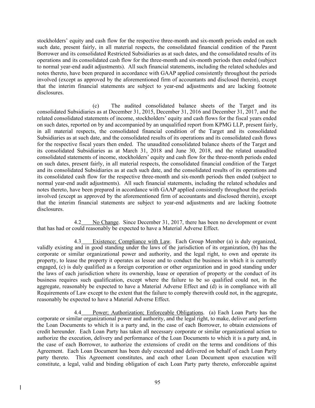 stockholders’ equity and cash flow for the respective three-month and six-month periods ended on each such date, present fairly, in all material respects, the consolidated financial condition of the Parent Borrower and its consolidated Restricted Subsidiaries as at such dates, and the consolidated results of its operations and its consolidated cash flow for the three-month and six-month periods then ended (subject to normal year-end audit adjustments). All such financial statements, including the related schedules and notes thereto, have been prepared in accordance with GAAP applied consistently throughout the periods involved (except as approved by the aforementioned firm of accountants and disclosed therein), except that the interim financial statements are subject to year-end adjustments and are lacking footnote disclosures. (c) The audited consolidated balance sheets of the Target and its consolidated Subsidiaries as at December 31, 2015, December 31, 2016 and December 31, 2017, and the related consolidated statements of income, stockholders’ equity and cash flows for the fiscal years ended on such dates, reported on by and accompanied by an unqualified report from KPMG LLP, present fairly, in all material respects, the consolidated financial condition of the Target and its consolidated Subsidiaries as at such date, and the consolidated results of its operations and its consolidated cash flows for the respective fiscal years then ended. The unaudited consolidated balance sheets of the Target and its consolidated Subsidiaries as at March 31, 2018 and June 30, 2018, and the related unaudited consolidated statements of income, stockholders’ equity and cash flow for the three-month periods ended on such dates, present fairly, in all material respects, the consolidated financial condition of the Target and its consolidated Subsidiaries as at each such date, and the consolidated results of its operations and its consolidated cash flow for the respective three-month and six-month periods then ended (subject to normal year-end audit adjustments). All such financial statements, including the related schedules and notes thereto, have been prepared in accordance with GAAP applied consistently throughout the periods involved (except as approved by the aforementioned firm of accountants and disclosed therein), except that the interim financial statements are subject to year-end adjustments and are lacking footnote disclosures. 4.2 No Change. Since December 31, 2017, there has been no development or event that has had or could reasonably be expected to have a Material Adverse Effect. 4.3 Existence; Compliance with Law. Each Group Member (a) is duly organized, validly existing and in good standing under the laws of the jurisdiction of its organization, (b) has the corporate or similar organizational power and authority, and the legal right, to own and operate its property, to lease the property it operates as lessee and to conduct the business in which it is currently engaged, (c) is duly qualified as a foreign corporation or other organization and in good standing under the laws of each jurisdiction where its ownership, lease or operation of property or the conduct of its business requires such qualification, except where the failure to be so qualified could not, in the aggregate, reasonably be expected to have a Material Adverse Effect and (d) is in compliance with all Requirements of Law except to the extent that the failure to comply therewith could not, in the aggregate, reasonably be expected to have a Material Adverse Effect. 4.4 Power; Authorization; Enforceable Obligations. (a) Each Loan Party has the corporate or similar organizational power and authority, and the legal right, to make, deliver and perform the Loan Documents to which it is a party and, in the case of each Borrower, to obtain extensions of credit hereunder. Each Loan Party has taken all necessary corporate or similar organizational action to authorize the execution, delivery and performance of the Loan Documents to which it is a party and, in the case of each Borrower, to authorize the extensions of credit on the terms and conditions of this Agreement. Each Loan Document has been duly executed and delivered on behalf of each Loan Party party thereto. This Agreement constitutes, and each other Loan Document upon execution will constitute, a legal, valid and binding obligation of each Loan Party party thereto, enforceable against 95