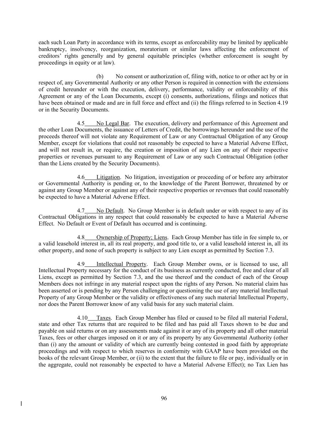 each such Loan Party in accordance with its terms, except as enforceability may be limited by applicable bankruptcy, insolvency, reorganization, moratorium or similar laws affecting the enforcement of creditors’ rights generally and by general equitable principles (whether enforcement is sought by proceedings in equity or at law). (b) No consent or authorization of, filing with, notice to or other act by or in respect of, any Governmental Authority or any other Person is required in connection with the extensions of credit hereunder or with the execution, delivery, performance, validity or enforceability of this Agreement or any of the Loan Documents, except (i) consents, authorizations, filings and notices that have been obtained or made and are in full force and effect and (ii) the filings referred to in Section 4.19 or in the Security Documents. 4.5 No Legal Bar. The execution, delivery and performance of this Agreement and the other Loan Documents, the issuance of Letters of Credit, the borrowings hereunder and the use of the proceeds thereof will not violate any Requirement of Law or any Contractual Obligation of any Group Member, except for violations that could not reasonably be expected to have a Material Adverse Effect, and will not result in, or require, the creation or imposition of any Lien on any of their respective properties or revenues pursuant to any Requirement of Law or any such Contractual Obligation (other than the Liens created by the Security Documents). 4.6 Litigation. No litigation, investigation or proceeding of or before any arbitrator or Governmental Authority is pending or, to the knowledge of the Parent Borrower, threatened by or against any Group Member or against any of their respective properties or revenues that could reasonably be expected to have a Material Adverse Effect. 4.7 No Default. No Group Member is in default under or with respect to any of its Contractual Obligations in any respect that could reasonably be expected to have a Material Adverse Effect. No Default or Event of Default has occurred and is continuing. 4.8 Ownership of Property; Liens. Each Group Member has title in fee simple to, or a valid leasehold interest in, all its real property, and good title to, or a valid leasehold interest in, all its other property, and none of such property is subject to any Lien except as permitted by Section 7.3. 4.9 Intellectual Property. Each Group Member owns, or is licensed to use, all Intellectual Property necessary for the conduct of its business as currently conducted, free and clear of all Liens, except as permitted by Section 7.3, and the use thereof and the conduct of each of the Group Members does not infringe in any material respect upon the rights of any Person. No material claim has been asserted or is pending by any Person challenging or questioning the use of any material Intellectual Property of any Group Member or the validity or effectiveness of any such material Intellectual Property, nor does the Parent Borrower know of any valid basis for any such material claim. 4.10 Taxes. Each Group Member has filed or caused to be filed all material Federal, state and other Tax returns that are required to be filed and has paid all Taxes shown to be due and payable on said returns or on any assessments made against it or any of its property and all other material Taxes, fees or other charges imposed on it or any of its property by any Governmental Authority (other than (i) any the amount or validity of which are currently being contested in good faith by appropriate proceedings and with respect to which reserves in conformity with GAAP have been provided on the books of the relevant Group Member, or (ii) to the extent that the failure to file or pay, individually or in the aggregate, could not reasonably be expected to have a Material Adverse Effect); no Tax Lien has 96