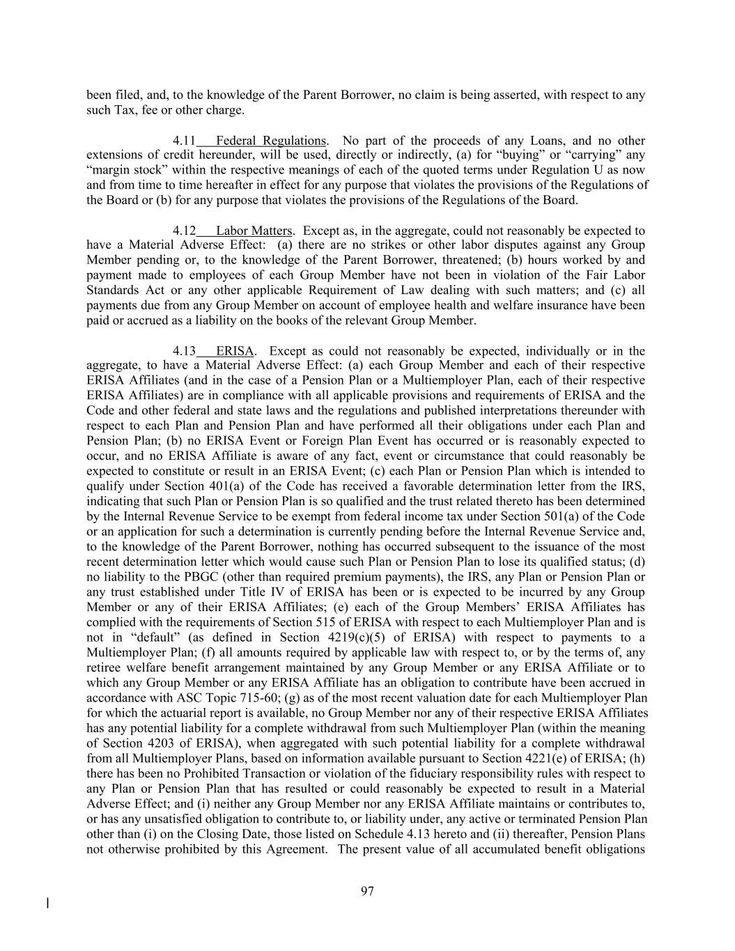 been filed, and, to the knowledge of the Parent Borrower, no claim is being asserted, with respect to any such Tax, fee or other charge. 4.11 Federal Regulations. No part of the proceeds of any Loans, and no other extensions of credit hereunder, will be used, directly or indirectly, (a) for “buying” or “carrying” any “margin stock” within the respective meanings of each of the quoted terms under Regulation U as now and from time to time hereafter in effect for any purpose that violates the provisions of the Regulations of the Board or (b) for any purpose that violates the provisions of the Regulations of the Board. 4.12 Labor Matters. Except as, in the aggregate, could not reasonably be expected to have a Material Adverse Effect: (a) there are no strikes or other labor disputes against any Group Member pending or, to the knowledge of the Parent Borrower, threatened; (b) hours worked by and payment made to employees of each Group Member have not been in violation of the Fair Labor Standards Act or any other applicable Requirement of Law dealing with such matters; and (c) all payments due from any Group Member on account of employee health and welfare insurance have been paid or accrued as a liability on the books of the relevant Group Member. 4.13 ERISA. Except as could not reasonably be expected, individually or in the aggregate, to have a Material Adverse Effect: (a) each Group Member and each of their respective ERISA Affiliates (and in the case of a Pension Plan or a Multiemployer Plan, each of their respective ERISA Affiliates) are in compliance with all applicable provisions and requirements of ERISA and the Code and other federal and state laws and the regulations and published interpretations thereunder with respect to each Plan and Pension Plan and have performed all their obligations under each Plan and Pension Plan; (b) no ERISA Event or Foreign Plan Event has occurred or is reasonably expected to occur, and no ERISA Affiliate is aware of any fact, event or circumstance that could reasonably be expected to constitute or result in an ERISA Event; (c) each Plan or Pension Plan which is intended to qualify under Section 401(a) of the Code has received a favorable determination letter from the IRS, indicating that such Plan or Pension Plan is so qualified and the trust related thereto has been determined by the Internal Revenue Service to be exempt from federal income tax under Section 501(a) of the Code or an application for such a determination is currently pending before the Internal Revenue Service and, to the knowledge of the Parent Borrower, nothing has occurred subsequent to the issuance of the most recent determination letter which would cause such Plan or Pension Plan to lose its qualified status; (d) no liability to the PBGC (other than required premium payments), the IRS, any Plan or Pension Plan or any trust established under Title IV of ERISA has been or is expected to be incurred by any Group Member or any of their ERISA Affiliates; (e) each of the Group Members’ ERISA Affiliates has complied with the requirements of Section 515 of ERISA with respect to each Multiemployer Plan and is not in “default” (as defined in Section 4219(c)(5) of ERISA) with respect to payments to a Multiemployer Plan; (f) all amounts required by applicable law with respect to, or by the terms of, any retiree welfare benefit arrangement maintained by any Group Member or any ERISA Affiliate or to which any Group Member or any ERISA Affiliate has an obligation to contribute have been accrued in accordance with ASC Topic 715-60; (g) as of the most recent valuation date for each Multiemployer Plan for which the actuarial report is available, no Group Member nor any of their respective ERISA Affiliates has any potential liability for a complete withdrawal from such Multiemployer Plan (within the meaning of Section 4203 of ERISA), when aggregated with such potential liability for a complete withdrawal from all Multiemployer Plans, based on information available pursuant to Section 4221(e) of ERISA; (h) there has been no Prohibited Transaction or violation of the fiduciary responsibility rules with respect to any Plan or Pension Plan that has resulted or could reasonably be expected to result in a Material Adverse Effect; and (i) neither any Group Member nor any ERISA Affiliate maintains or contributes to, or has any unsatisfied obligation to contribute to, or liability under, any active or terminated Pension Plan other than (i) on the Closing Date, those listed on Schedule 4.13 hereto and (ii) thereafter, Pension Plans not otherwise prohibited by this Agreement. The present value of all accumulated benefit obligations 97