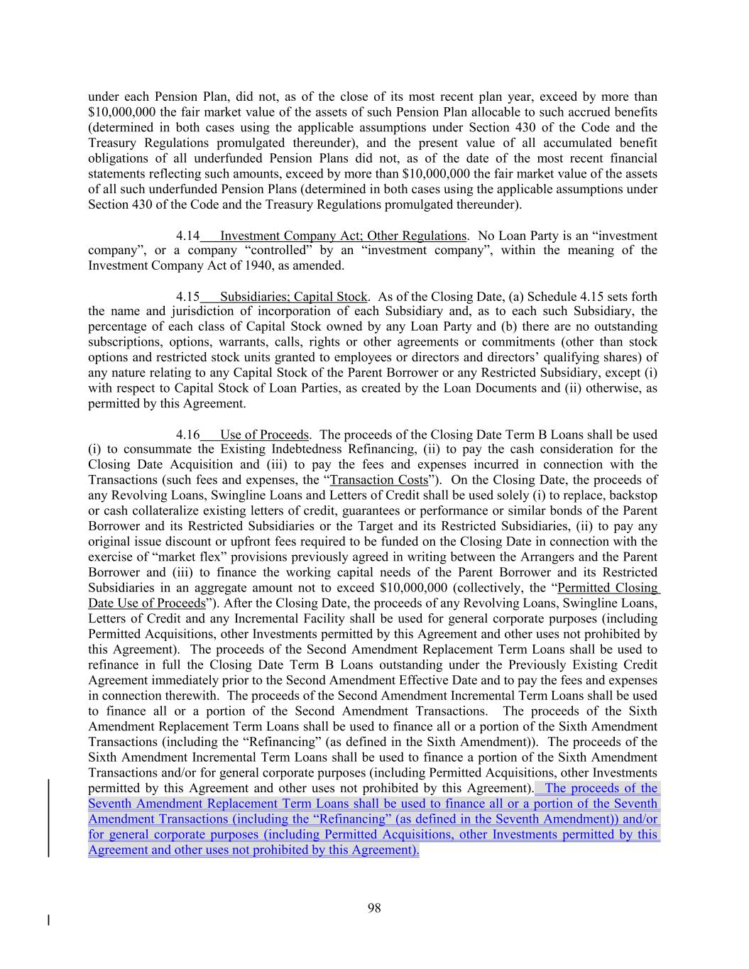 under each Pension Plan, did not, as of the close of its most recent plan year, exceed by more than $10,000,000 the fair market value of the assets of such Pension Plan allocable to such accrued benefits (determined in both cases using the applicable assumptions under Section 430 of the Code and the Treasury Regulations promulgated thereunder), and the present value of all accumulated benefit obligations of all underfunded Pension Plans did not, as of the date of the most recent financial statements reflecting such amounts, exceed by more than $10,000,000 the fair market value of the assets of all such underfunded Pension Plans (determined in both cases using the applicable assumptions under Section 430 of the Code and the Treasury Regulations promulgated thereunder). 4.14 Investment Company Act; Other Regulations. No Loan Party is an “investment company”, or a company “controlled” by an “investment company”, within the meaning of the Investment Company Act of 1940, as amended. 4.15 Subsidiaries; Capital Stock. As of the Closing Date, (a) Schedule 4.15 sets forth the name and jurisdiction of incorporation of each Subsidiary and, as to each such Subsidiary, the percentage of each class of Capital Stock owned by any Loan Party and (b) there are no outstanding subscriptions, options, warrants, calls, rights or other agreements or commitments (other than stock options and restricted stock units granted to employees or directors and directors’ qualifying shares) of any nature relating to any Capital Stock of the Parent Borrower or any Restricted Subsidiary, except (i) with respect to Capital Stock of Loan Parties, as created by the Loan Documents and (ii) otherwise, as permitted by this Agreement. 4.16 Use of Proceeds. The proceeds of the Closing Date Term B Loans shall be used (i) to consummate the Existing Indebtedness Refinancing, (ii) to pay the cash consideration for the Closing Date Acquisition and (iii) to pay the fees and expenses incurred in connection with the Transactions (such fees and expenses, the “Transaction Costs”). On the Closing Date, the proceeds of any Revolving Loans, Swingline Loans and Letters of Credit shall be used solely (i) to replace, backstop or cash collateralize existing letters of credit, guarantees or performance or similar bonds of the Parent Borrower and its Restricted Subsidiaries or the Target and its Restricted Subsidiaries, (ii) to pay any original issue discount or upfront fees required to be funded on the Closing Date in connection with the exercise of “market flex” provisions previously agreed in writing between the Arrangers and the Parent Borrower and (iii) to finance the working capital needs of the Parent Borrower and its Restricted Subsidiaries in an aggregate amount not to exceed $10,000,000 (collectively, the “Permitted Closing Date Use of Proceeds”). After the Closing Date, the proceeds of any Revolving Loans, Swingline Loans, Letters of Credit and any Incremental Facility shall be used for general corporate purposes (including Permitted Acquisitions, other Investments permitted by this Agreement and other uses not prohibited by this Agreement). The proceeds of the Second Amendment Replacement Term Loans shall be used to refinance in full the Closing Date Term B Loans outstanding under the Previously Existing Credit Agreement immediately prior to the Second Amendment Effective Date and to pay the fees and expenses in connection therewith. The proceeds of the Second Amendment Incremental Term Loans shall be used to finance all or a portion of the Second Amendment Transactions. The proceeds of the Sixth Amendment Replacement Term Loans shall be used to finance all or a portion of the Sixth Amendment Transactions (including the “Refinancing” (as defined in the Sixth Amendment)). The proceeds of the Sixth Amendment Incremental Term Loans shall be used to finance a portion of the Sixth Amendment Transactions and/or for general corporate purposes (including Permitted Acquisitions, other Investments permitted by this Agreement and other uses not prohibited by this Agreement). The proceeds of the Seventh Amendment Replacement Term Loans shall be used to finance all or a portion of the Seventh Amendment Transactions (including the “Refinancing” (as defined in the Seventh Amendment)) and/or for general corporate purposes (including Permitted Acquisitions, other Investments permitted by this Agreement and other uses not prohibited by this Agreement). 98
