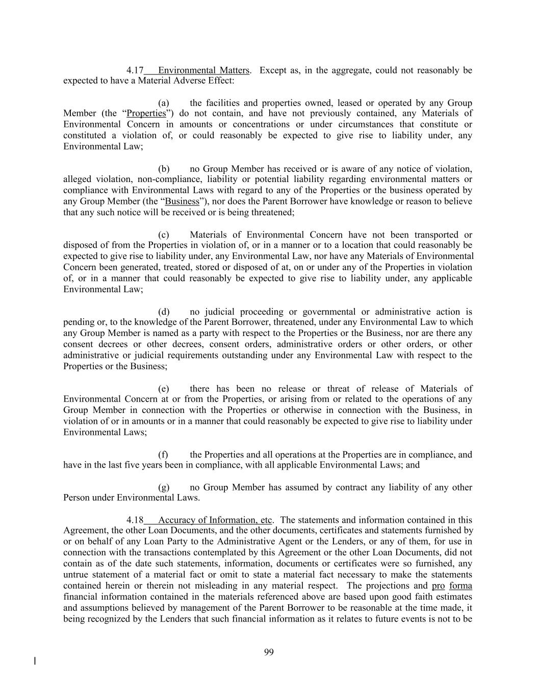 4.17 Environmental Matters. Except as, in the aggregate, could not reasonably be expected to have a Material Adverse Effect: (a) the facilities and properties owned, leased or operated by any Group Member (the “Properties”) do not contain, and have not previously contained, any Materials of Environmental Concern in amounts or concentrations or under circumstances that constitute or constituted a violation of, or could reasonably be expected to give rise to liability under, any Environmental Law; (b) no Group Member has received or is aware of any notice of violation, alleged violation, non-compliance, liability or potential liability regarding environmental matters or compliance with Environmental Laws with regard to any of the Properties or the business operated by any Group Member (the “Business”), nor does the Parent Borrower have knowledge or reason to believe that any such notice will be received or is being threatened; (c) Materials of Environmental Concern have not been transported or disposed of from the Properties in violation of, or in a manner or to a location that could reasonably be expected to give rise to liability under, any Environmental Law, nor have any Materials of Environmental Concern been generated, treated, stored or disposed of at, on or under any of the Properties in violation of, or in a manner that could reasonably be expected to give rise to liability under, any applicable Environmental Law; (d) no judicial proceeding or governmental or administrative action is pending or, to the knowledge of the Parent Borrower, threatened, under any Environmental Law to which any Group Member is named as a party with respect to the Properties or the Business, nor are there any consent decrees or other decrees, consent orders, administrative orders or other orders, or other administrative or judicial requirements outstanding under any Environmental Law with respect to the Properties or the Business; (e) there has been no release or threat of release of Materials of Environmental Concern at or from the Properties, or arising from or related to the operations of any Group Member in connection with the Properties or otherwise in connection with the Business, in violation of or in amounts or in a manner that could reasonably be expected to give rise to liability under Environmental Laws; (f) the Properties and all operations at the Properties are in compliance, and have in the last five years been in compliance, with all applicable Environmental Laws; and (g) no Group Member has assumed by contract any liability of any other Person under Environmental Laws. 4.18 Accuracy of Information, etc. The statements and information contained in this Agreement, the other Loan Documents, and the other documents, certificates and statements furnished by or on behalf of any Loan Party to the Administrative Agent or the Lenders, or any of them, for use in connection with the transactions contemplated by this Agreement or the other Loan Documents, did not contain as of the date such statements, information, documents or certificates were so furnished, any untrue statement of a material fact or omit to state a material fact necessary to make the statements contained herein or therein not misleading in any material respect. The projections and pro forma financial information contained in the materials referenced above are based upon good faith estimates and assumptions believed by management of the Parent Borrower to be reasonable at the time made, it being recognized by the Lenders that such financial information as it relates to future events is not to be 99