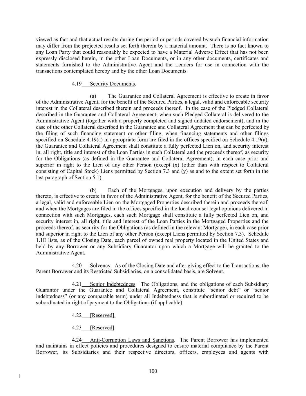 viewed as fact and that actual results during the period or periods covered by such financial information may differ from the projected results set forth therein by a material amount. There is no fact known to any Loan Party that could reasonably be expected to have a Material Adverse Effect that has not been expressly disclosed herein, in the other Loan Documents, or in any other documents, certificates and statements furnished to the Administrative Agent and the Lenders for use in connection with the transactions contemplated hereby and by the other Loan Documents. 4.19 Security Documents. (a) The Guarantee and Collateral Agreement is effective to create in favor of the Administrative Agent, for the benefit of the Secured Parties, a legal, valid and enforceable security interest in the Collateral described therein and proceeds thereof. In the case of the Pledged Collateral described in the Guarantee and Collateral Agreement, when such Pledged Collateral is delivered to the Administrative Agent (together with a properly completed and signed undated endorsement), and in the case of the other Collateral described in the Guarantee and Collateral Agreement that can be perfected by the filing of such financing statement or other filing, when financing statements and other filings specified on Schedule 4.19(a) in appropriate form are filed in the offices specified on Schedule 4.19(a), the Guarantee and Collateral Agreement shall constitute a fully perfected Lien on, and security interest in, all right, title and interest of the Loan Parties in such Collateral and the proceeds thereof, as security for the Obligations (as defined in the Guarantee and Collateral Agreement), in each case prior and superior in right to the Lien of any other Person (except (x) (other than with respect to Collateral consisting of Capital Stock) Liens permitted by Section 7.3 and (y) as and to the extent set forth in the last paragraph of Section 5.1). (b) Each of the Mortgages, upon execution and delivery by the parties thereto, is effective to create in favor of the Administrative Agent, for the benefit of the Secured Parties, a legal, valid and enforceable Lien on the Mortgaged Properties described therein and proceeds thereof, and when the Mortgages are filed in the offices specified in the local counsel legal opinions delivered in connection with such Mortgages, each such Mortgage shall constitute a fully perfected Lien on, and security interest in, all right, title and interest of the Loan Parties in the Mortgaged Properties and the proceeds thereof, as security for the Obligations (as defined in the relevant Mortgage), in each case prior and superior in right to the Lien of any other Person (except Liens permitted by Section 7.3). Schedule 1.1E lists, as of the Closing Date, each parcel of owned real property located in the United States and held by any Borrower or any Subsidiary Guarantor upon which a Mortgage will be granted to the Administrative Agent. 4.20 Solvency. As of the Closing Date and after giving effect to the Transactions, the Parent Borrower and its Restricted Subsidiaries, on a consolidated basis, are Solvent. 4.21 Senior Indebtedness. The Obligations, and the obligations of each Subsidiary Guarantor under the Guarantee and Collateral Agreement, constitute “senior debt” or “senior indebtedness” (or any comparable term) under all Indebtedness that is subordinated or required to be subordinated in right of payment to the Obligations (if applicable). 4.22 [Reserved]. 4.23 [Reserved]. 4.24 Anti-Corruption Laws and Sanctions. The Parent Borrower has implemented and maintains in effect policies and procedures designed to ensure material compliance by the Parent Borrower, its Subsidiaries and their respective directors, officers, employees and agents with 100