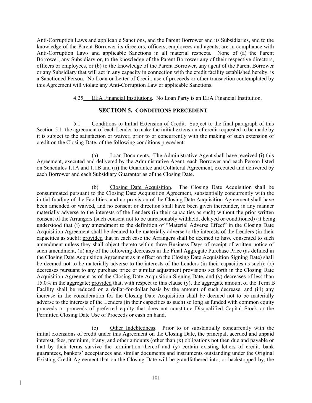 Anti-Corruption Laws and applicable Sanctions, and the Parent Borrower and its Subsidiaries, and to the knowledge of the Parent Borrower its directors, officers, employees and agents, are in compliance with Anti-Corruption Laws and applicable Sanctions in all material respects. None of (a) the Parent Borrower, any Subsidiary or, to the knowledge of the Parent Borrower any of their respective directors, officers or employees, or (b) to the knowledge of the Parent Borrower, any agent of the Parent Borrower or any Subsidiary that will act in any capacity in connection with the credit facility established hereby, is a Sanctioned Person. No Loan or Letter of Credit, use of proceeds or other transaction contemplated by this Agreement will violate any Anti-Corruption Law or applicable Sanctions. 4.25 EEA Financial Institutions. No Loan Party is an EEA Financial Institution. SECTION 5. CONDITIONS PRECEDENT 5.1 Conditions to Initial Extension of Credit. Subject to the final paragraph of this Section 5.1, the agreement of each Lender to make the initial extension of credit requested to be made by it is subject to the satisfaction or waiver, prior to or concurrently with the making of such extension of credit on the Closing Date, of the following conditions precedent: (a) Loan Documents. The Administrative Agent shall have received (i) this Agreement, executed and delivered by the Administrative Agent, each Borrower and each Person listed on Schedules 1.1A and 1.1B and (ii) the Guarantee and Collateral Agreement, executed and delivered by each Borrower and each Subsidiary Guarantor as of the Closing Date. (b) Closing Date Acquisition. The Closing Date Acquisition shall be consummated pursuant to the Closing Date Acquisition Agreement, substantially concurrently with the initial funding of the Facilities, and no provision of the Closing Date Acquisition Agreement shall have been amended or waived, and no consent or direction shall have been given thereunder, in any manner materially adverse to the interests of the Lenders (in their capacities as such) without the prior written consent of the Arrangers (such consent not to be unreasonably withheld, delayed or conditioned) (it being understood that (i) any amendment to the definition of “Material Adverse Effect” in the Closing Date Acquisition Agreement shall be deemed to be materially adverse to the interests of the Lenders (in their capacities as such); provided that in each case the Arrangers shall be deemed to have consented to such amendment unless they shall object thereto within three Business Days of receipt of written notice of such amendment, (ii) any of the following decreases in the Final Aggregate Purchase Price (as defined in the Closing Date Acquisition Agreement as in effect on the Closing Date Acquisition Signing Date) shall be deemed not to be materially adverse to the interests of the Lenders (in their capacities as such): (x) decreases pursuant to any purchase price or similar adjustment provisions set forth in the Closing Date Acquisition Agreement as of the Closing Date Acquisition Signing Date, and (y) decreases of less than 15.0% in the aggregate; provided that, with respect to this clause (y), the aggregate amount of the Term B Facility shall be reduced on a dollar-for-dollar basis by the amount of such decrease, and (iii) any increase in the consideration for the Closing Date Acquisition shall be deemed not to be materially adverse to the interests of the Lenders (in their capacities as such) so long as funded with common equity proceeds or proceeds of preferred equity that does not constitute Disqualified Capital Stock or the Permitted Closing Date Use of Proceeds or cash on hand. (c) Other Indebtedness. Prior to or substantially concurrently with the initial extensions of credit under this Agreement on the Closing Date, the principal, accrued and unpaid interest, fees, premium, if any, and other amounts (other than (x) obligations not then due and payable or that by their terms survive the termination thereof and (y) certain existing letters of credit, bank guarantees, bankers’ acceptances and similar documents and instruments outstanding under the Original Existing Credit Agreement that on the Closing Date will be grandfathered into, or backstopped by, the 101