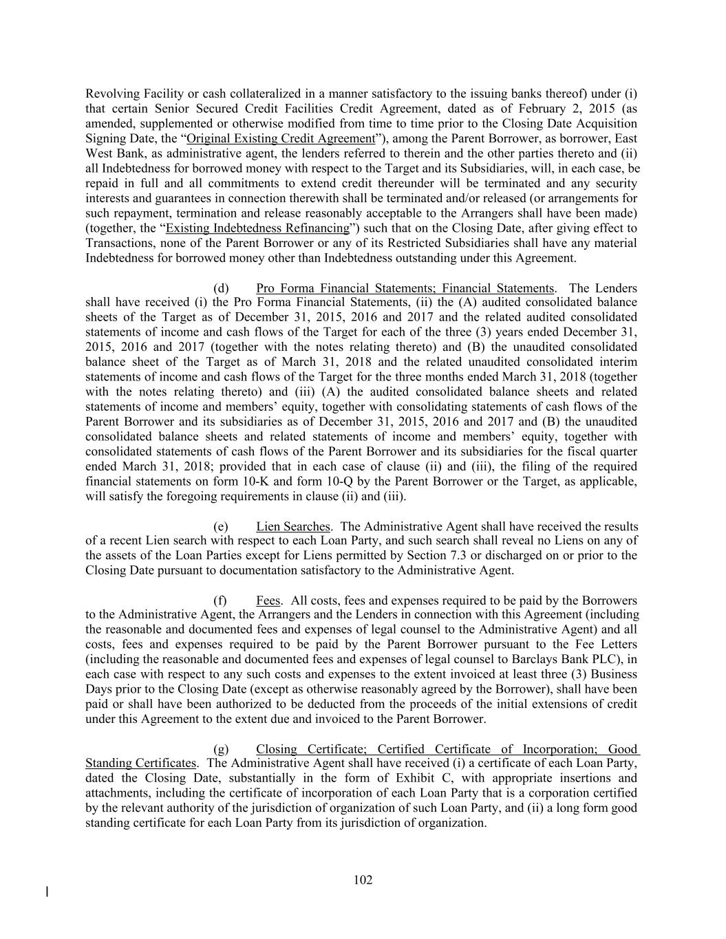 Revolving Facility or cash collateralized in a manner satisfactory to the issuing banks thereof) under (i) that certain Senior Secured Credit Facilities Credit Agreement, dated as of February 2, 2015 (as amended, supplemented or otherwise modified from time to time prior to the Closing Date Acquisition Signing Date, the “Original Existing Credit Agreement”), among the Parent Borrower, as borrower, East West Bank, as administrative agent, the lenders referred to therein and the other parties thereto and (ii) all Indebtedness for borrowed money with respect to the Target and its Subsidiaries, will, in each case, be repaid in full and all commitments to extend credit thereunder will be terminated and any security interests and guarantees in connection therewith shall be terminated and/or released (or arrangements for such repayment, termination and release reasonably acceptable to the Arrangers shall have been made) (together, the “Existing Indebtedness Refinancing”) such that on the Closing Date, after giving effect to Transactions, none of the Parent Borrower or any of its Restricted Subsidiaries shall have any material Indebtedness for borrowed money other than Indebtedness outstanding under this Agreement. (d) Pro Forma Financial Statements; Financial Statements. The Lenders shall have received (i) the Pro Forma Financial Statements, (ii) the (A) audited consolidated balance sheets of the Target as of December 31, 2015, 2016 and 2017 and the related audited consolidated statements of income and cash flows of the Target for each of the three (3) years ended December 31, 2015, 2016 and 2017 (together with the notes relating thereto) and (B) the unaudited consolidated balance sheet of the Target as of March 31, 2018 and the related unaudited consolidated interim statements of income and cash flows of the Target for the three months ended March 31, 2018 (together with the notes relating thereto) and (iii) (A) the audited consolidated balance sheets and related statements of income and members’ equity, together with consolidating statements of cash flows of the Parent Borrower and its subsidiaries as of December 31, 2015, 2016 and 2017 and (B) the unaudited consolidated balance sheets and related statements of income and members’ equity, together with consolidated statements of cash flows of the Parent Borrower and its subsidiaries for the fiscal quarter ended March 31, 2018; provided that in each case of clause (ii) and (iii), the filing of the required financial statements on form 10-K and form 10-Q by the Parent Borrower or the Target, as applicable, will satisfy the foregoing requirements in clause (ii) and (iii). (e) Lien Searches. The Administrative Agent shall have received the results of a recent Lien search with respect to each Loan Party, and such search shall reveal no Liens on any of the assets of the Loan Parties except for Liens permitted by Section 7.3 or discharged on or prior to the Closing Date pursuant to documentation satisfactory to the Administrative Agent. (f) Fees. All costs, fees and expenses required to be paid by the Borrowers to the Administrative Agent, the Arrangers and the Lenders in connection with this Agreement (including the reasonable and documented fees and expenses of legal counsel to the Administrative Agent) and all costs, fees and expenses required to be paid by the Parent Borrower pursuant to the Fee Letters (including the reasonable and documented fees and expenses of legal counsel to Barclays Bank PLC), in each case with respect to any such costs and expenses to the extent invoiced at least three (3) Business Days prior to the Closing Date (except as otherwise reasonably agreed by the Borrower), shall have been paid or shall have been authorized to be deducted from the proceeds of the initial extensions of credit under this Agreement to the extent due and invoiced to the Parent Borrower. (g) Closing Certificate; Certified Certificate of Incorporation; Good Standing Certificates. The Administrative Agent shall have received (i) a certificate of each Loan Party, dated the Closing Date, substantially in the form of Exhibit C, with appropriate insertions and attachments, including the certificate of incorporation of each Loan Party that is a corporation certified by the relevant authority of the jurisdiction of organization of such Loan Party, and (ii) a long form good standing certificate for each Loan Party from its jurisdiction of organization. 102