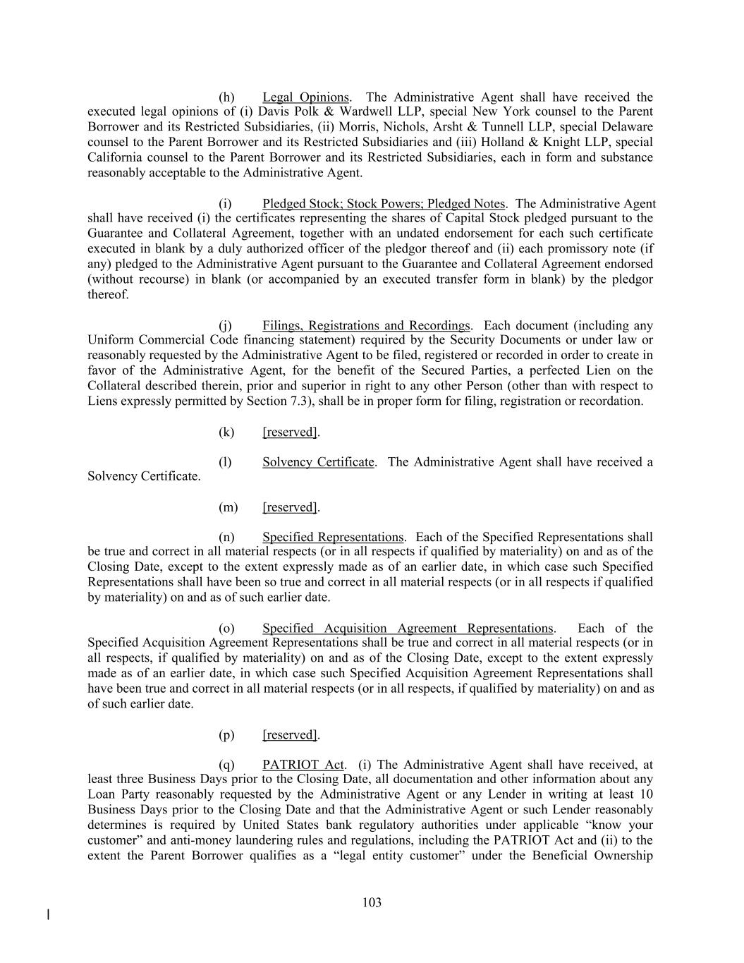 (h) Legal Opinions. The Administrative Agent shall have received the executed legal opinions of (i) Davis Polk & Wardwell LLP, special New York counsel to the Parent Borrower and its Restricted Subsidiaries, (ii) Morris, Nichols, Arsht & Tunnell LLP, special Delaware counsel to the Parent Borrower and its Restricted Subsidiaries and (iii) Holland & Knight LLP, special California counsel to the Parent Borrower and its Restricted Subsidiaries, each in form and substance reasonably acceptable to the Administrative Agent. (i) Pledged Stock; Stock Powers; Pledged Notes. The Administrative Agent shall have received (i) the certificates representing the shares of Capital Stock pledged pursuant to the Guarantee and Collateral Agreement, together with an undated endorsement for each such certificate executed in blank by a duly authorized officer of the pledgor thereof and (ii) each promissory note (if any) pledged to the Administrative Agent pursuant to the Guarantee and Collateral Agreement endorsed (without recourse) in blank (or accompanied by an executed transfer form in blank) by the pledgor thereof. (j) Filings, Registrations and Recordings. Each document (including any Uniform Commercial Code financing statement) required by the Security Documents or under law or reasonably requested by the Administrative Agent to be filed, registered or recorded in order to create in favor of the Administrative Agent, for the benefit of the Secured Parties, a perfected Lien on the Collateral described therein, prior and superior in right to any other Person (other than with respect to Liens expressly permitted by Section 7.3), shall be in proper form for filing, registration or recordation. (k) [reserved]. (l) Solvency Certificate. The Administrative Agent shall have received a Solvency Certificate. (m) [reserved]. (n) Specified Representations. Each of the Specified Representations shall be true and correct in all material respects (or in all respects if qualified by materiality) on and as of the Closing Date, except to the extent expressly made as of an earlier date, in which case such Specified Representations shall have been so true and correct in all material respects (or in all respects if qualified by materiality) on and as of such earlier date. (o) Specified Acquisition Agreement Representations. Each of the Specified Acquisition Agreement Representations shall be true and correct in all material respects (or in all respects, if qualified by materiality) on and as of the Closing Date, except to the extent expressly made as of an earlier date, in which case such Specified Acquisition Agreement Representations shall have been true and correct in all material respects (or in all respects, if qualified by materiality) on and as of such earlier date. (p) [reserved]. (q) PATRIOT Act. (i) The Administrative Agent shall have received, at least three Business Days prior to the Closing Date, all documentation and other information about any Loan Party reasonably requested by the Administrative Agent or any Lender in writing at least 10 Business Days prior to the Closing Date and that the Administrative Agent or such Lender reasonably determines is required by United States bank regulatory authorities under applicable “know your customer” and anti-money laundering rules and regulations, including the PATRIOT Act and (ii) to the extent the Parent Borrower qualifies as a “legal entity customer” under the Beneficial Ownership 103