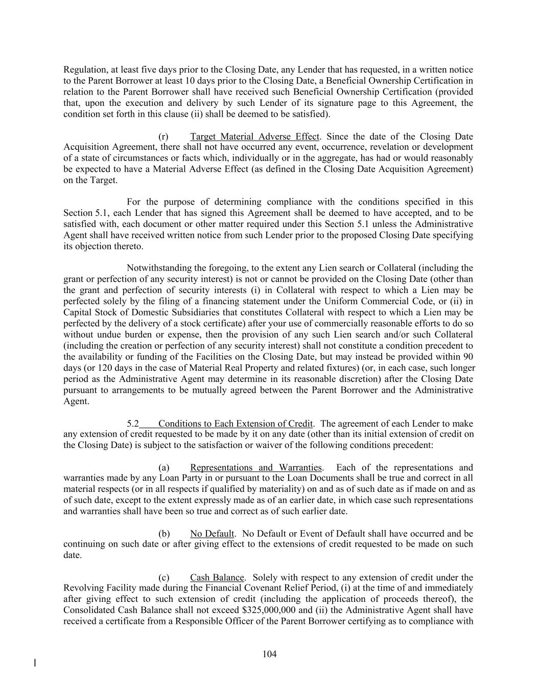 Regulation, at least five days prior to the Closing Date, any Lender that has requested, in a written notice to the Parent Borrower at least 10 days prior to the Closing Date, a Beneficial Ownership Certification in relation to the Parent Borrower shall have received such Beneficial Ownership Certification (provided that, upon the execution and delivery by such Lender of its signature page to this Agreement, the condition set forth in this clause (ii) shall be deemed to be satisfied). (r) Target Material Adverse Effect. Since the date of the Closing Date Acquisition Agreement, there shall not have occurred any event, occurrence, revelation or development of a state of circumstances or facts which, individually or in the aggregate, has had or would reasonably be expected to have a Material Adverse Effect (as defined in the Closing Date Acquisition Agreement) on the Target. For the purpose of determining compliance with the conditions specified in this Section 5.1, each Lender that has signed this Agreement shall be deemed to have accepted, and to be satisfied with, each document or other matter required under this Section 5.1 unless the Administrative Agent shall have received written notice from such Lender prior to the proposed Closing Date specifying its objection thereto. Notwithstanding the foregoing, to the extent any Lien search or Collateral (including the grant or perfection of any security interest) is not or cannot be provided on the Closing Date (other than the grant and perfection of security interests (i) in Collateral with respect to which a Lien may be perfected solely by the filing of a financing statement under the Uniform Commercial Code, or (ii) in Capital Stock of Domestic Subsidiaries that constitutes Collateral with respect to which a Lien may be perfected by the delivery of a stock certificate) after your use of commercially reasonable efforts to do so without undue burden or expense, then the provision of any such Lien search and/or such Collateral (including the creation or perfection of any security interest) shall not constitute a condition precedent to the availability or funding of the Facilities on the Closing Date, but may instead be provided within 90 days (or 120 days in the case of Material Real Property and related fixtures) (or, in each case, such longer period as the Administrative Agent may determine in its reasonable discretion) after the Closing Date pursuant to arrangements to be mutually agreed between the Parent Borrower and the Administrative Agent. 5.2 Conditions to Each Extension of Credit. The agreement of each Lender to make any extension of credit requested to be made by it on any date (other than its initial extension of credit on the Closing Date) is subject to the satisfaction or waiver of the following conditions precedent: (a) Representations and Warranties. Each of the representations and warranties made by any Loan Party in or pursuant to the Loan Documents shall be true and correct in all material respects (or in all respects if qualified by materiality) on and as of such date as if made on and as of such date, except to the extent expressly made as of an earlier date, in which case such representations and warranties shall have been so true and correct as of such earlier date. (b) No Default. No Default or Event of Default shall have occurred and be continuing on such date or after giving effect to the extensions of credit requested to be made on such date. (c) Cash Balance. Solely with respect to any extension of credit under the Revolving Facility made during the Financial Covenant Relief Period, (i) at the time of and immediately after giving effect to such extension of credit (including the application of proceeds thereof), the Consolidated Cash Balance shall not exceed $325,000,000 and (ii) the Administrative Agent shall have received a certificate from a Responsible Officer of the Parent Borrower certifying as to compliance with 104