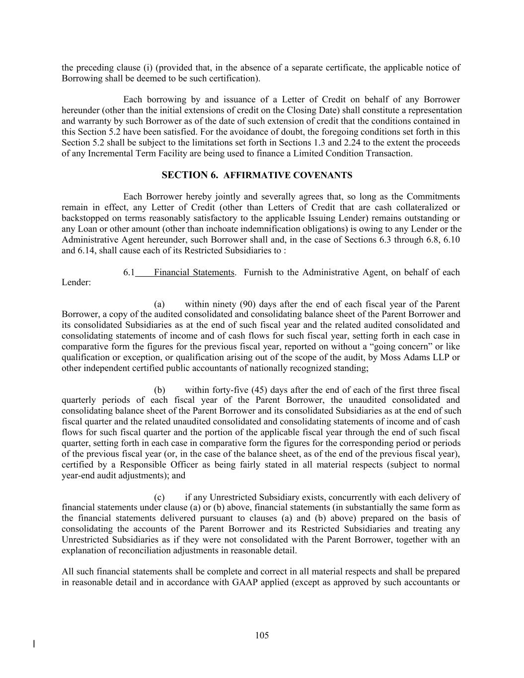 the preceding clause (i) (provided that, in the absence of a separate certificate, the applicable notice of Borrowing shall be deemed to be such certification). Each borrowing by and issuance of a Letter of Credit on behalf of any Borrower hereunder (other than the initial extensions of credit on the Closing Date) shall constitute a representation and warranty by such Borrower as of the date of such extension of credit that the conditions contained in this Section 5.2 have been satisfied. For the avoidance of doubt, the foregoing conditions set forth in this Section 5.2 shall be subject to the limitations set forth in Sections 1.3 and 2.24 to the extent the proceeds of any Incremental Term Facility are being used to finance a Limited Condition Transaction. SECTION 6. AFFIRMATIVE COVENANTS Each Borrower hereby jointly and severally agrees that, so long as the Commitments remain in effect, any Letter of Credit (other than Letters of Credit that are cash collateralized or backstopped on terms reasonably satisfactory to the applicable Issuing Lender) remains outstanding or any Loan or other amount (other than inchoate indemnification obligations) is owing to any Lender or the Administrative Agent hereunder, such Borrower shall and, in the case of Sections 6.3 through 6.8, 6.10 and 6.14, shall cause each of its Restricted Subsidiaries to : 6.1 Financial Statements. Furnish to the Administrative Agent, on behalf of each Lender: (a) within ninety (90) days after the end of each fiscal year of the Parent Borrower, a copy of the audited consolidated and consolidating balance sheet of the Parent Borrower and its consolidated Subsidiaries as at the end of such fiscal year and the related audited consolidated and consolidating statements of income and of cash flows for such fiscal year, setting forth in each case in comparative form the figures for the previous fiscal year, reported on without a “going concern” or like qualification or exception, or qualification arising out of the scope of the audit, by Moss Adams LLP or other independent certified public accountants of nationally recognized standing; (b) within forty-five (45) days after the end of each of the first three fiscal quarterly periods of each fiscal year of the Parent Borrower, the unaudited consolidated and consolidating balance sheet of the Parent Borrower and its consolidated Subsidiaries as at the end of such fiscal quarter and the related unaudited consolidated and consolidating statements of income and of cash flows for such fiscal quarter and the portion of the applicable fiscal year through the end of such fiscal quarter, setting forth in each case in comparative form the figures for the corresponding period or periods of the previous fiscal year (or, in the case of the balance sheet, as of the end of the previous fiscal year), certified by a Responsible Officer as being fairly stated in all material respects (subject to normal year-end audit adjustments); and (c) if any Unrestricted Subsidiary exists, concurrently with each delivery of financial statements under clause (a) or (b) above, financial statements (in substantially the same form as the financial statements delivered pursuant to clauses (a) and (b) above) prepared on the basis of consolidating the accounts of the Parent Borrower and its Restricted Subsidiaries and treating any Unrestricted Subsidiaries as if they were not consolidated with the Parent Borrower, together with an explanation of reconciliation adjustments in reasonable detail. All such financial statements shall be complete and correct in all material respects and shall be prepared in reasonable detail and in accordance with GAAP applied (except as approved by such accountants or 105